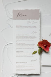 Flying Rabbit Press delivered an invitation suite with feathery torn edges that added a touch of softness and sophistication to the celebration. They continued the neutral color scheme through carefully designed and hand-printed wedding stationery elements featuring eloquent script fonts paired with a simple sans-serif.