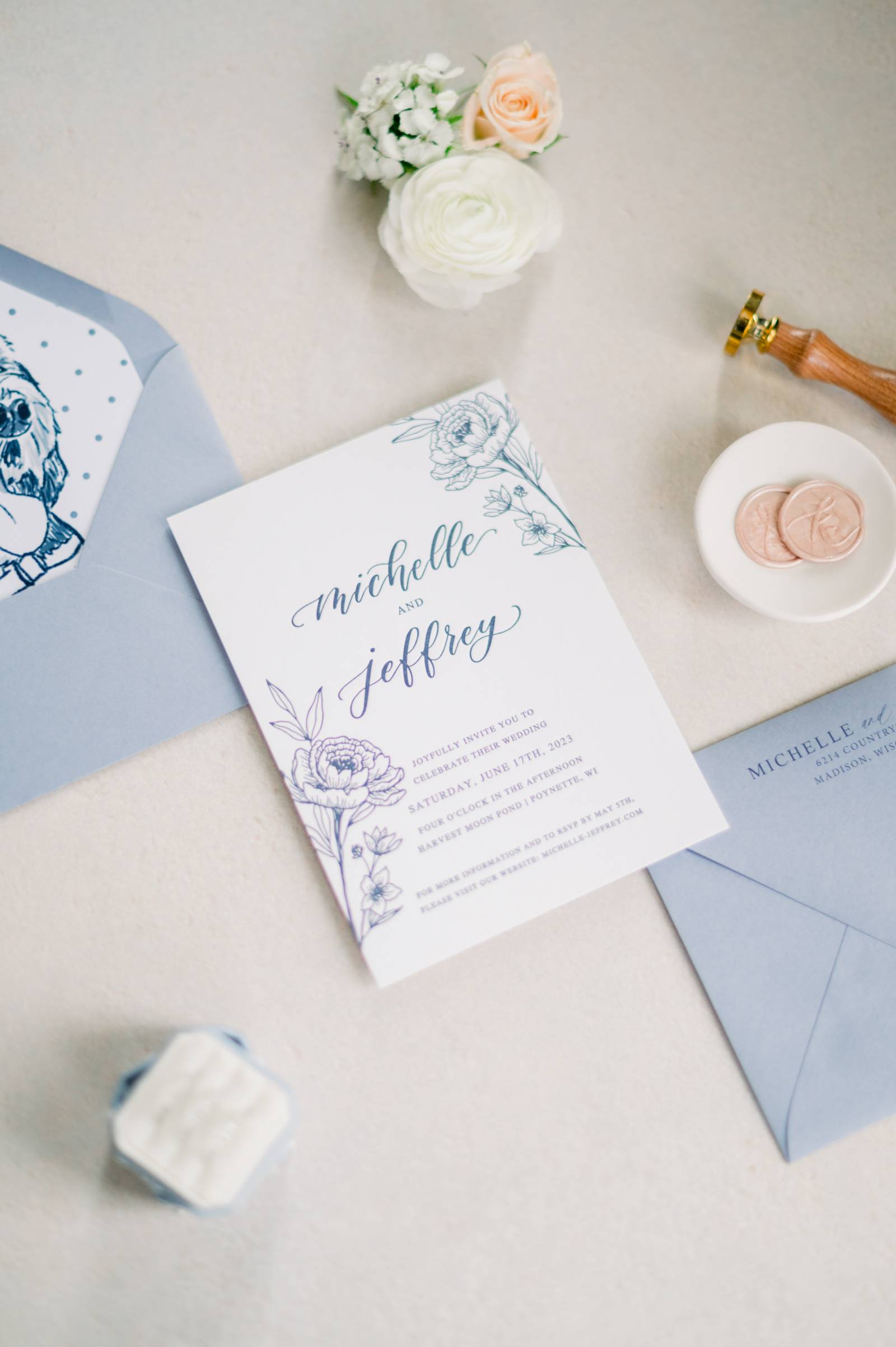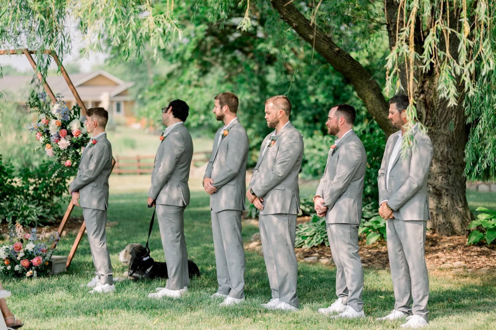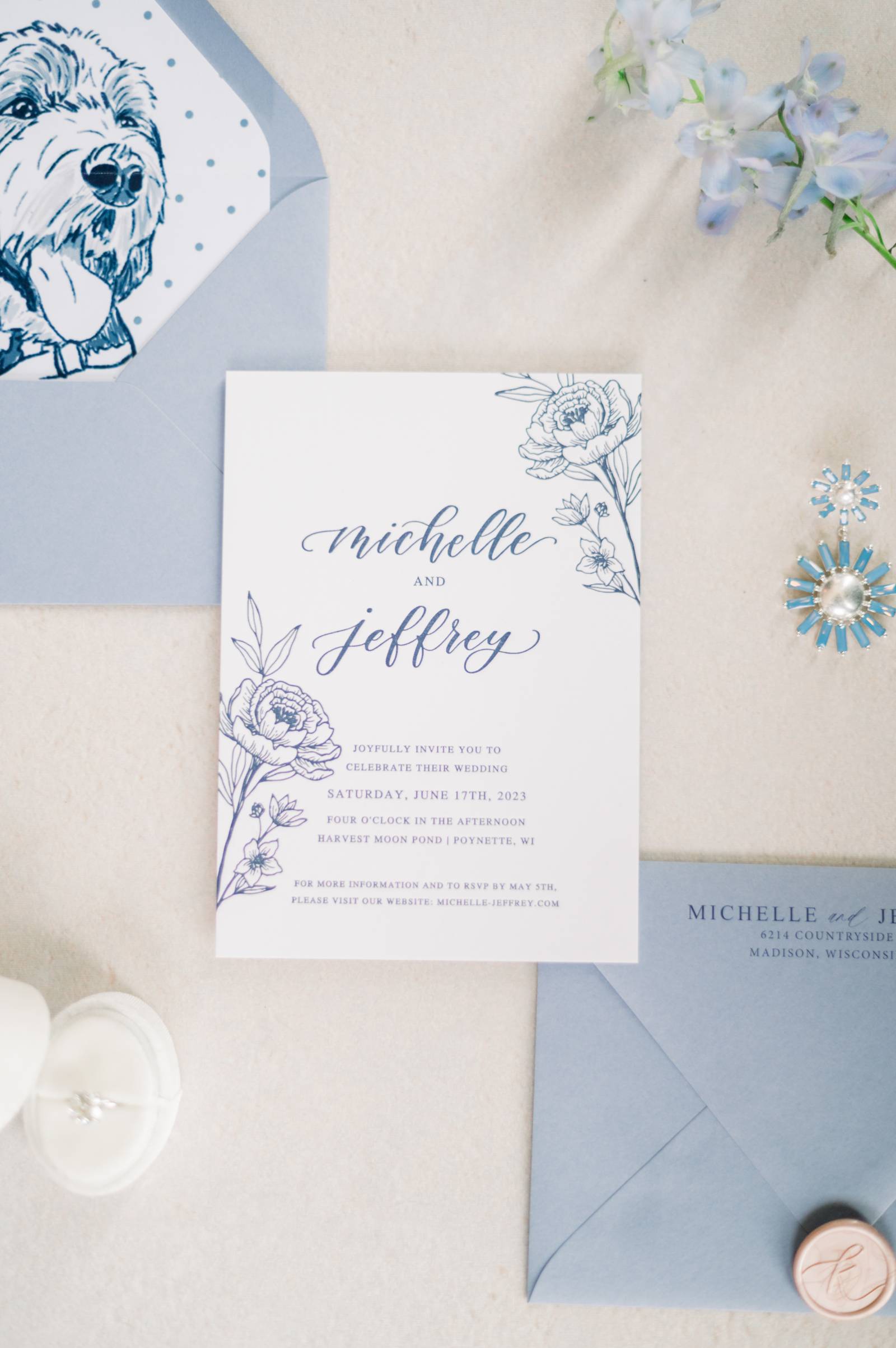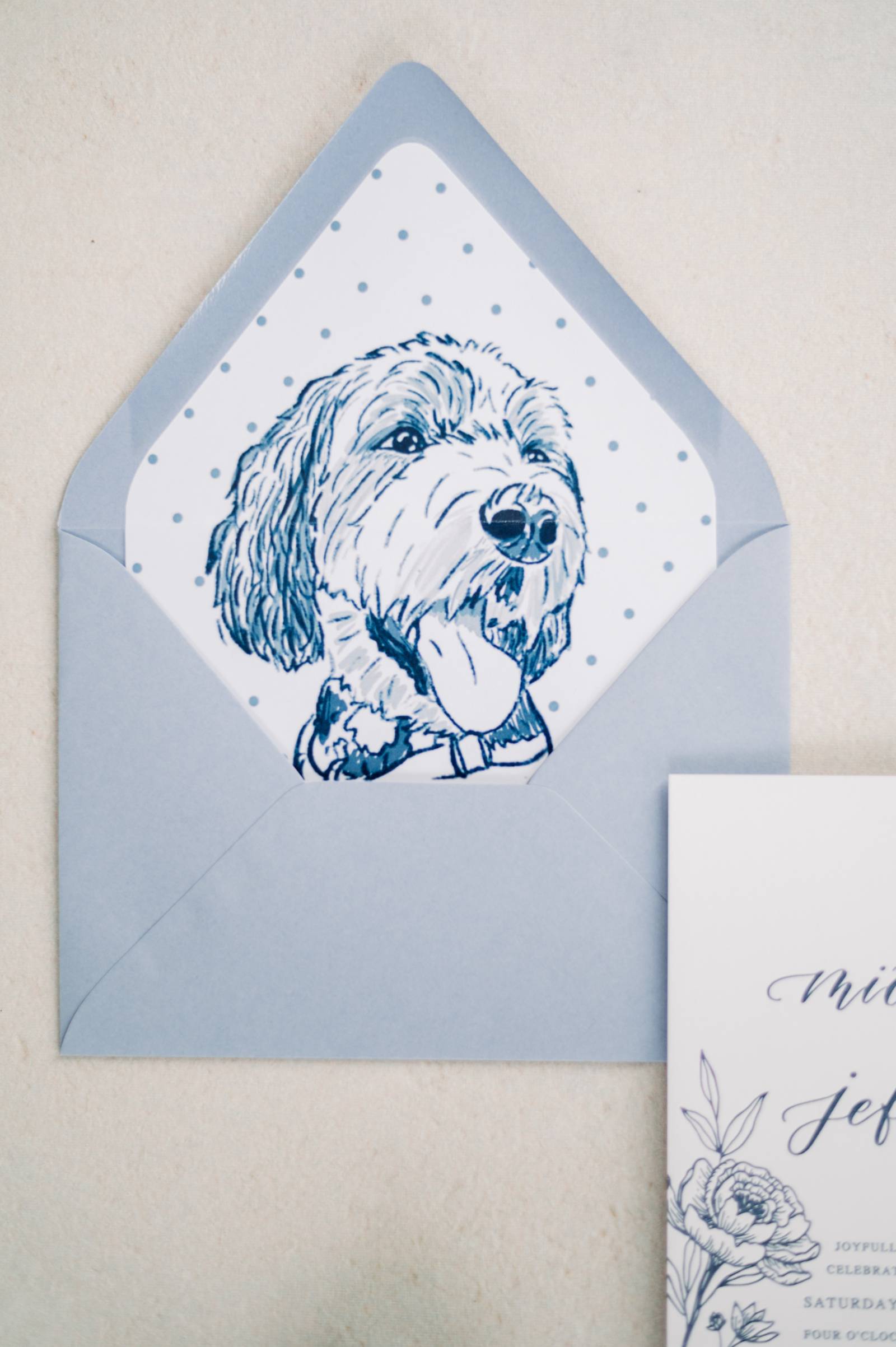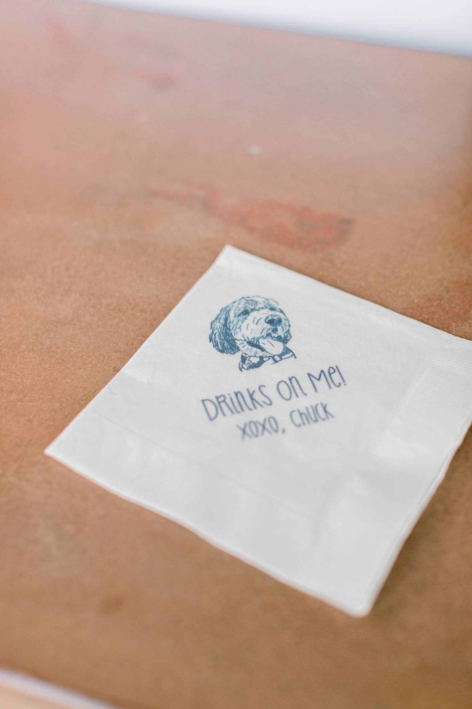- Their Bernadoodle, Chuck, making an appearance on the envelope liners of their invitations, on their custom cocktail napkins, and as their Ring Pup during their ceremony