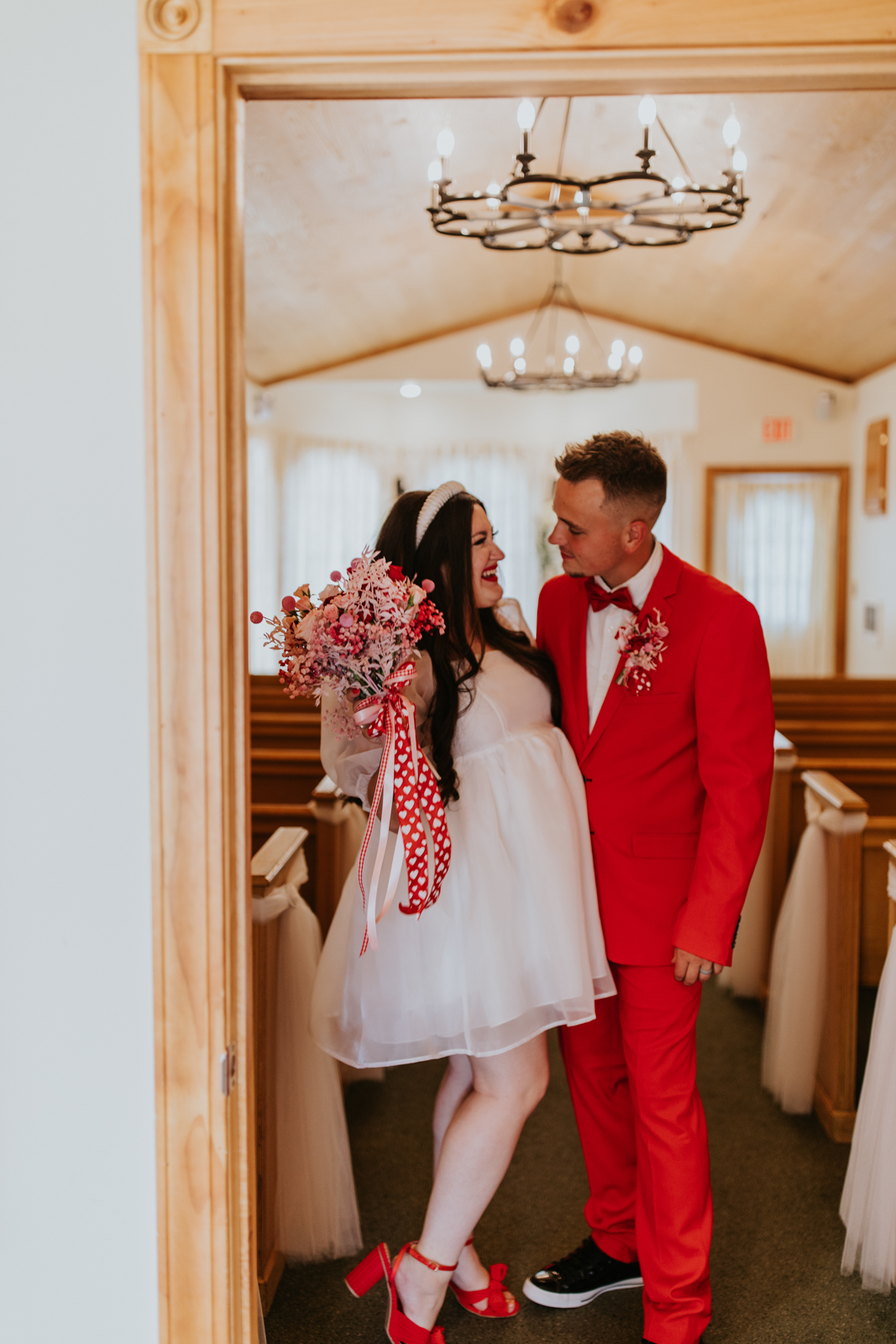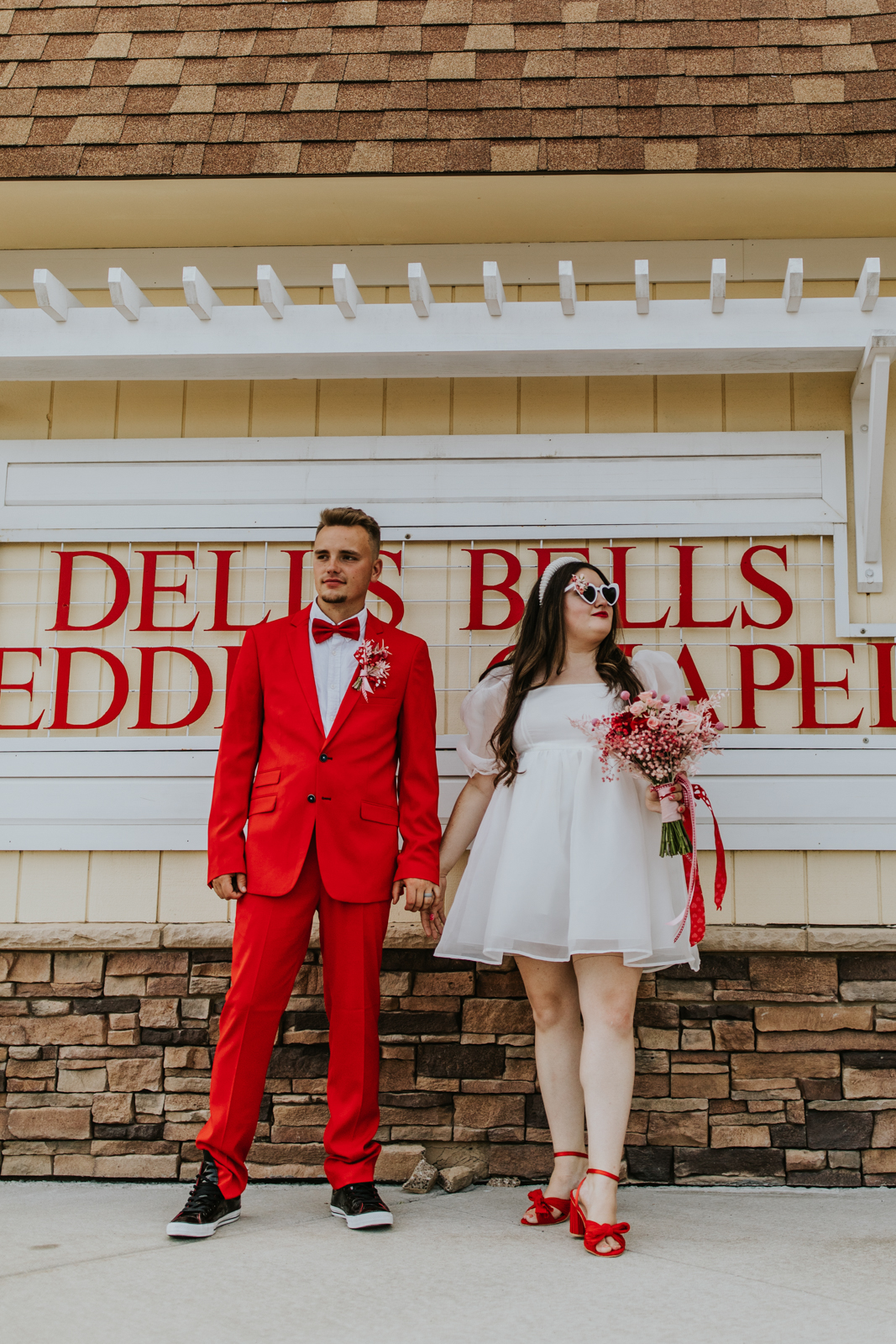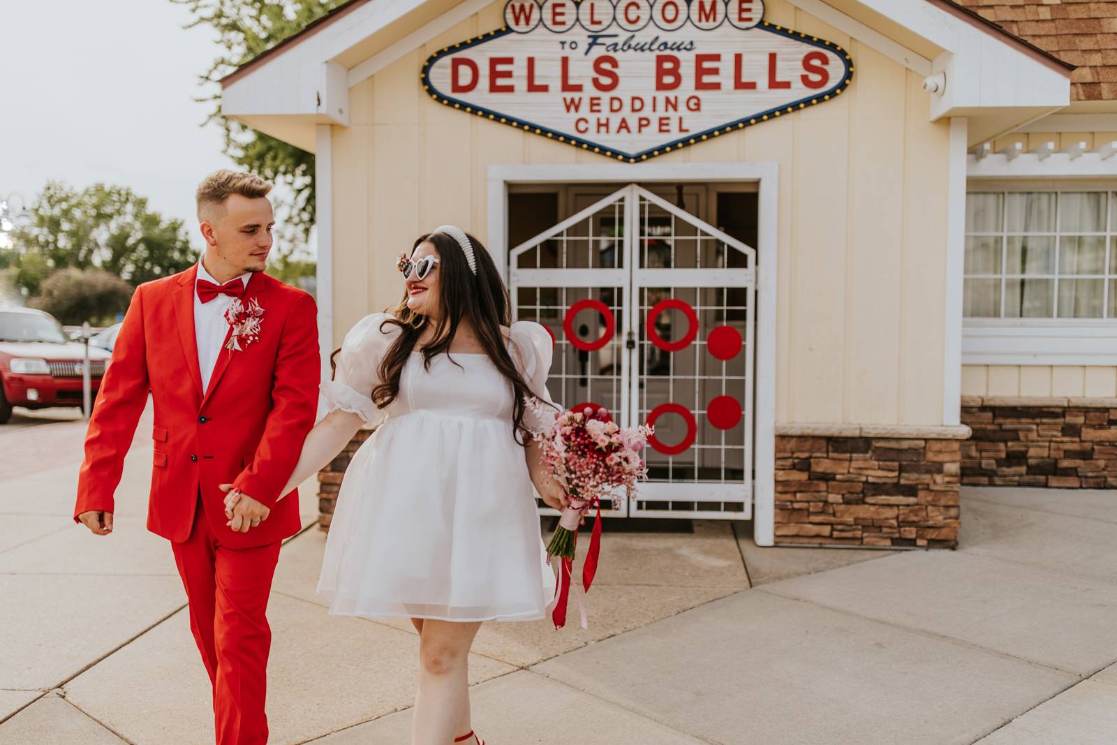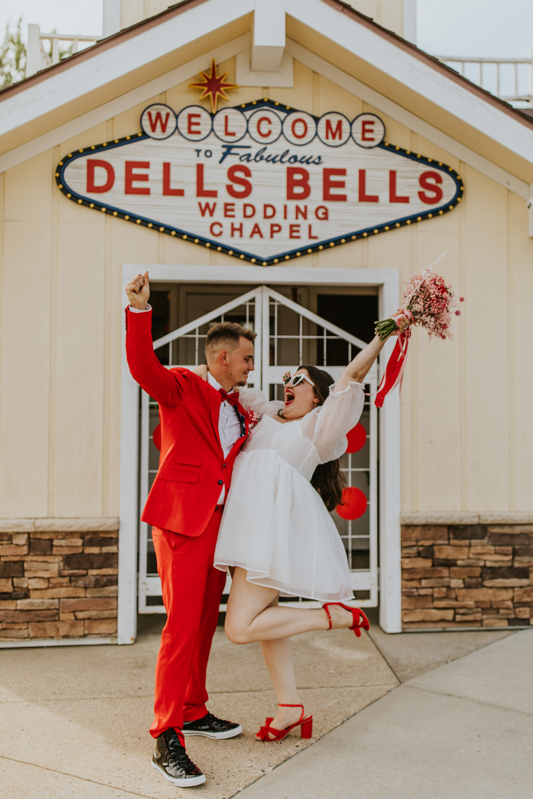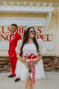 Our groom confidently rocked a vibrant red suit from Men’s Wearhouse, paying homage to the classic 1950s style, but with a colorfully modern twist. His daring choice showcased a fusion of classic sophistication and Vegas-style vibrancy. Beside him, our bride channeled retro elegance with a short, contemporary-chic dress featuring playful puff sleeves. Her striking, pleated red heels were the perfect pop of color for her ensemble – a delightful coordination with her new spouse’s vivid attire!
