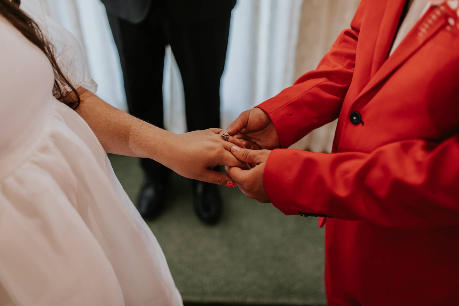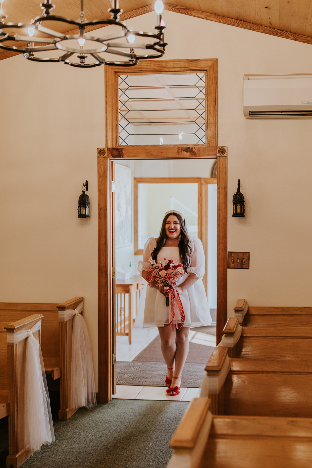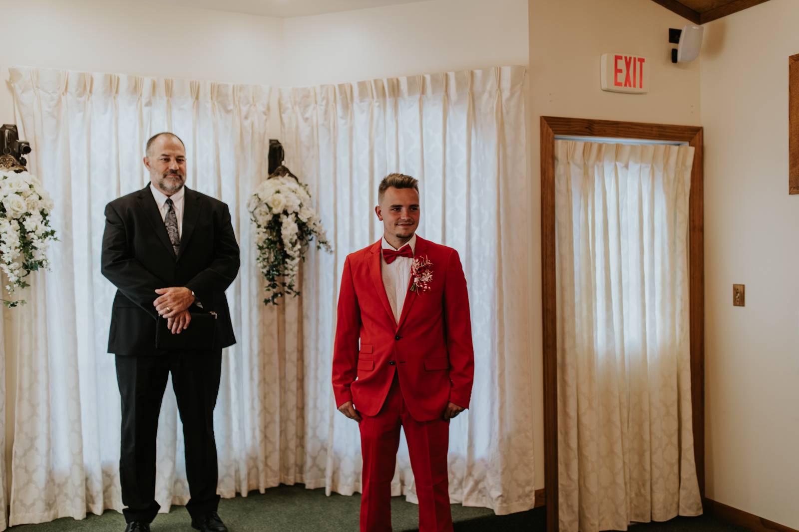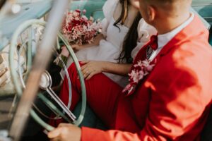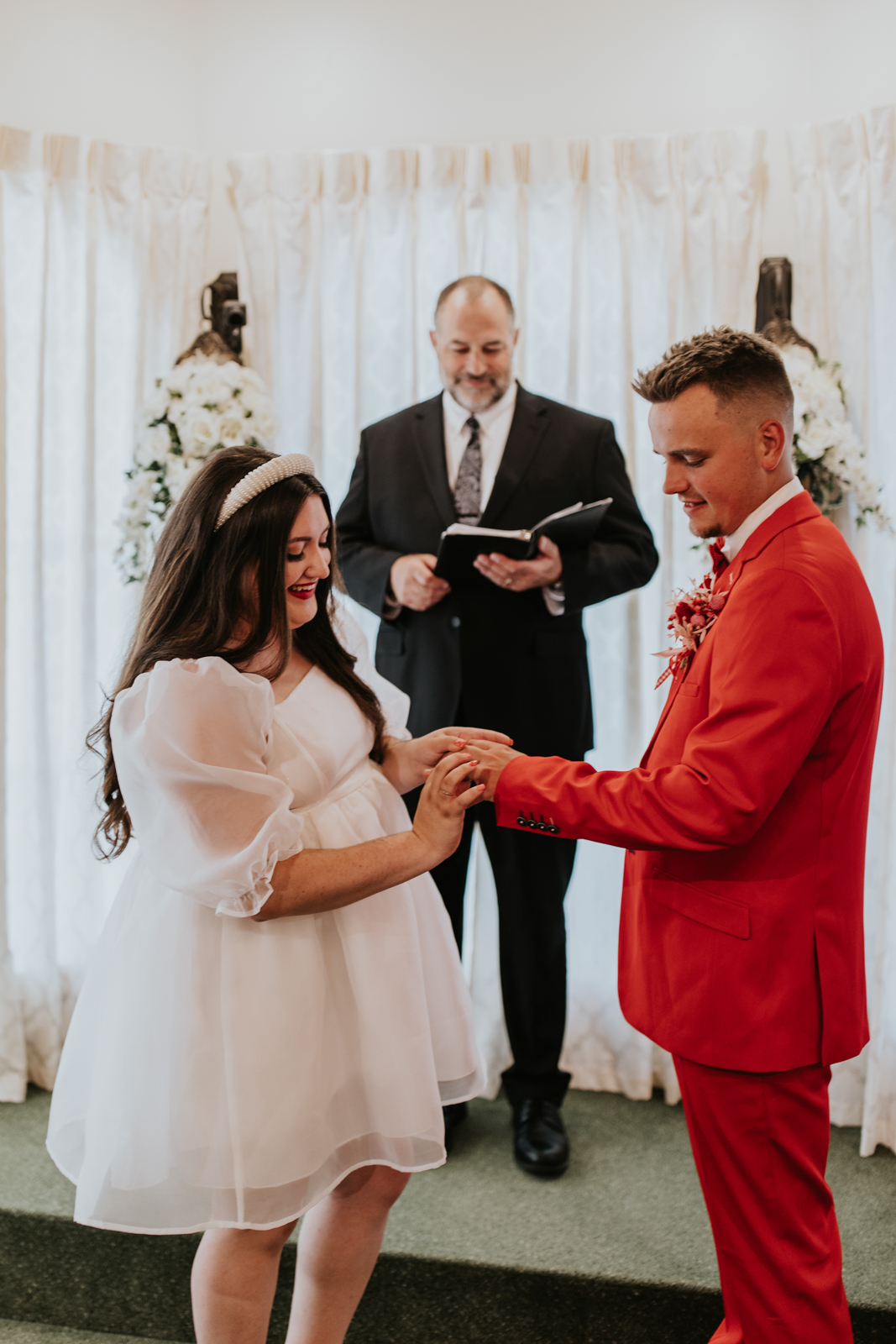 Our groom confidently rocked a vibrant red suit from Men’s Wearhouse, paying homage to the classic 1950s style, but with a colorfully modern twist. His daring choice showcased a fusion of classic sophistication and Vegas-style vibrancy. Beside him, our bride channeled retro elegance with a short, contemporary-chic dress featuring playful puff sleeves. Her striking, pleated red heels were the perfect pop of color for her ensemble – a delightful coordination with her new spouse’s vivid attire!