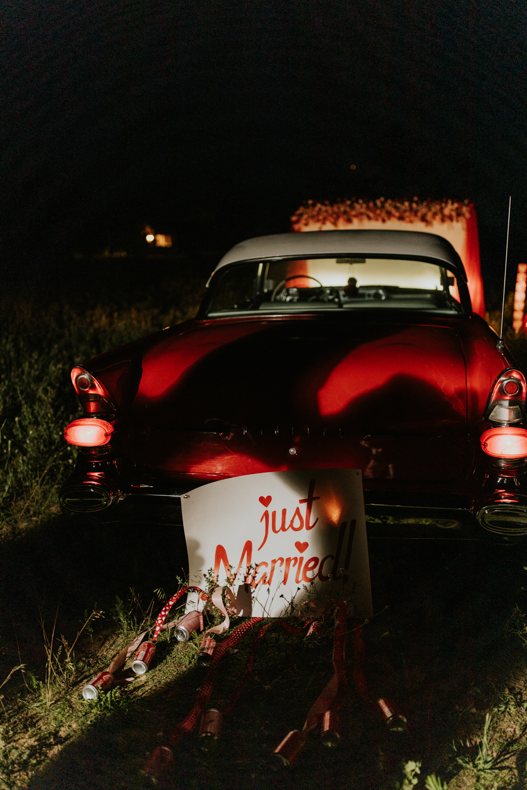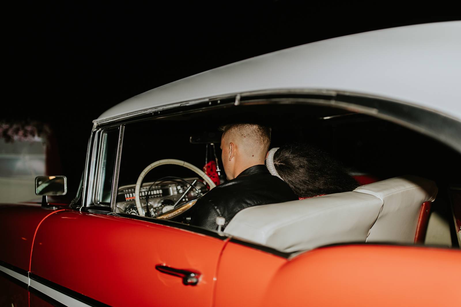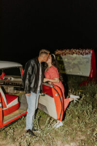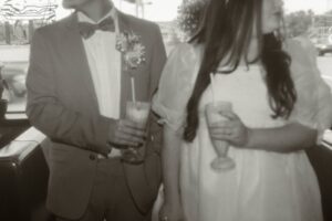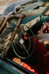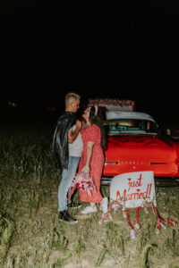 Every ’50s-inspired elopement needs an afterparty! Melody Rose Designs provided the inspiration for the floral and rental decor, transforming this wedding reception into a captivating retro drive-in movie scene. With creative floral arrangements and an abundance of carefully curated rental items, this celebration was a cinematic experience filled with vintage allure and romance.