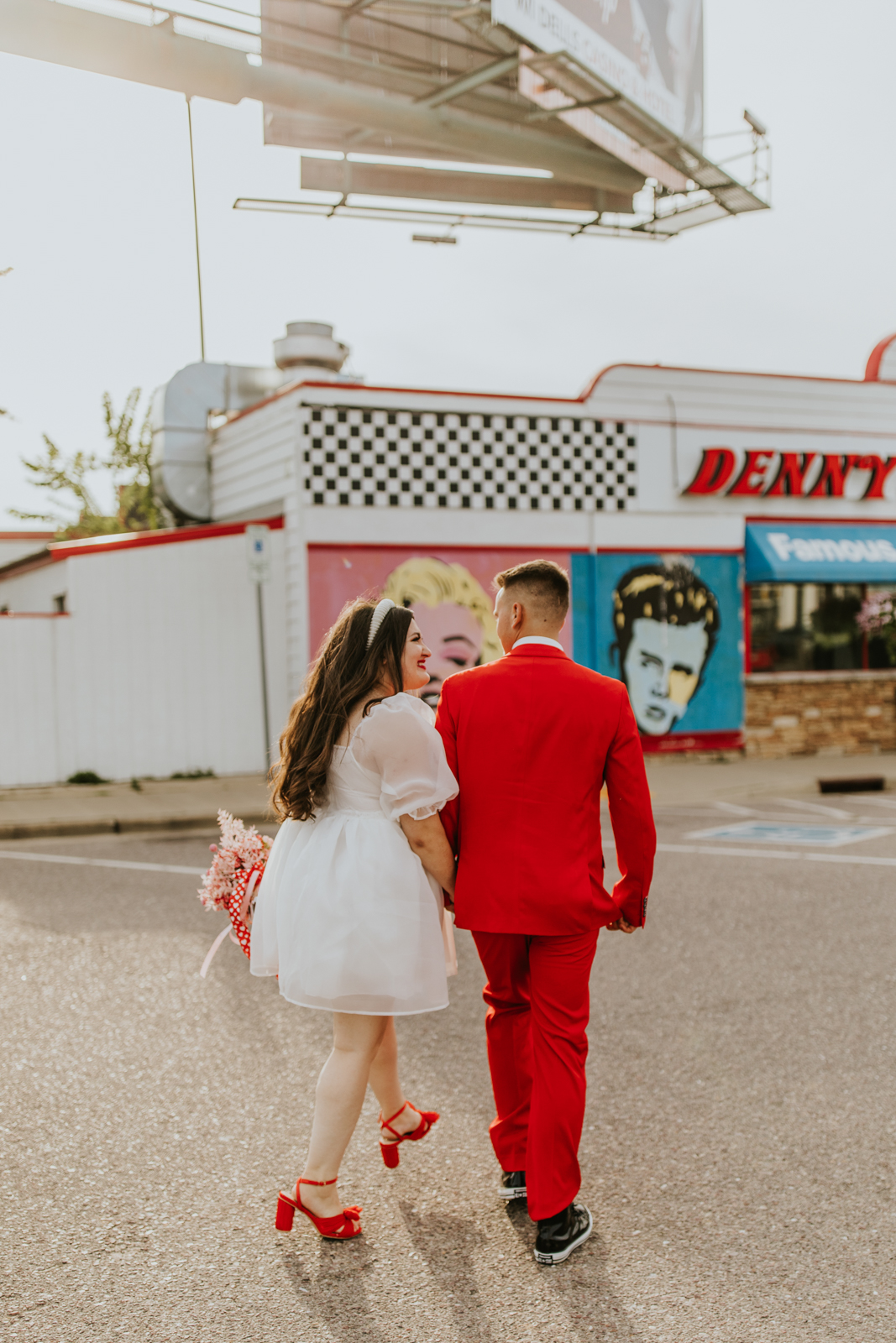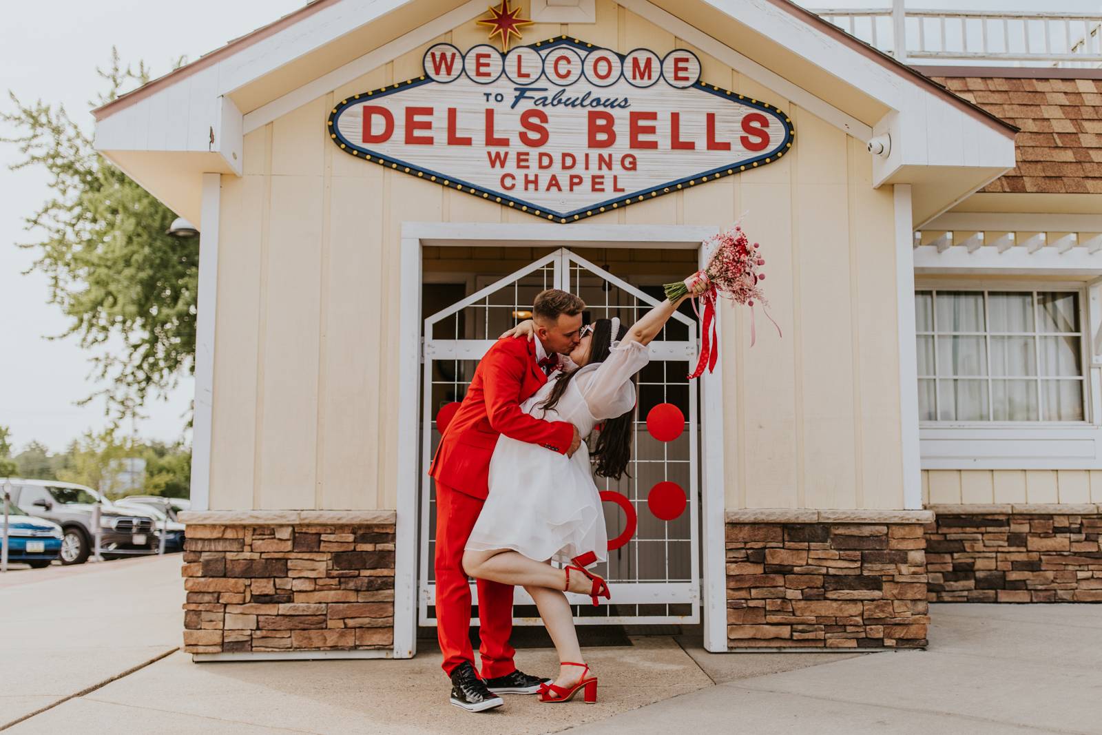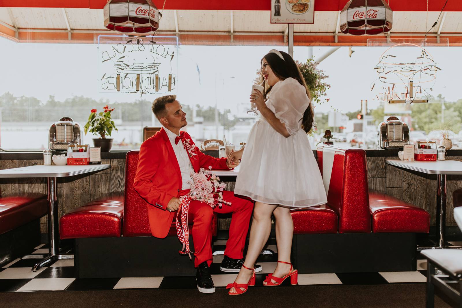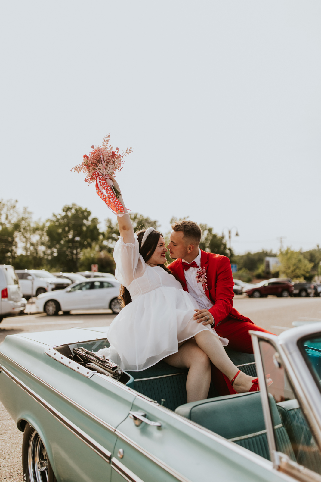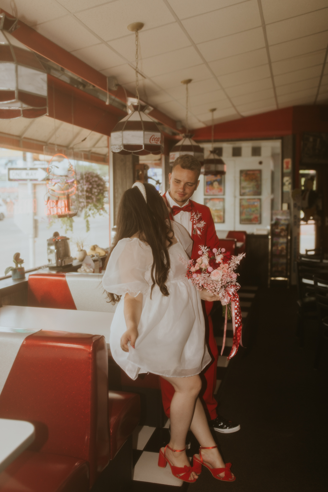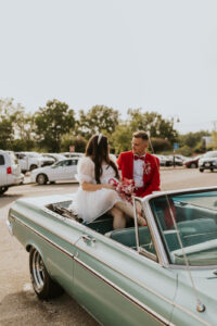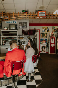 Rev up the jukebox and fasten your seatbelts for a wedding elopement design that pays a timeless tribute to the iconic 1950s! This Wisconsin Dells celebration is a blast from the past, seamlessly fusing ’50s flair, Vegas elopement extravagance, and vintage Valentine’s Day charm with bright reds, playful pinks, and kitschy heart details.