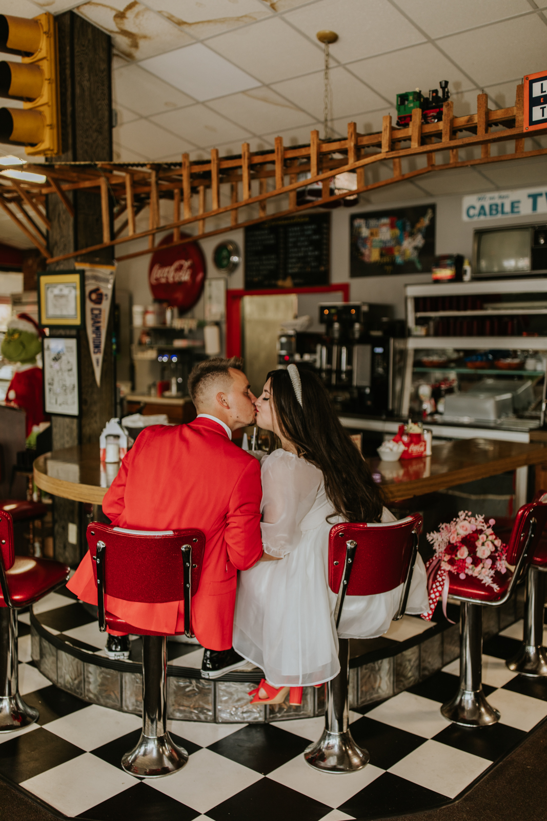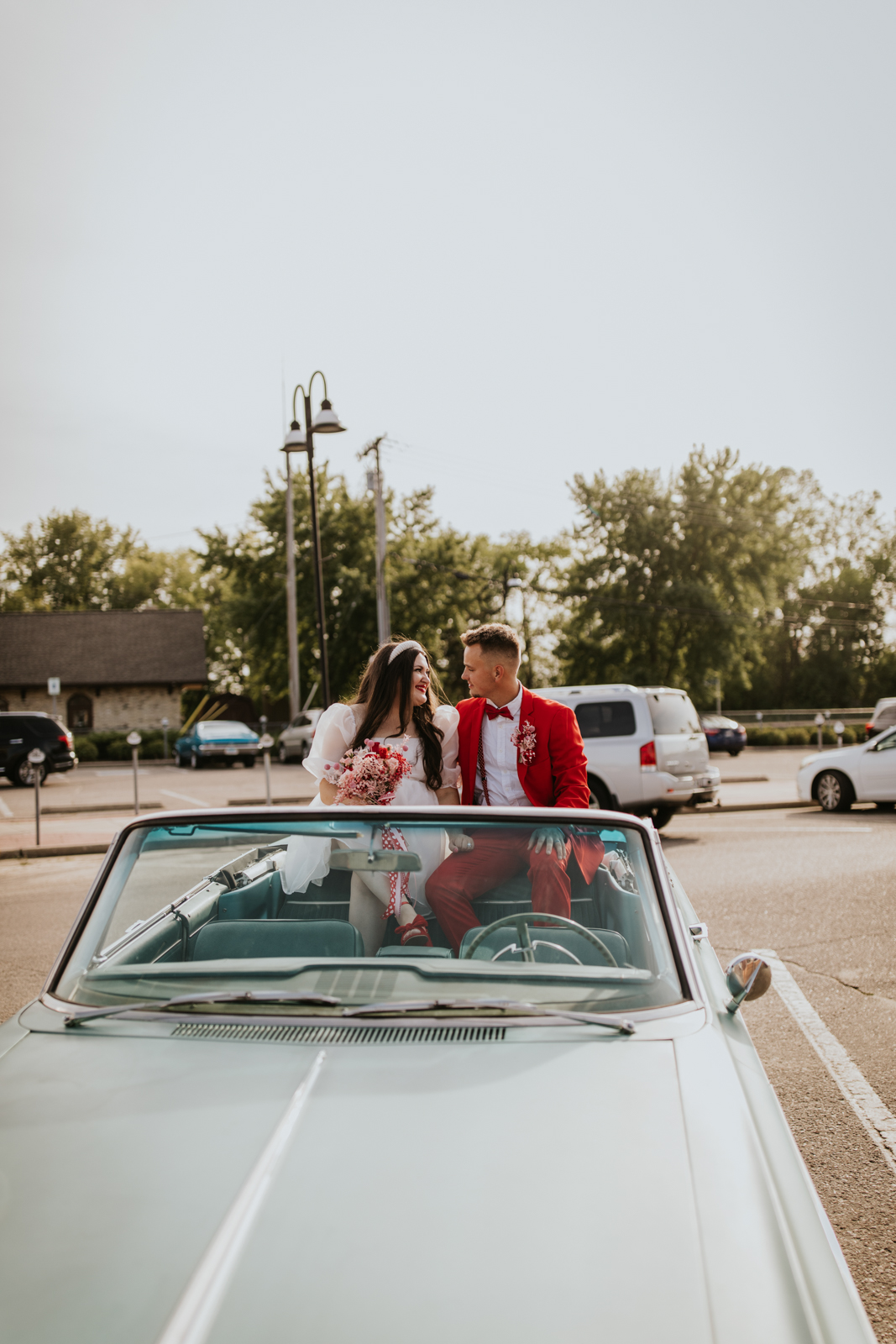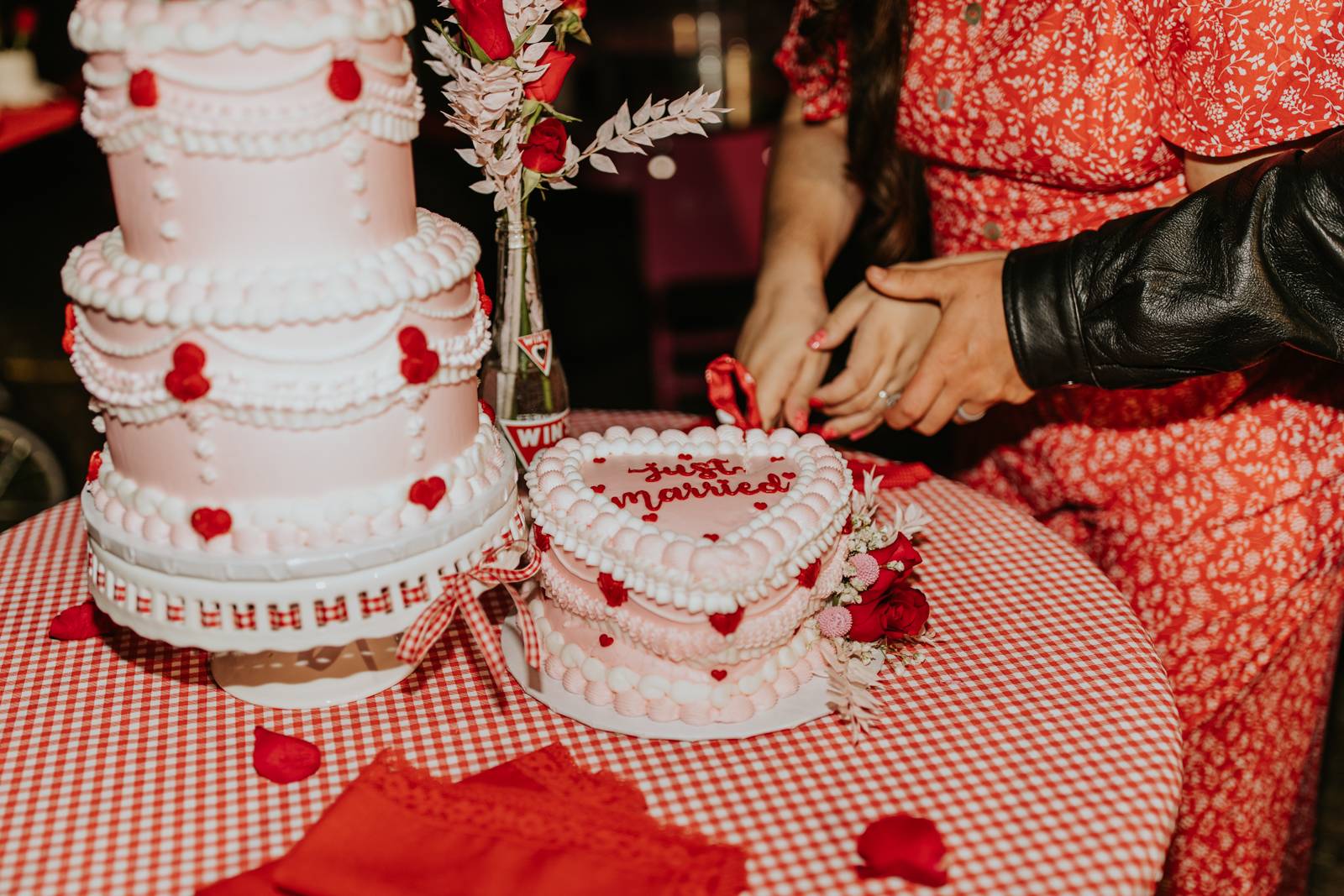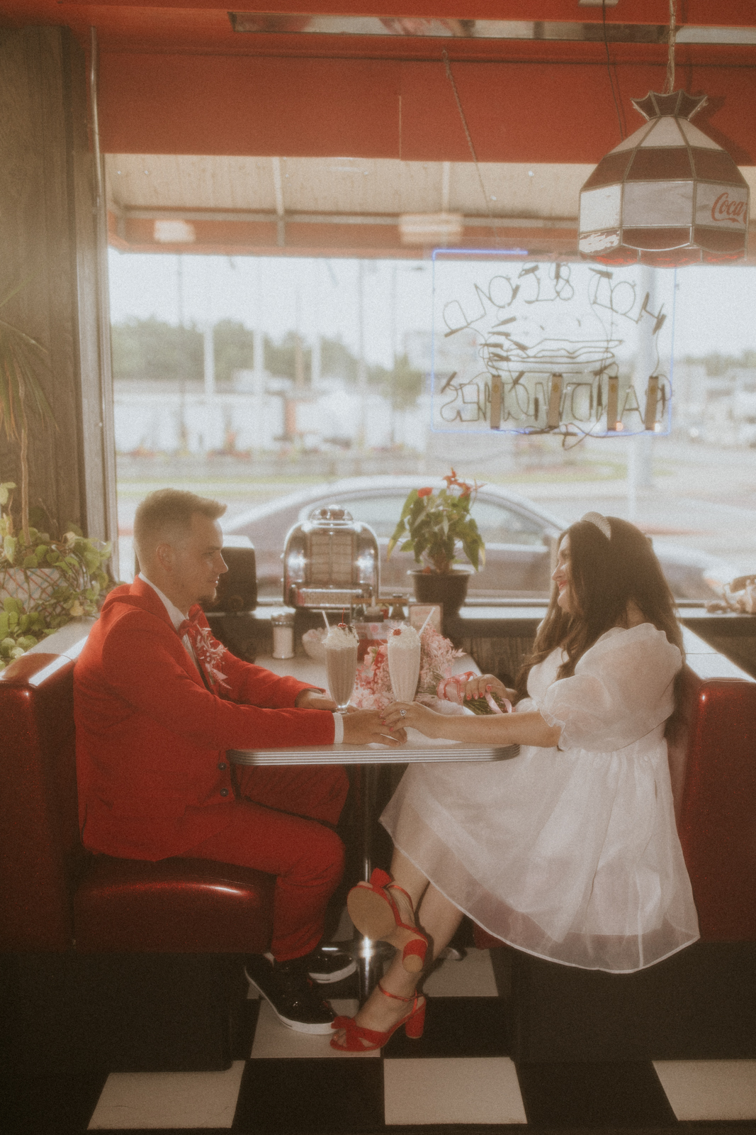 Rev up the jukebox and fasten your seatbelts for a wedding elopement design that pays a timeless tribute to the iconic 1950s! This Wisconsin Dells celebration is a blast from the past, seamlessly fusing ’50s flair, Vegas elopement extravagance, and vintage Valentine’s Day charm with bright reds, playful pinks, and kitschy heart details.