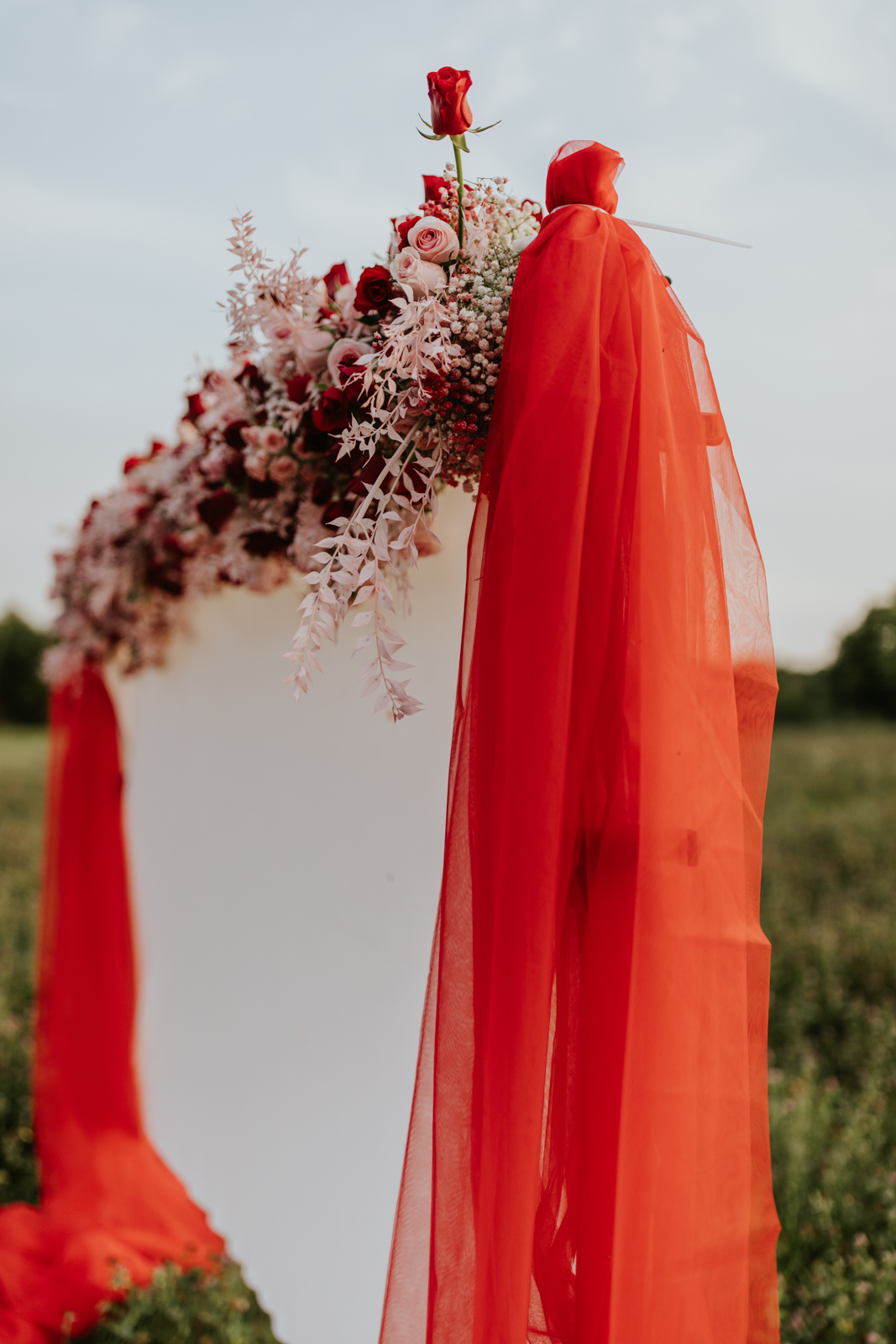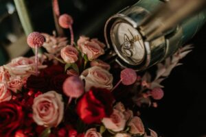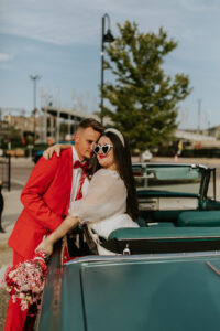 Melody Rose Designs has a knack for imaginative and distinctive floral arrangements, and the incorporation of colorful blooms into our couple’s attire was no exception. In addition to a lively bouquet filled with vibrant red and soft, romantic pink roses, a playful floral accent on the bride’s heart-shaped sunglasses was an unexpected twist to the bride’s chic ensemble. With a matching boutonniere for the groom, the couple was poised to celebrate in style!