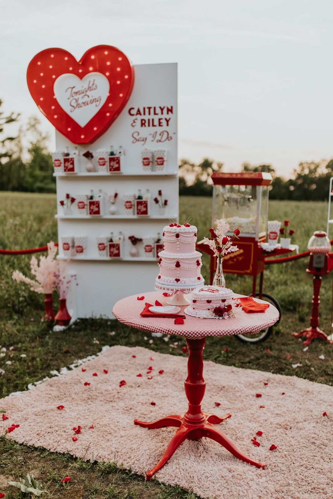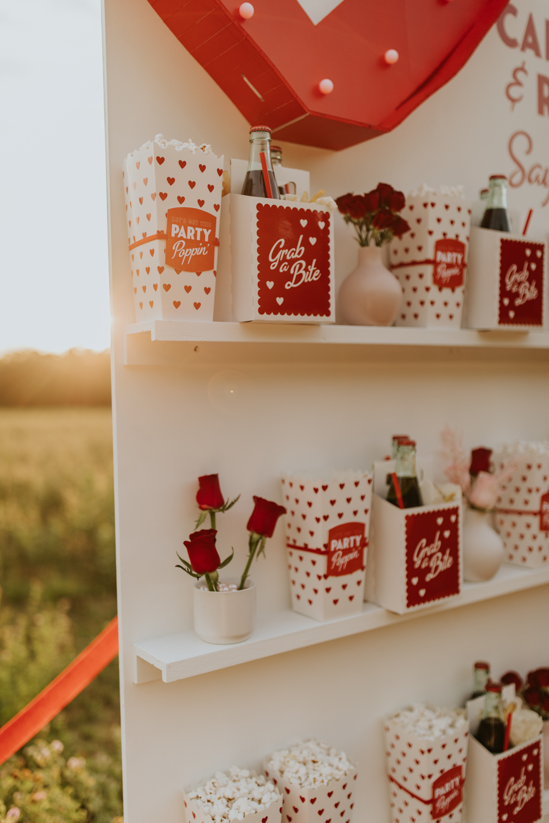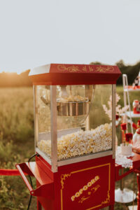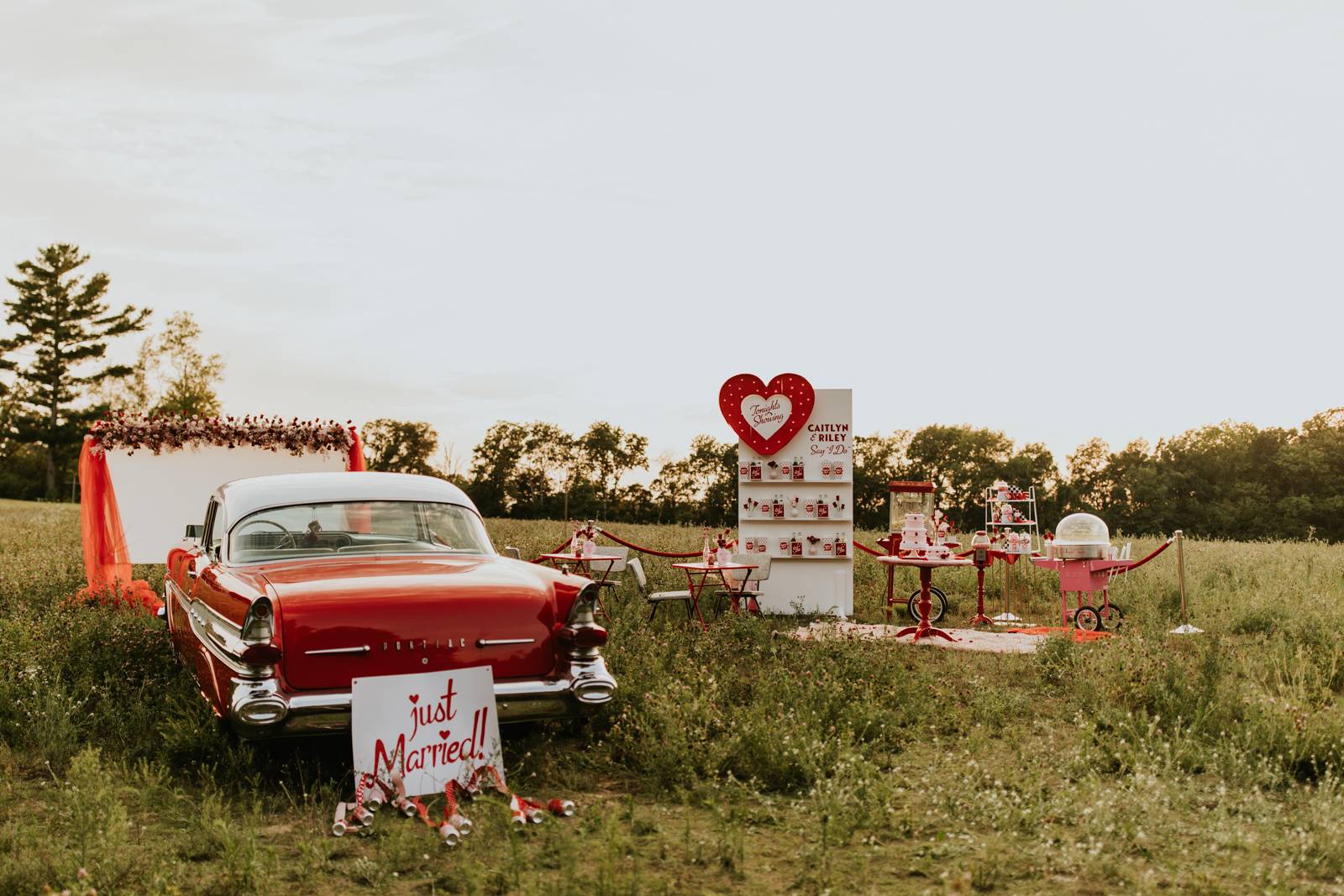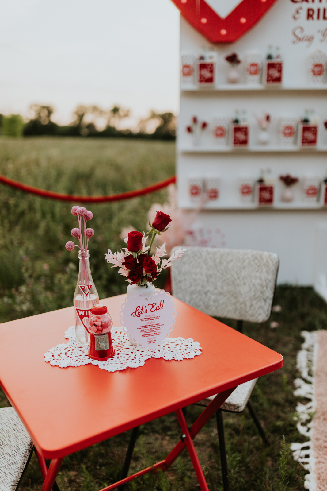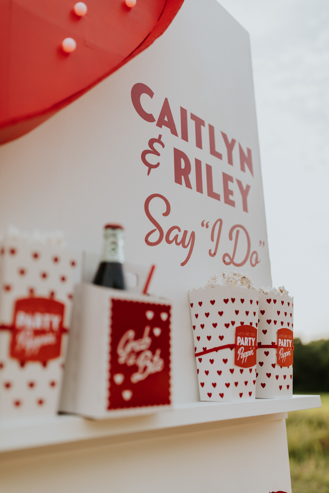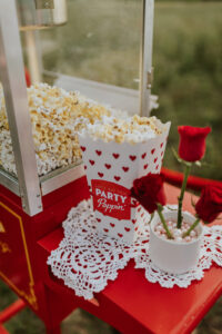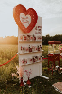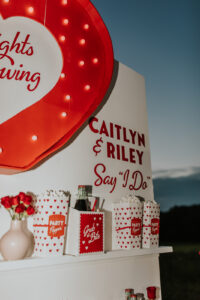 A drive-in experience isn’t complete without snacks! LK Bridal Studio designed a snack wall displaying custom snack boxes for Coca-Cola, fries, and popcorn for guests to enjoy! A large red, lit-up heart adorned the top of the display, featuring the couple’s names like the stars of a Hollywood film. From candy labels to a vintage welcome sign, vinyl decals, and so much more, LK Bridal Studio personalized this reception to perfection. Grab a bite, and let’s get this party poppin’!