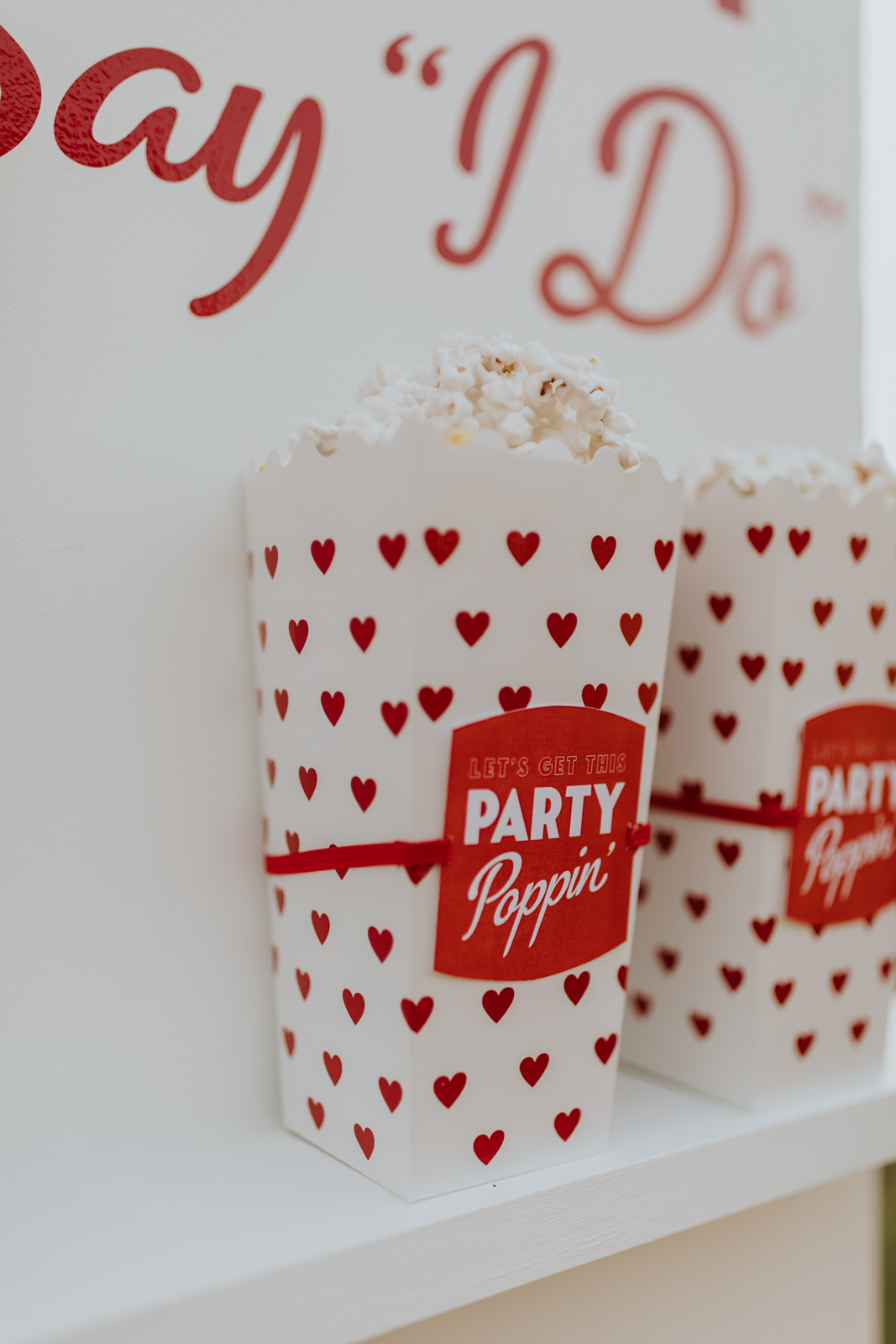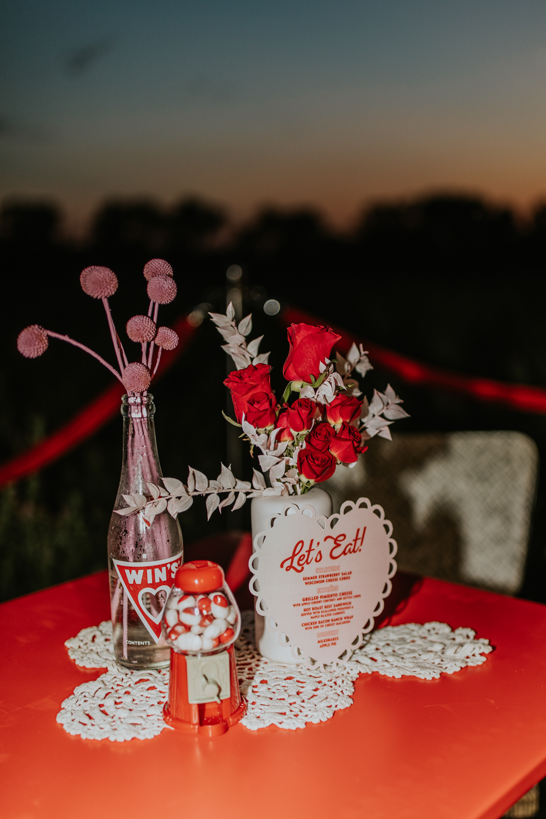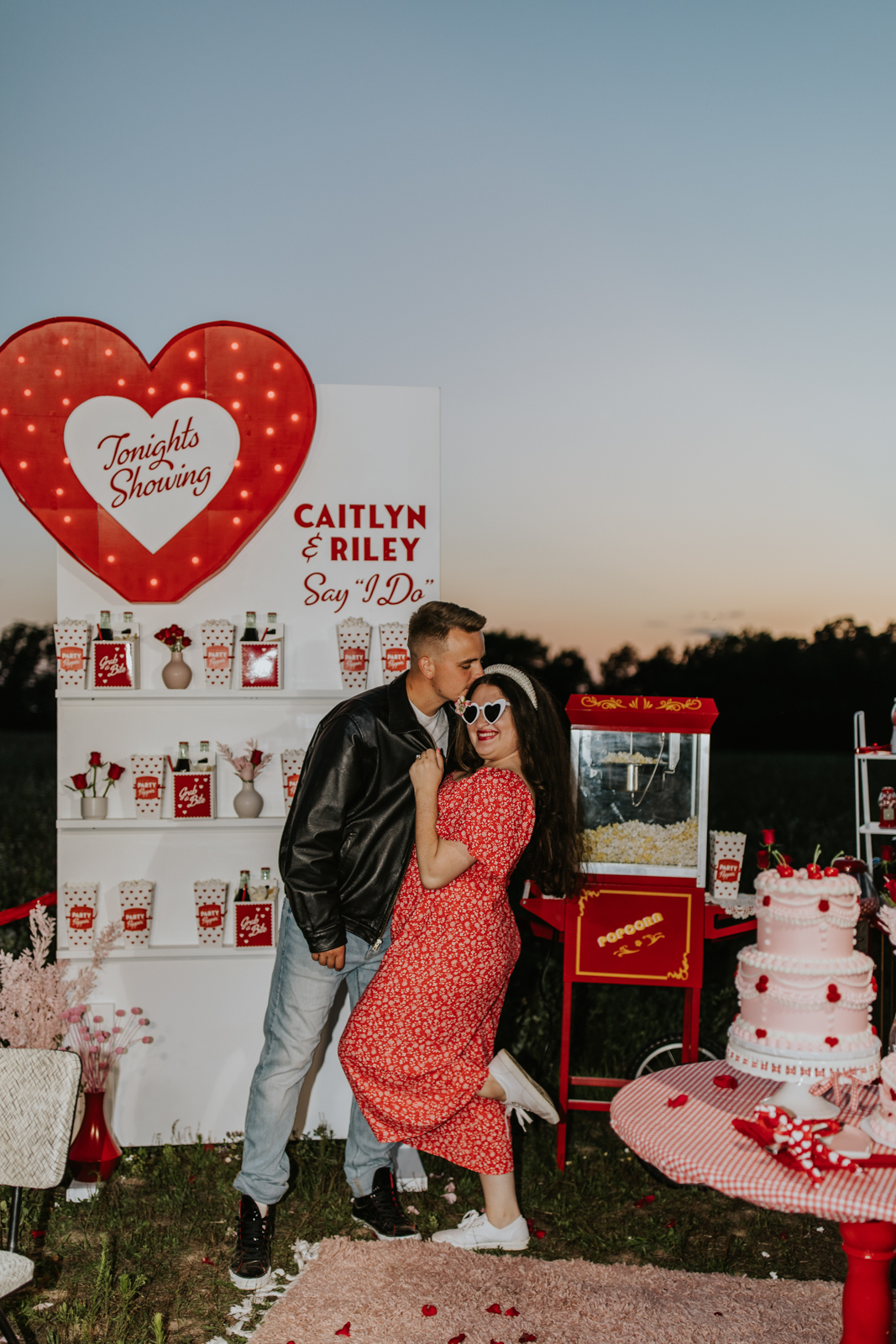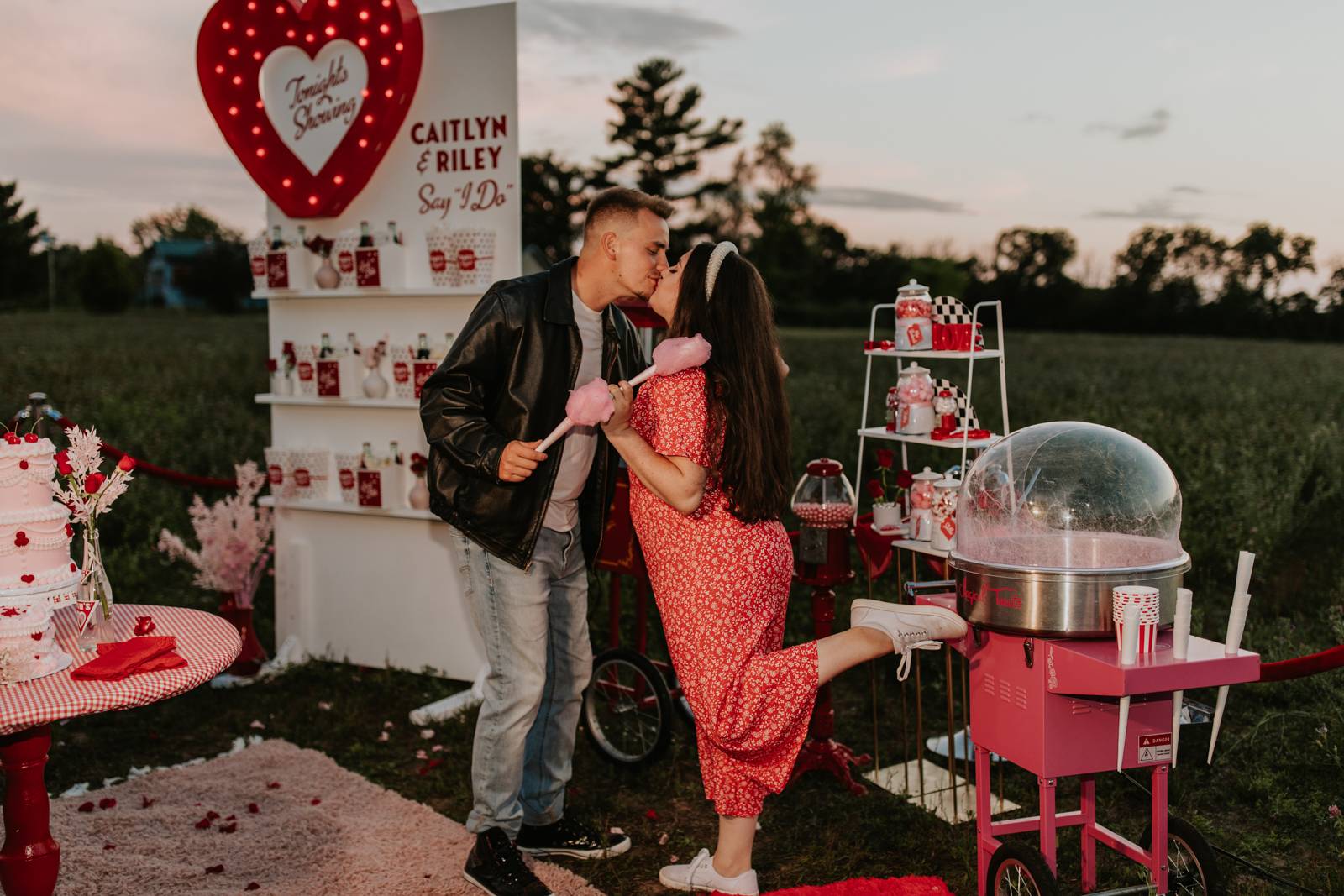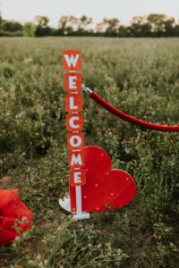 A drive-in experience isn’t complete without snacks! LK Bridal Studio designed a snack wall displaying custom snack boxes for Coca-Cola, fries, and popcorn for guests to enjoy! A large red, lit-up heart adorned the top of the display, featuring the couple’s names like the stars of a Hollywood film. From candy labels to a vintage welcome sign, vinyl decals, and so much more, LK Bridal Studio personalized this reception to perfection. Grab a bite, and let’s get this party poppin’!