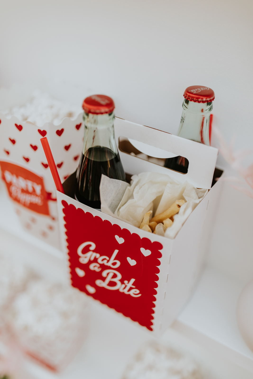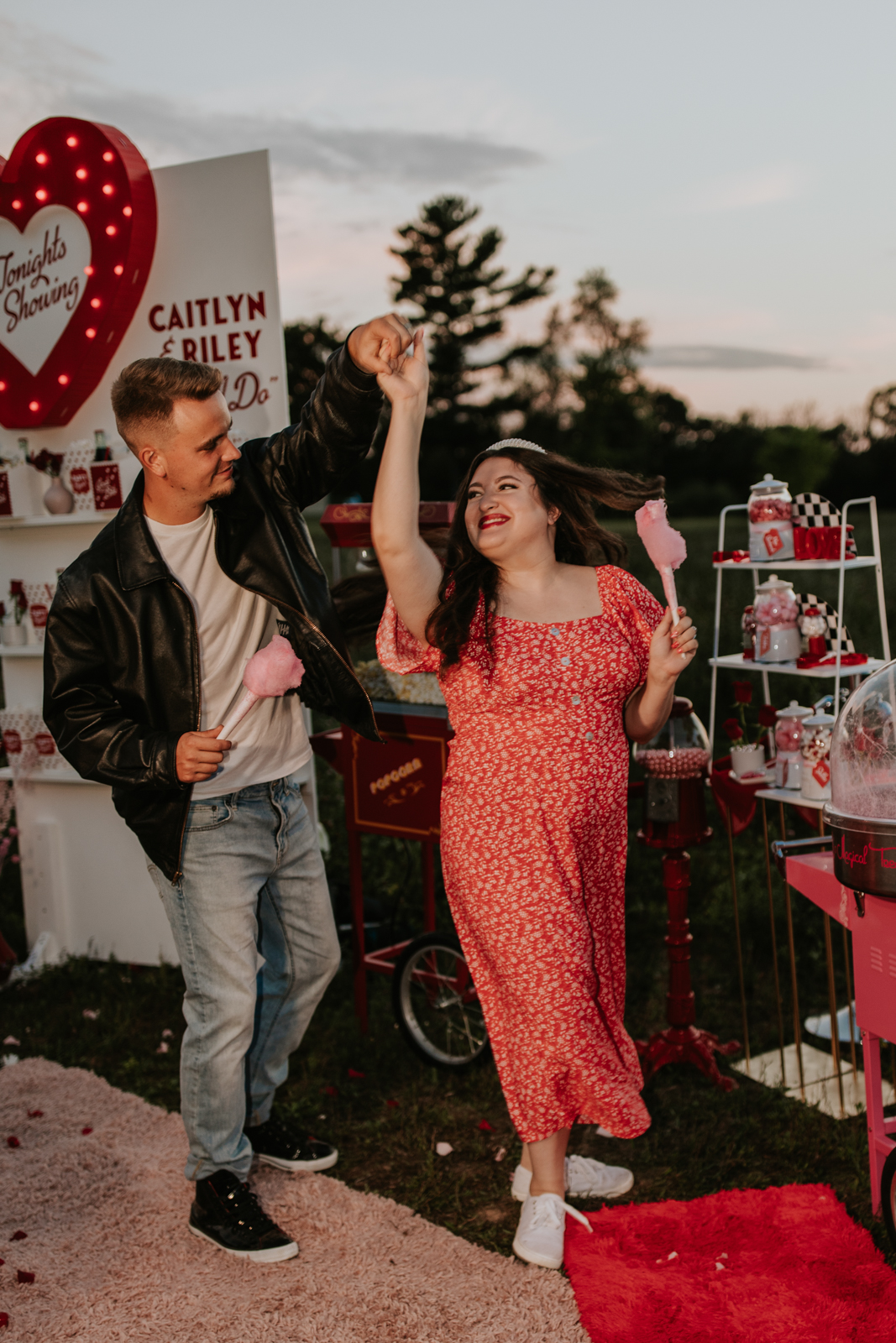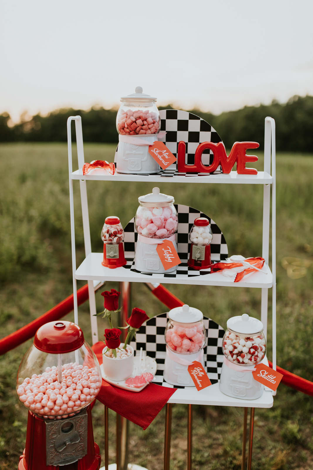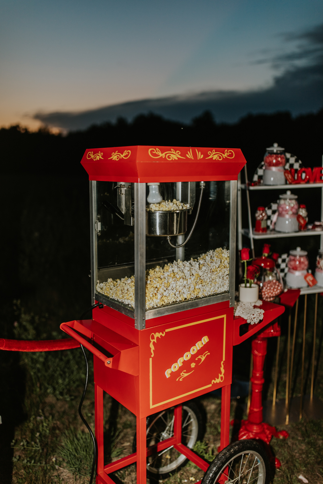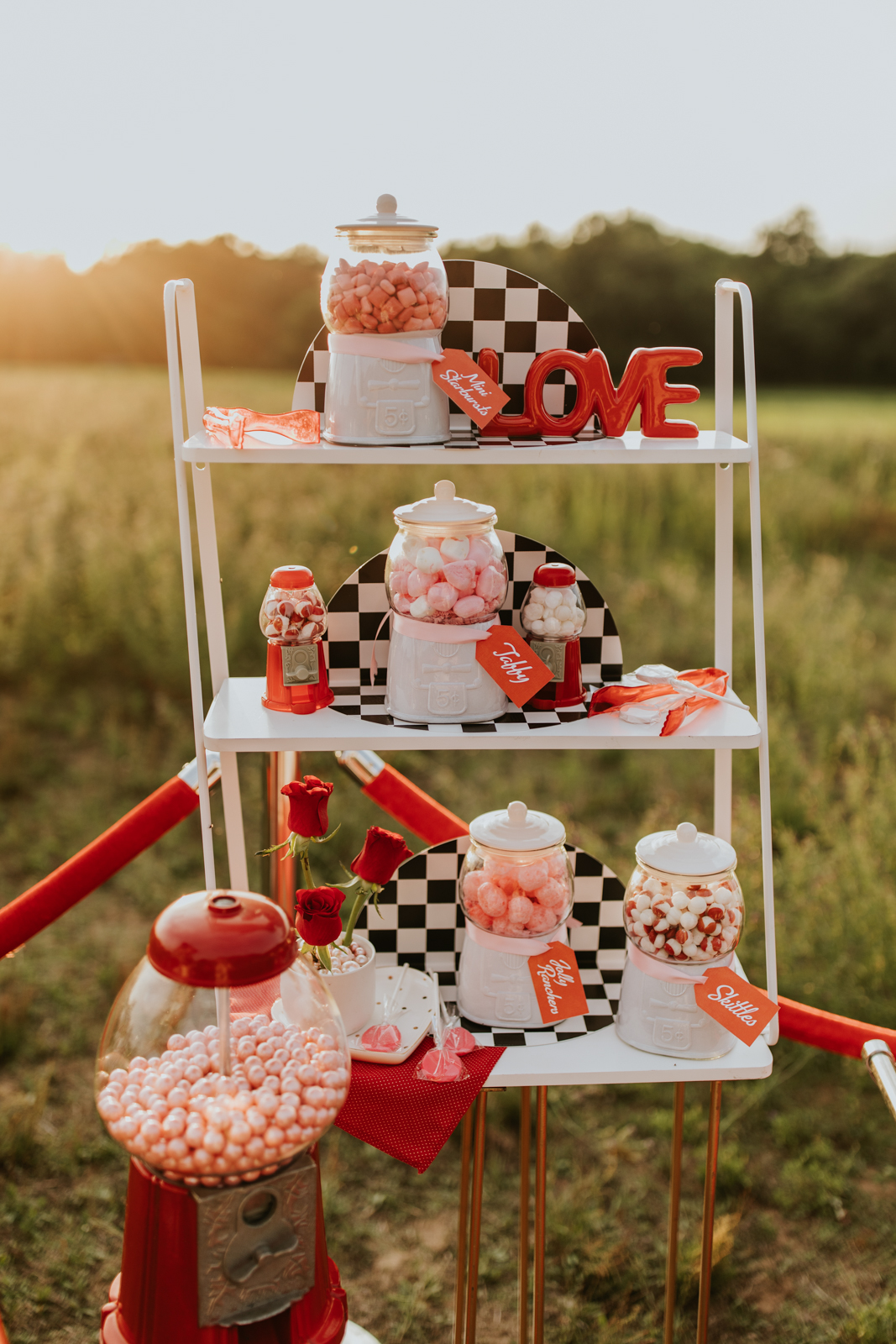 A drive-in experience isn’t complete without snacks! LK Bridal Studio designed a snack wall displaying custom snack boxes for Coca-Cola, fries, and popcorn for guests to enjoy! A large red, lit-up heart adorned the top of the display, featuring the couple’s names like the stars of a Hollywood film. From candy labels to a vintage welcome sign, vinyl decals, and so much more, LK Bridal Studio personalized this reception to perfection. Grab a bite, and let’s get this party poppin’!