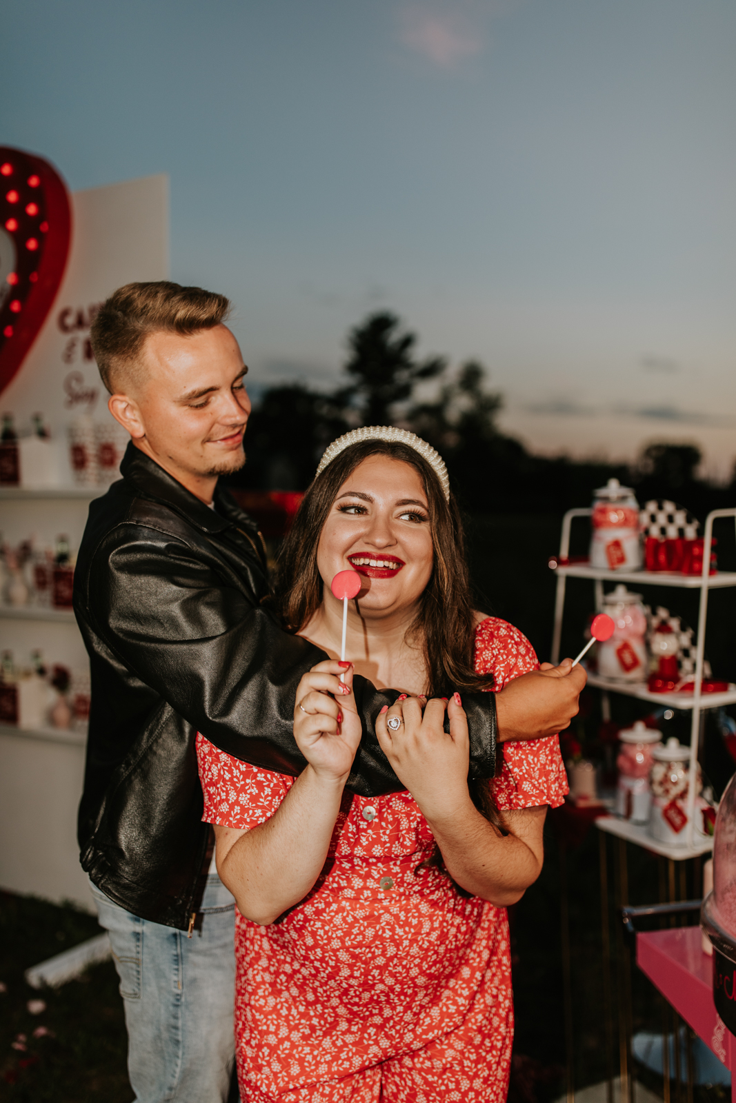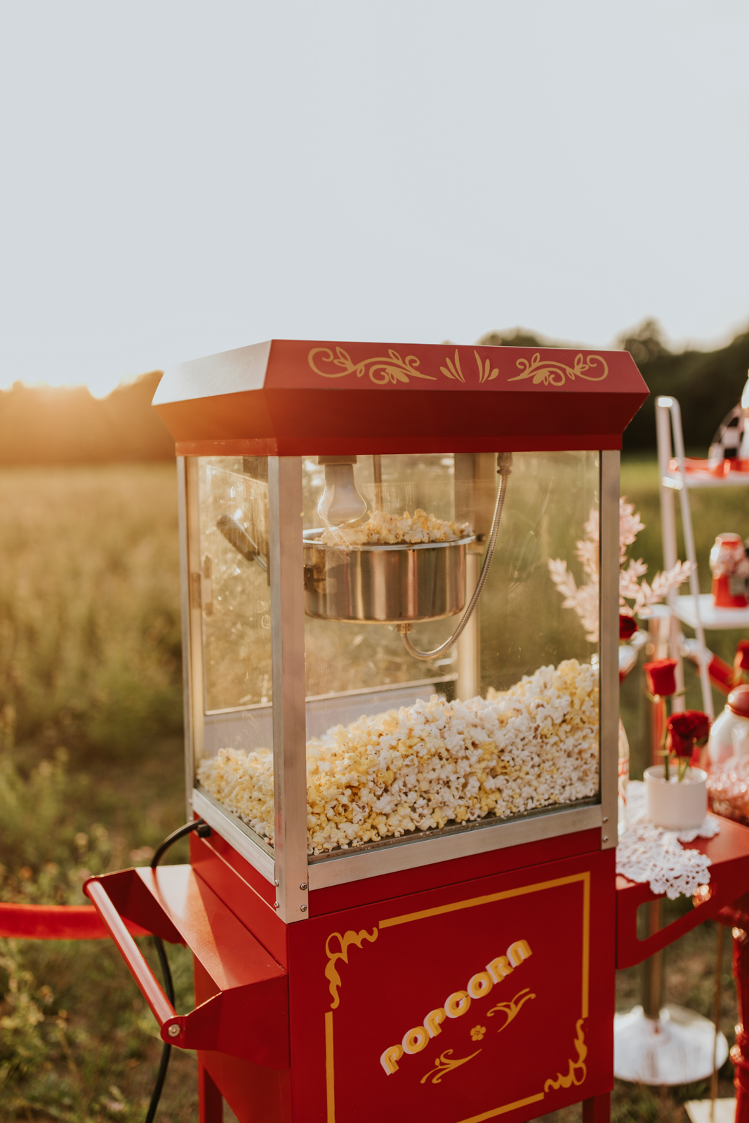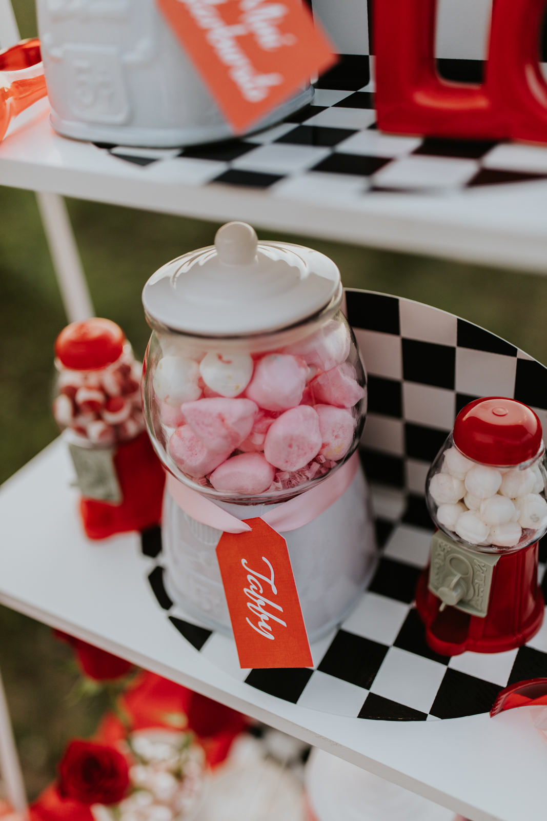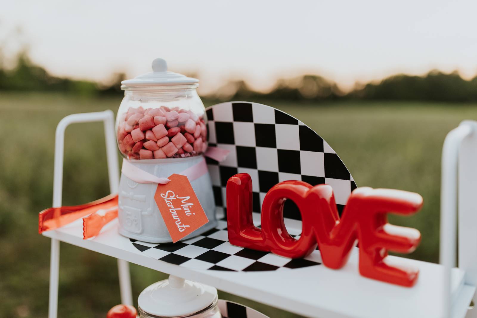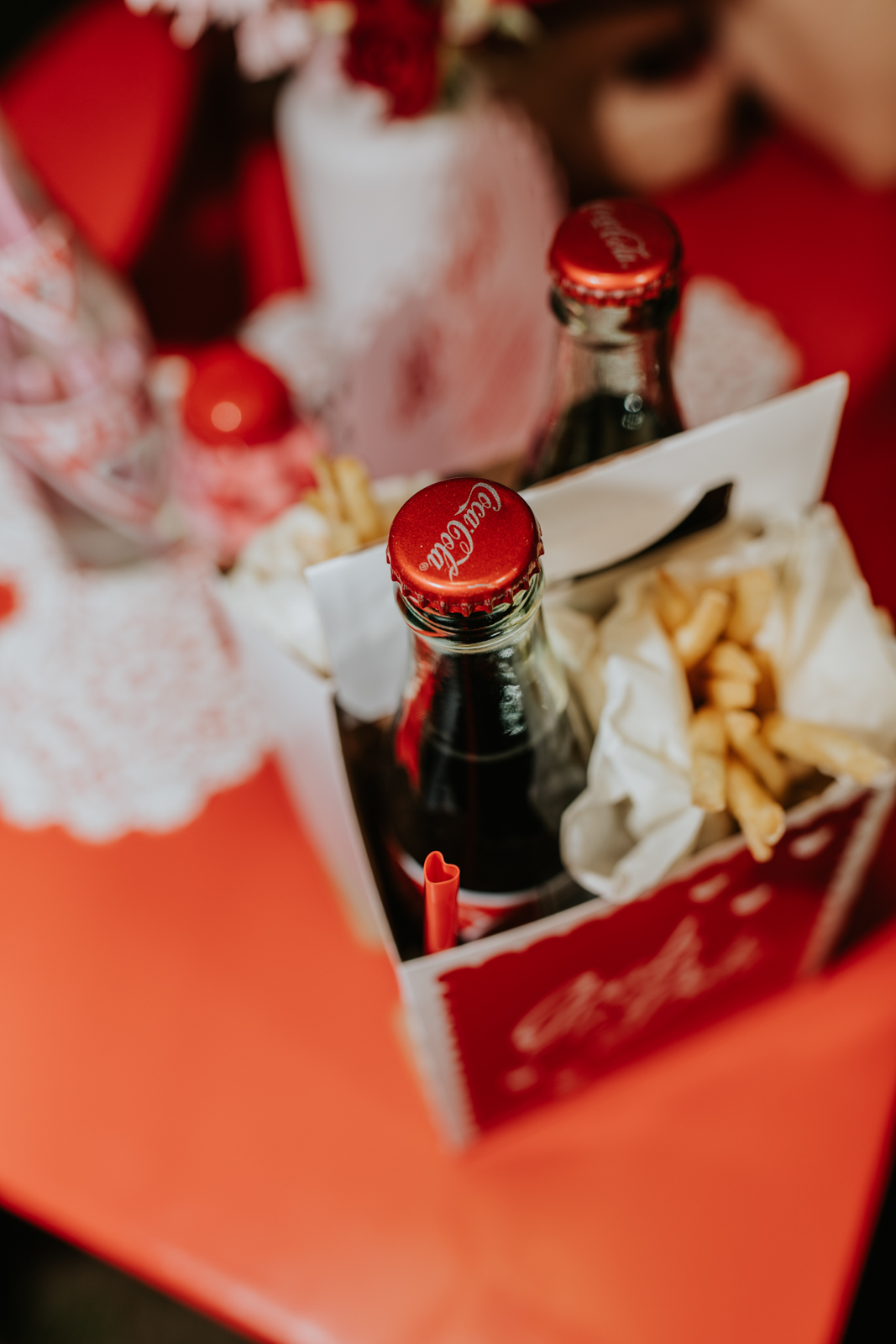 A drive-in experience isn’t complete without snacks! LK Bridal Studio designed a snack wall displaying custom snack boxes for Coca-Cola, fries, and popcorn for guests to enjoy! A large red, lit-up heart adorned the top of the display, featuring the couple’s names like the stars of a Hollywood film. From candy labels to a vintage welcome sign, vinyl decals, and so much more, LK Bridal Studio personalized this reception to perfection. Grab a bite, and let’s get this party poppin’!