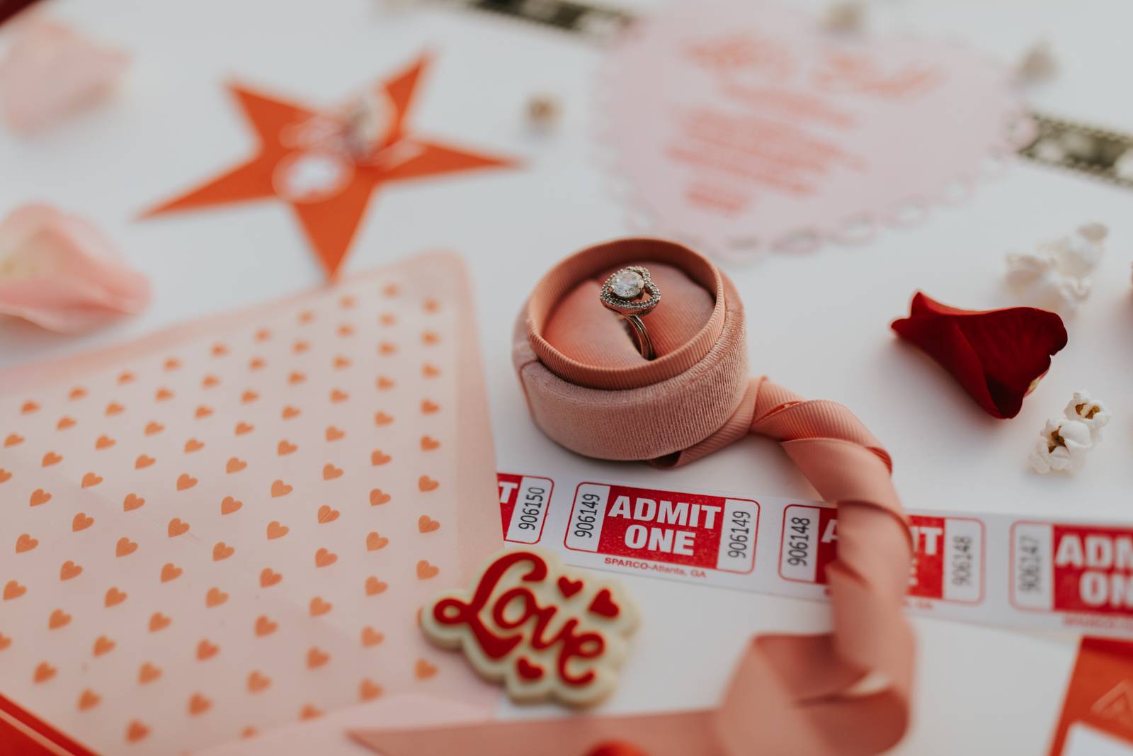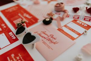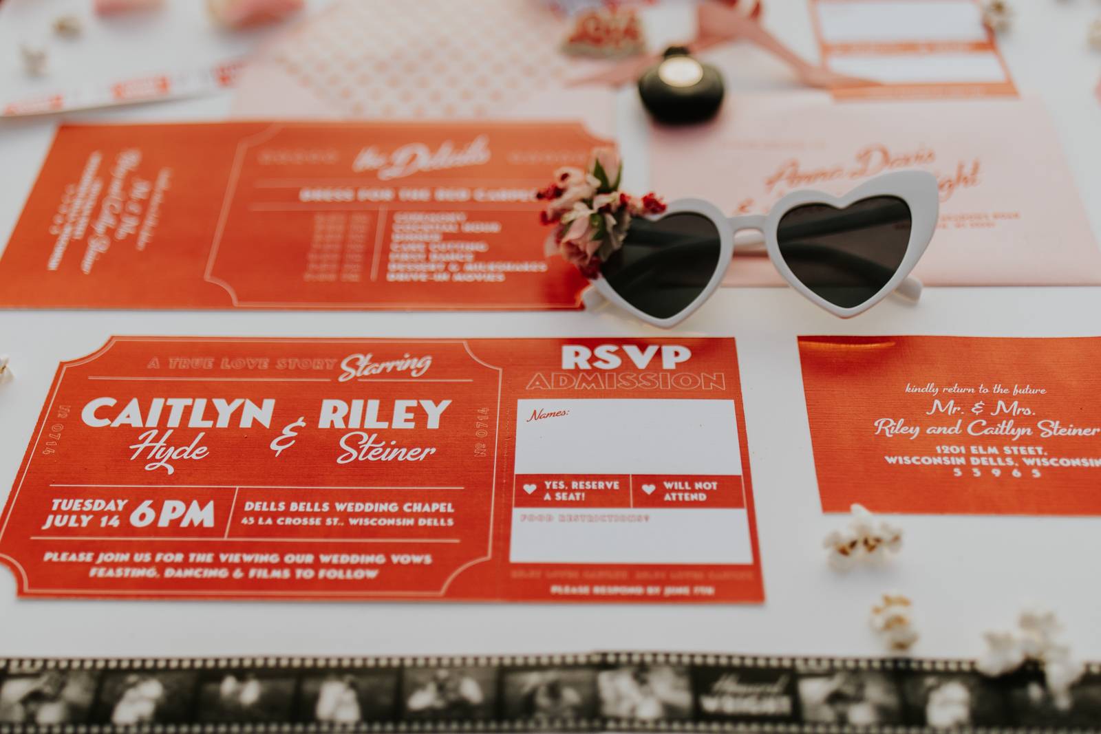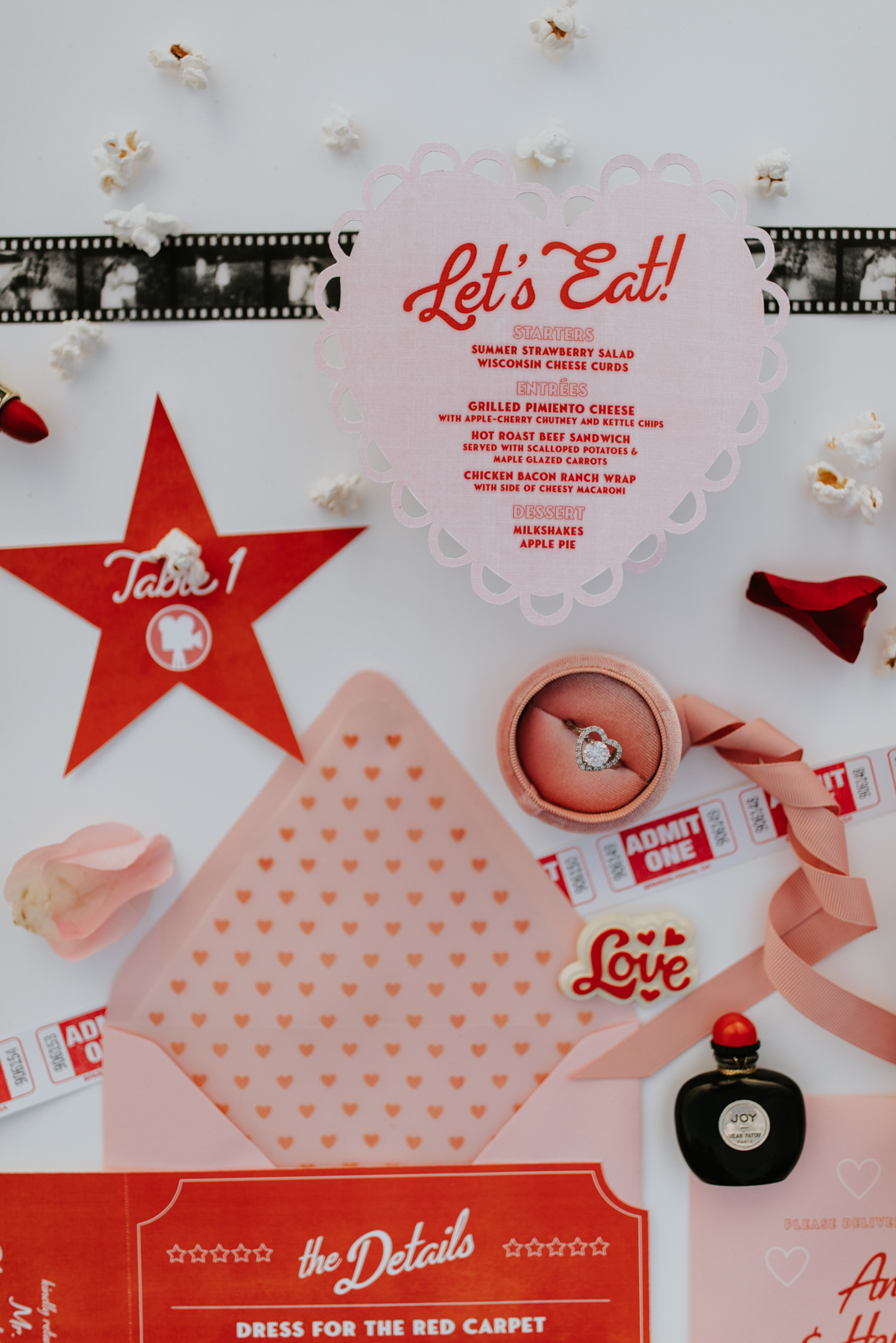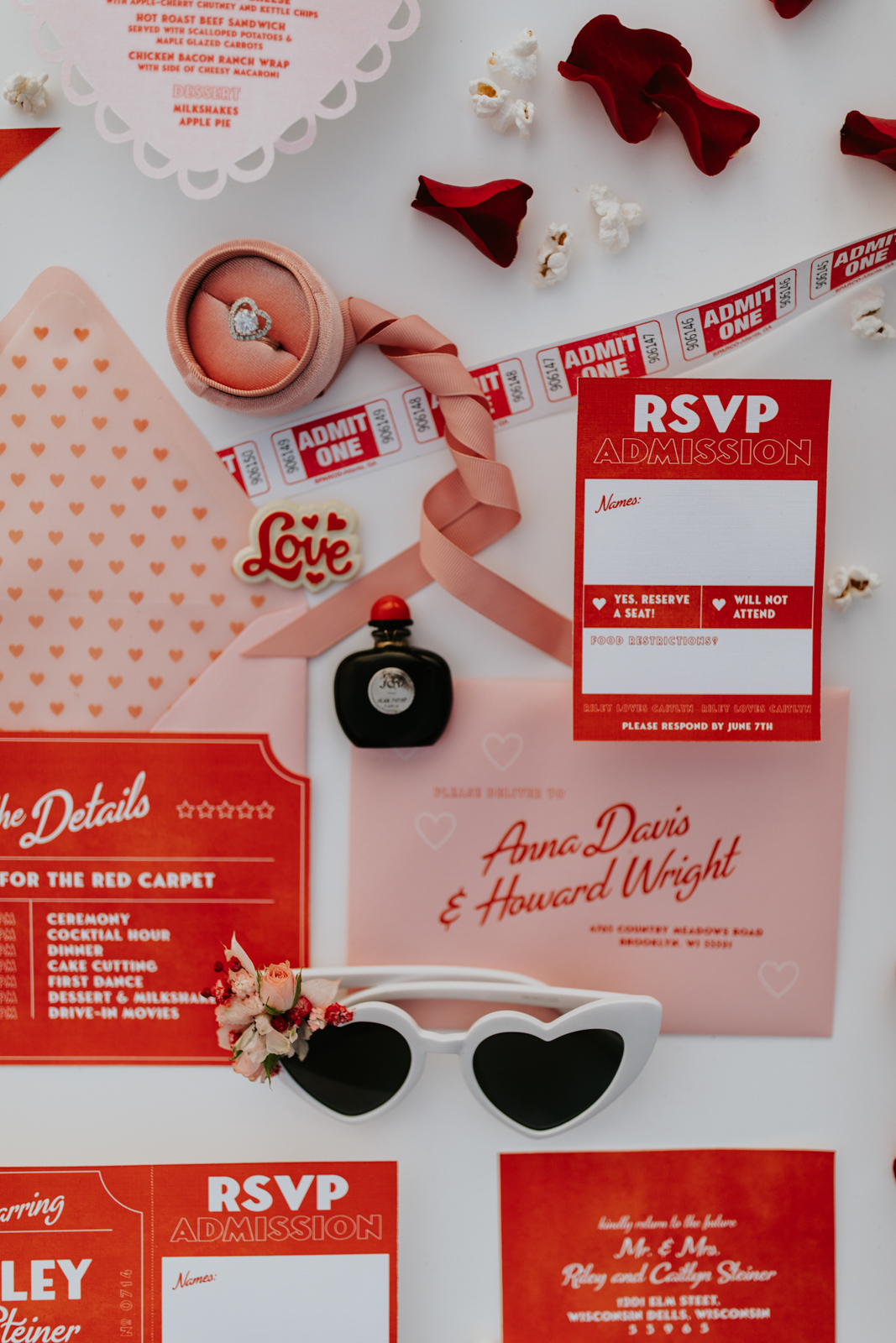 Old Hollywood films, classic diners, and vintage Valentine’s Day cards inspired LK Bridal Studio’s retro drive-in-themed stationery pieces. Their skilled team created a movie ticket invitation with a perforated ticket stub RSVP. The main slanted script font was reminiscent of romantic movie posters and unforgettable classics, while supporting fonts may have once lit up a theatre marquee!
