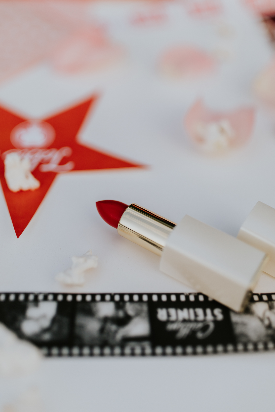 A vivid, bold red was central to the stationary color palette, with various softer shades of pink uniting their supporting pieces, like a laser-cut heart dinner menu and envelopes lined with an adorable heart-patterned print. The final touch to top off this stunning suite? A vellum film-reel name card and napkin holder featuring black and white photographs of the nearly-wedded couple!