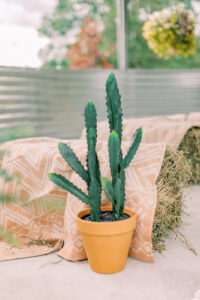 A small ceremony was set in Tranquility Farm’s silo with covered hay bales for seating and an abundance of cacti and cactus-inspired decor for the perfect Western desert feel. Lush, warm-toned floral arrangements beautifully covered each space of the celebration, and lasso bouquets for the bridesmaids were a creative nod to the rodeo influence.