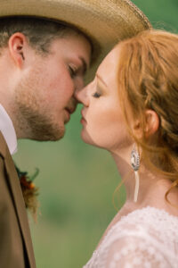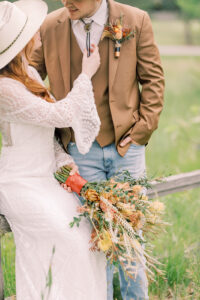The groom rocked a laid-back cowboy look, pairing a warm-toned brown suit jacket and vest with light blue jeans. He completed the outfit with a white button-down, cowboy hat, bolo tie, and classic cowboy boots. A shotgun shell boutonniere from Melody Rose Designs finished off the look, perfectly capturing that cool, casual Western vibe.