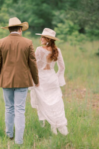 The bride looked stunning in a lacy, boho-inspired gown from Brides N’ Belles, perfect for a southwestern cowgirl look. The dress featured flared bell sleeves and a gorgeous train, adding a beautiful touch of vintage charm to the day.