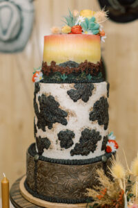 What says “Western” better than this stunning three-tiered cake from Cowboy David’s Bakery? The bottom layer mimicked intricate printed leather detailing, the middle layer featured classic cow print, and the top layer reflected the dreamy warmth of a desert sunset. It was the ideal sweet treat for a southwestern cowgirl wedding!