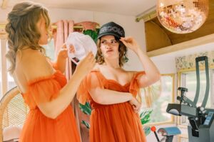Additional elements from LK Bridal Studio seamlessly extended the theme throughout the celebration. From a “Howdy Y’all” welcome sign to a bar sign styled like an authentic motel sign with beveled corners, a custom hat bar sign, creative cactus-inspired name cards, and a vintage television straw holder, all added even more retro charm to the day!