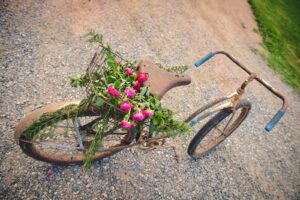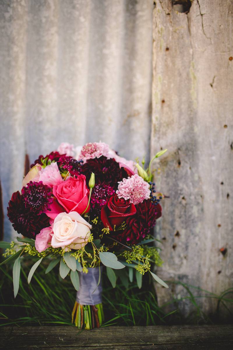 DESCRIBE YOUR WEDDING FLOWERS: I left it up to my florist. I picked out the colors and told her some ideas but wanted a surprise. She surprised me with beautiful flowers on the wedding day. The flowers are locally grown wine dahlias, pink lisianthus, “Anna” and “Cherry O” roses, privet berries, wine scabiosa, candy scabiosa and seeded eucalyptus.