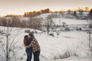 A beautiful Wisconsin snowy background with a natural spring on their family’s land is the setting for today’s e-sesh. And these two are the cutest. Brooke and Brad took a sleigh ride among rolling hills and golden light in Reedsburg, all captured by LK Bridal Studio in these pretty wintery images below.