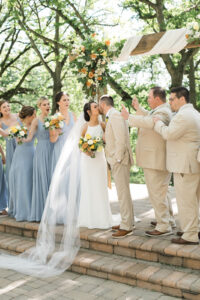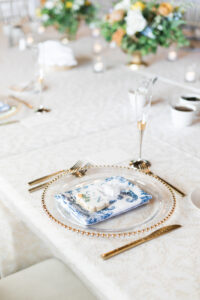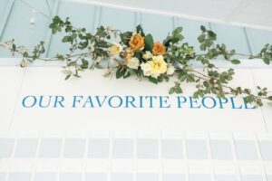 Amy from Relax Event Planning helped Carly and Nick design and execute the soft, summery, citrus-inspired wedding of their dreams which was brought to life with an abundance of showstopping lush garden florals from Sunborn Gardens! Filled with dusty blue, yellow, taupe, gold, and tangerine tones, their wedding included many intentional design details that carried throughout their linens to their signage, and beyond. A gorgeous escort wall was a statement-making piece set on the patio for cocktail hour custom-made by Cedar & Spice who utilized their in-house artist, to paint the elegant blue detailing that matched the guests' napkins and cake table linen.