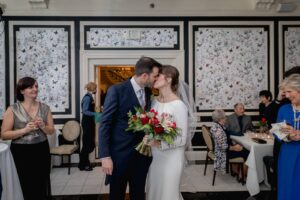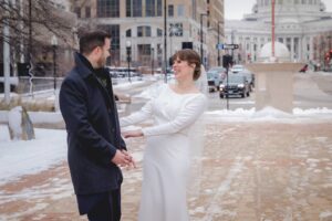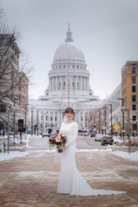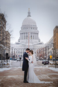 Love was enough to keep this celebration warm on a wintry Wisconsin day when Linsey and Alfonso tied the knot, captured by The Wedding Flashers! The Madison Club brought this seasonal burgundy and emerald hues wedding to life, serving as a fitting backdrop for the chilly day. When it came to their florals from daffodil*parker, the couple wanted to incorporate blooms that reflected the winter season and Christmastime, featuring deep reds with pops of evergreen to match the wedding vibes. Linsey’s gown from Premiere Couture had traditional bridal elegance, with long sleeves and accessories to keep her warm on that December day. Alfonso wore a traditional Spanish Chaque that the couple bought in Madrid only a few days after Alfonso’s dreamy proposal while visiting his family in San Sebastian, Spain. The couple ended the day with a live band as they rang in the new year! Dive into the sophisticated seasonal wedding vibes from Linsey and Alfonso’s day below!