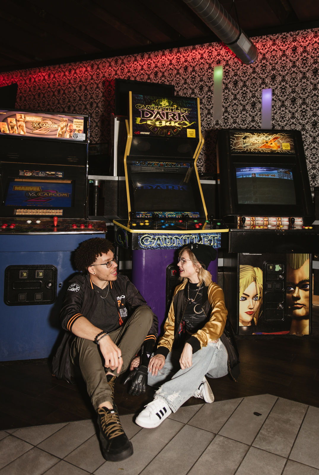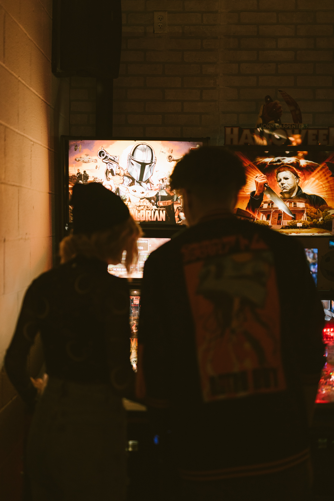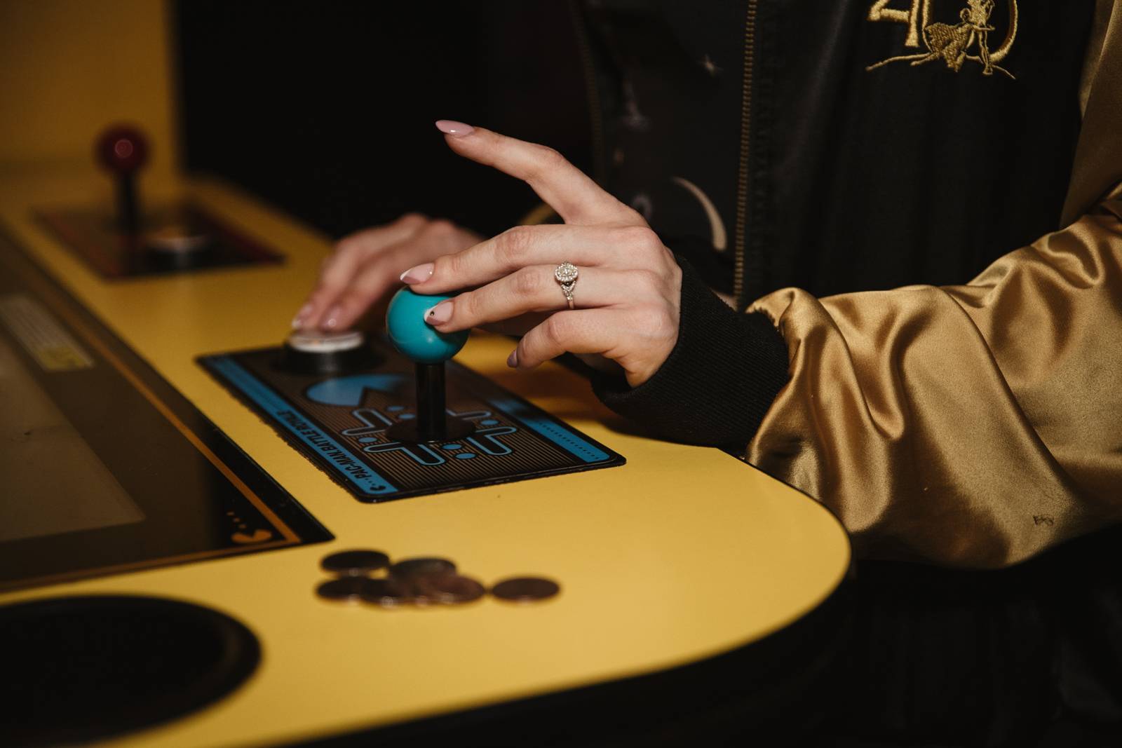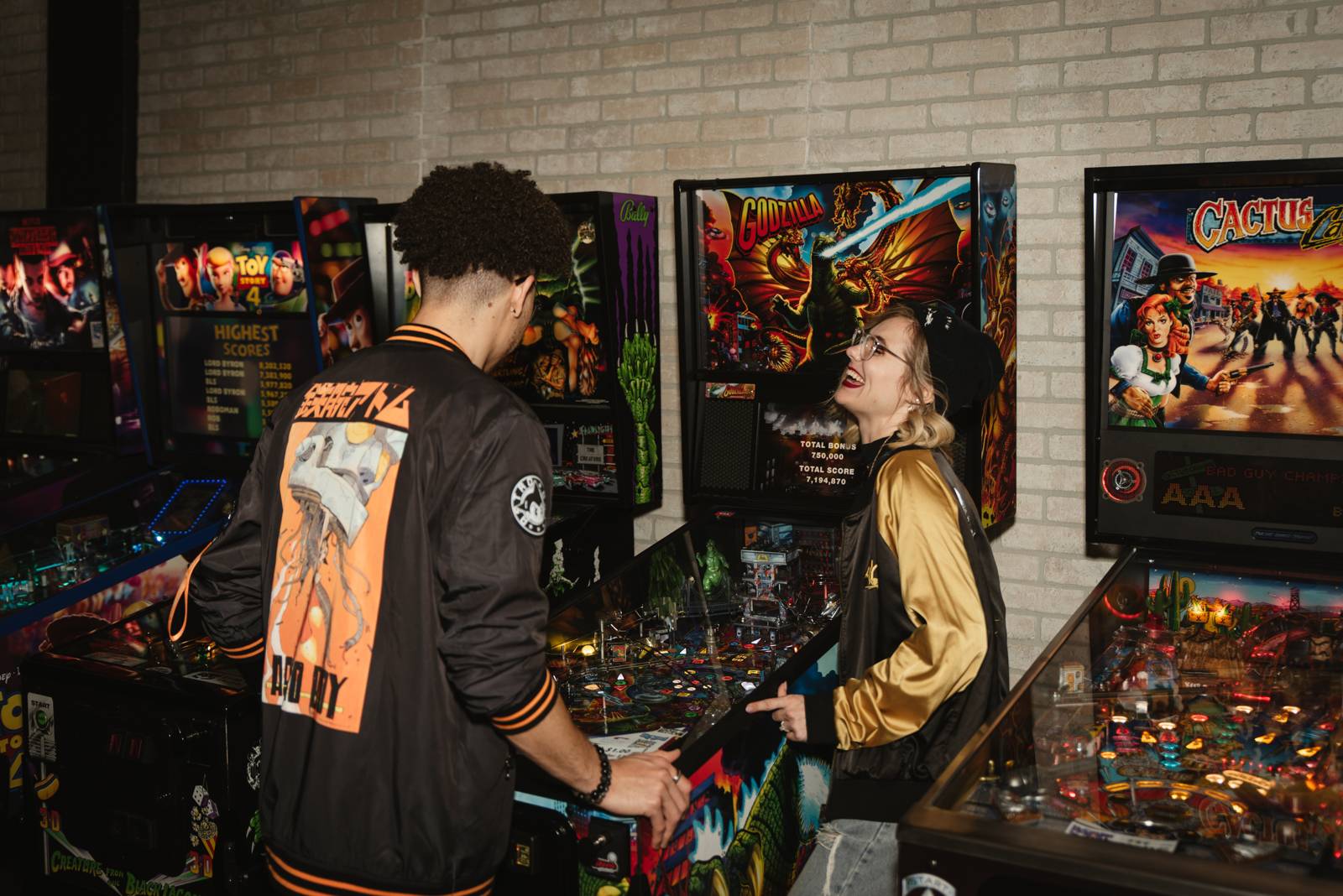 Self-proclaimed gaming and comic book nerds Alicia and Brian celebrated their love and engagement with a unique and vibey photo session in downtown Madison, Wisconsin. I/O Arcade Bar was the perfect location offering a chill space in a refurbished warehouse on Willy Street with craft beer, retro arcade games, and pinball. Captured by Valerie Halling Photography, the fun lights of the arcade paired with this couple’s vibrant street style made for a totally one-of-a-kind engagement shoot we know you’ll love below!