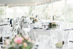 DID YOU USE ANY SPECIALTY TABLES, CHAIRS, LINENS OR DINNERWARE? Navy sashes for the head table, white tablecloths, navy napkins and an eclectic collection of vintage dishes for the guests.