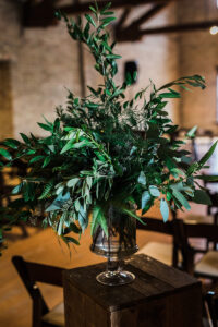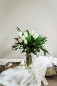 DESCRIBE YOUR WEDDING FLOWERS: I had a bouquet of white tulips to honor my grandmother who passed; she immigrated here from Holland and tulips are my favorite flower.  They were really simple and minimalist.  All of our other flowers were really just greenery, it was so beautiful with all of the white and the brick of The Lageret.