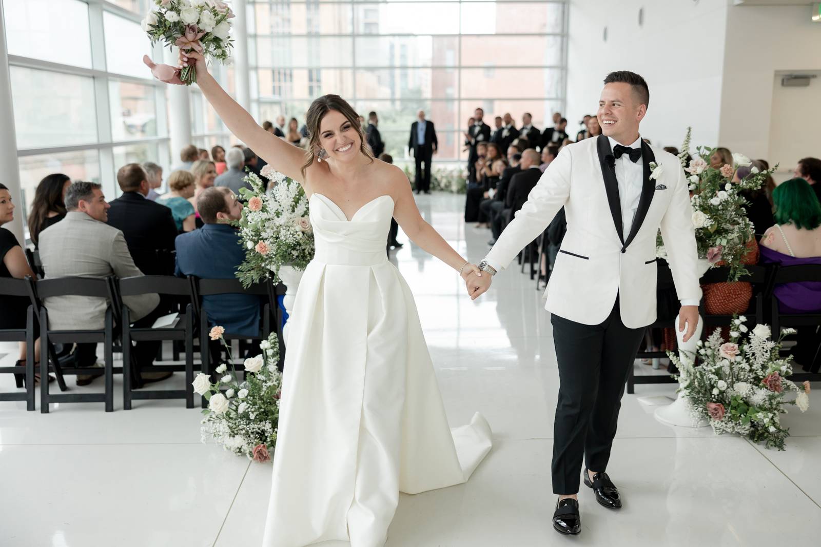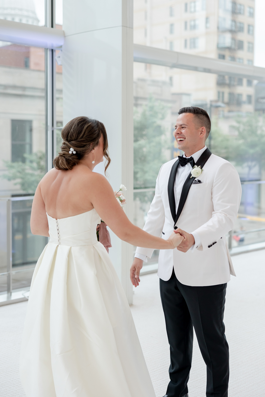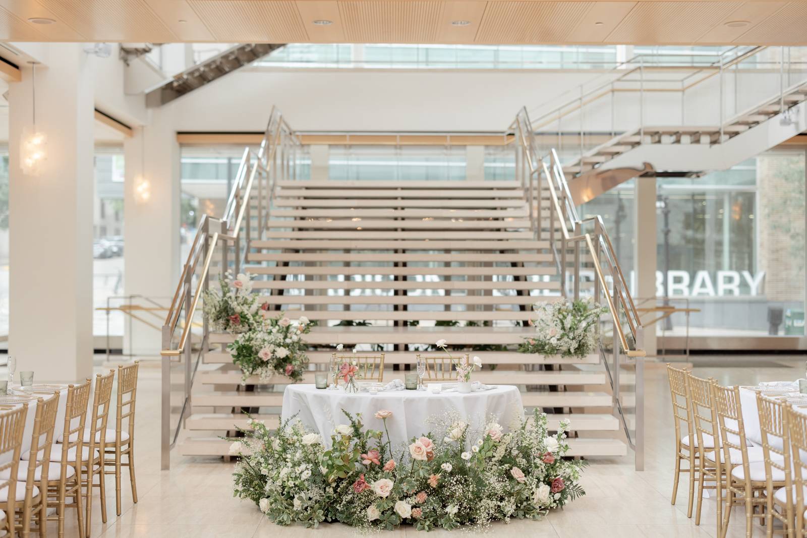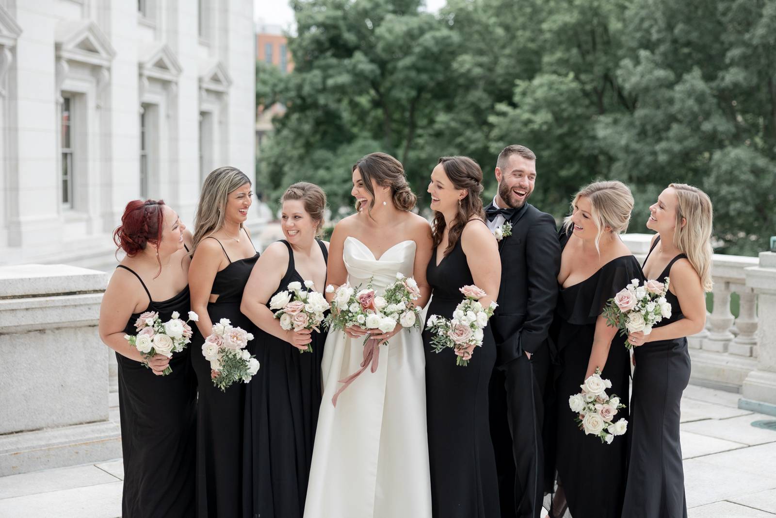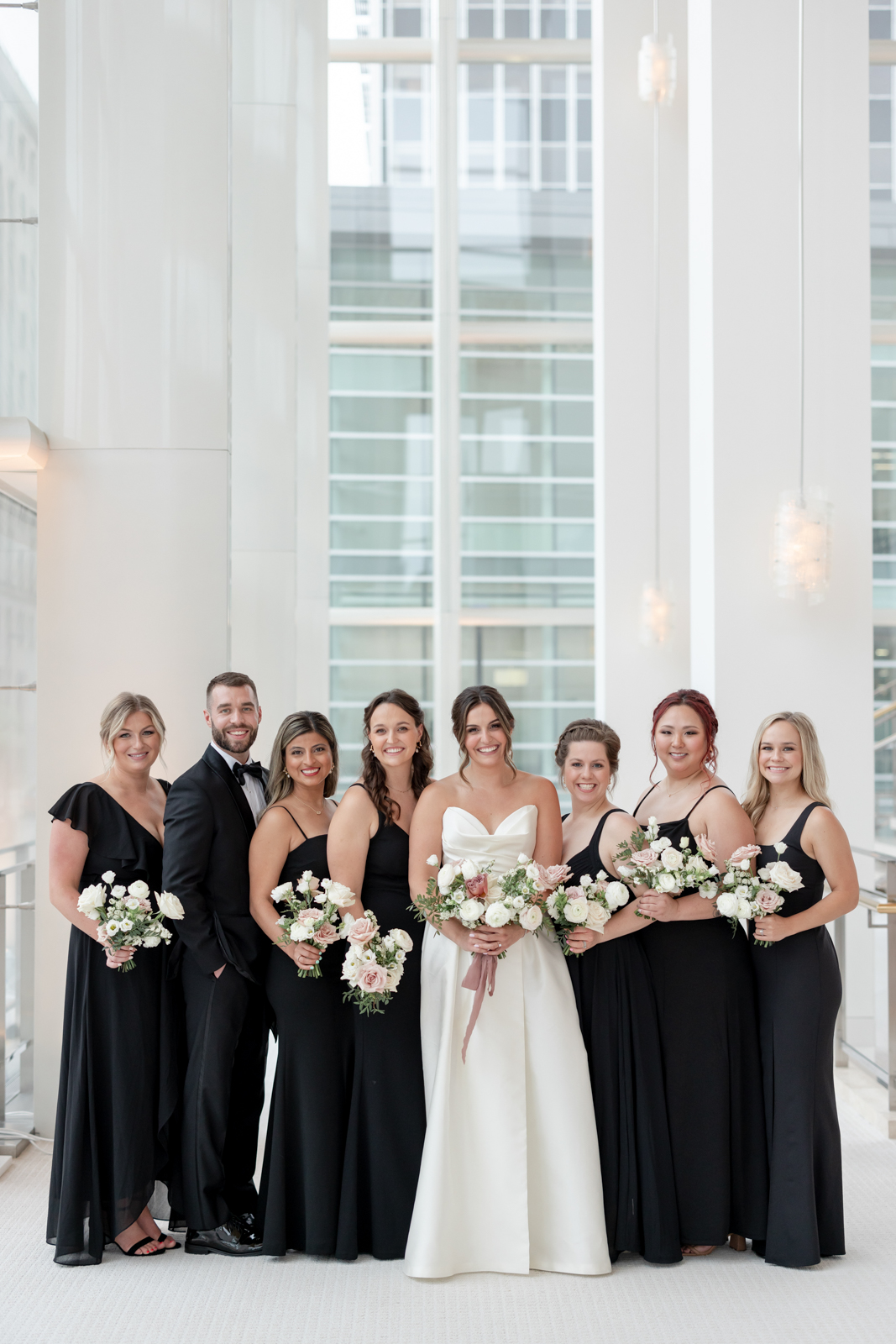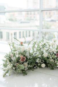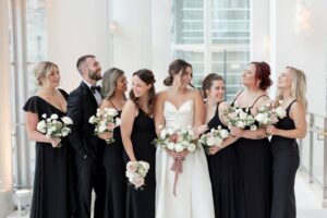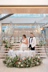 Kelsey and Zach’s classic enemies-to-lovers story unfolded on a stunning June wedding day at Madison’s Overture Center for the Arts. Against a timeless backdrop of sleek white, black, and gold details, their special day was pure elegance surrounded by romantic mauve and blush-toned garden florals and the joy of their loved ones! Their ceremony at the Madison Public Library featured a stunning grounded floral nest from 1209 Creative that seamlessly transitioned right across the street to the Overture Center lobby to surround their sweetheart table during the reception.