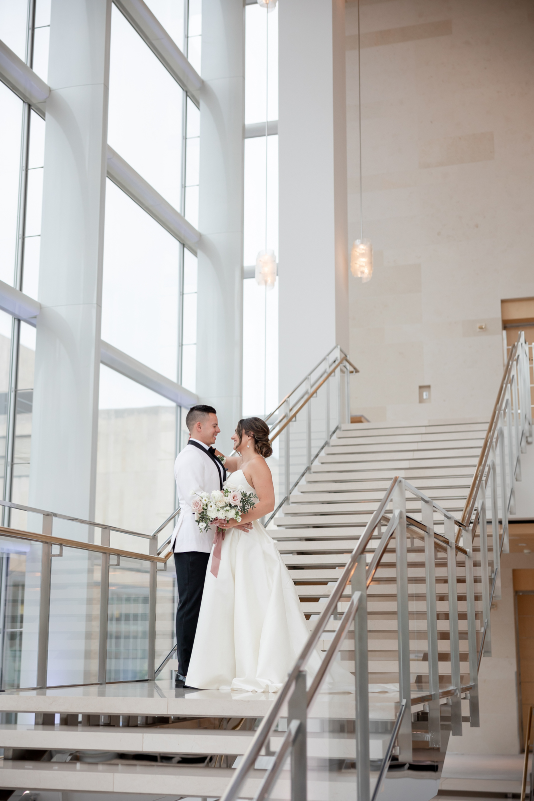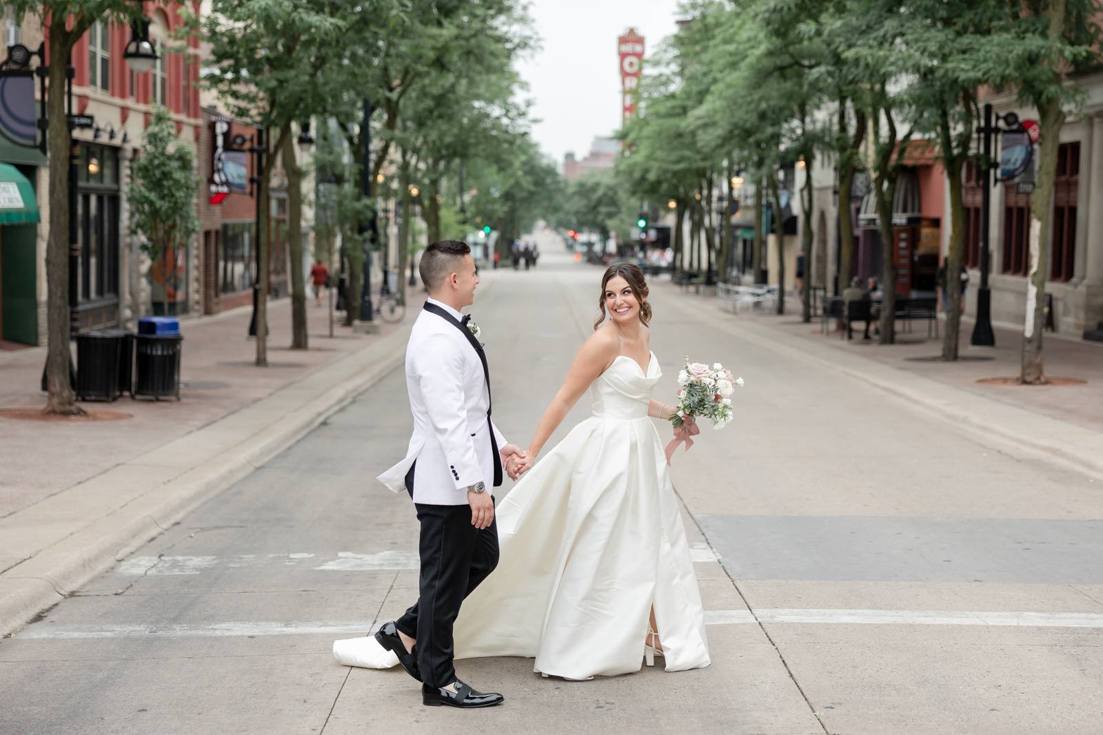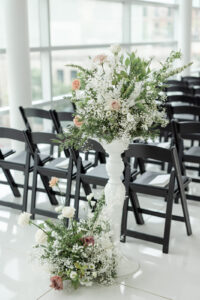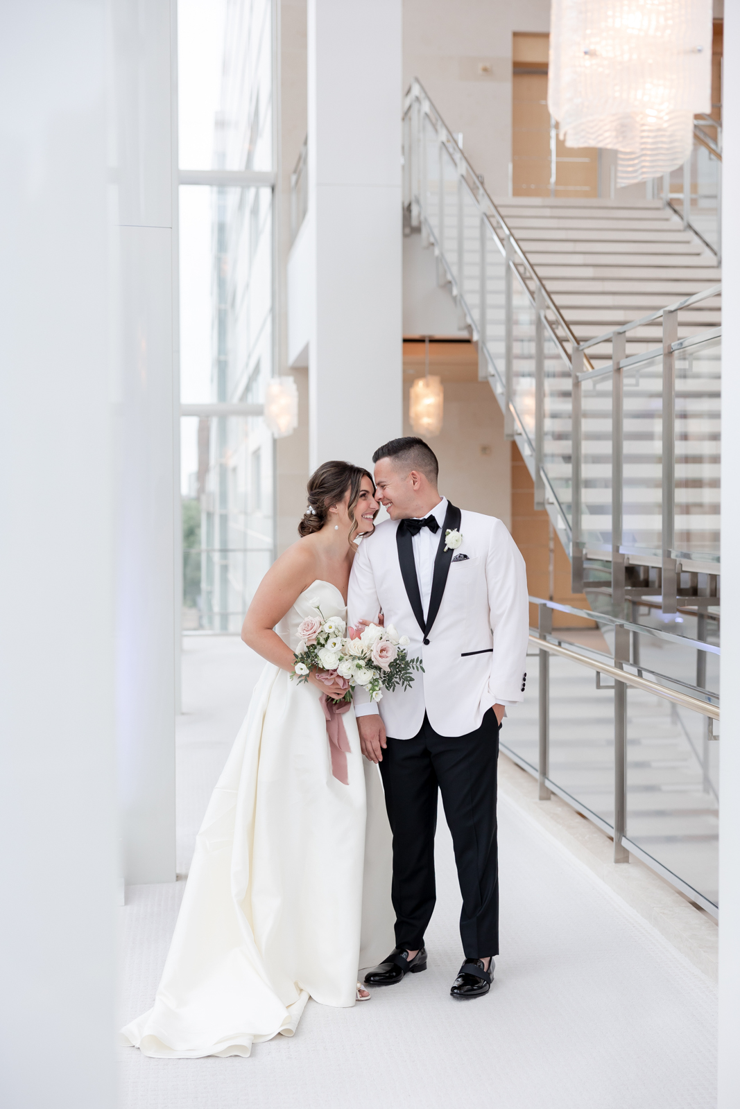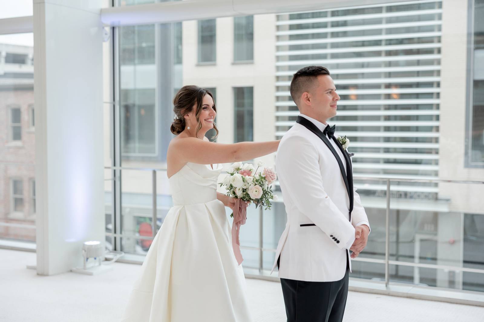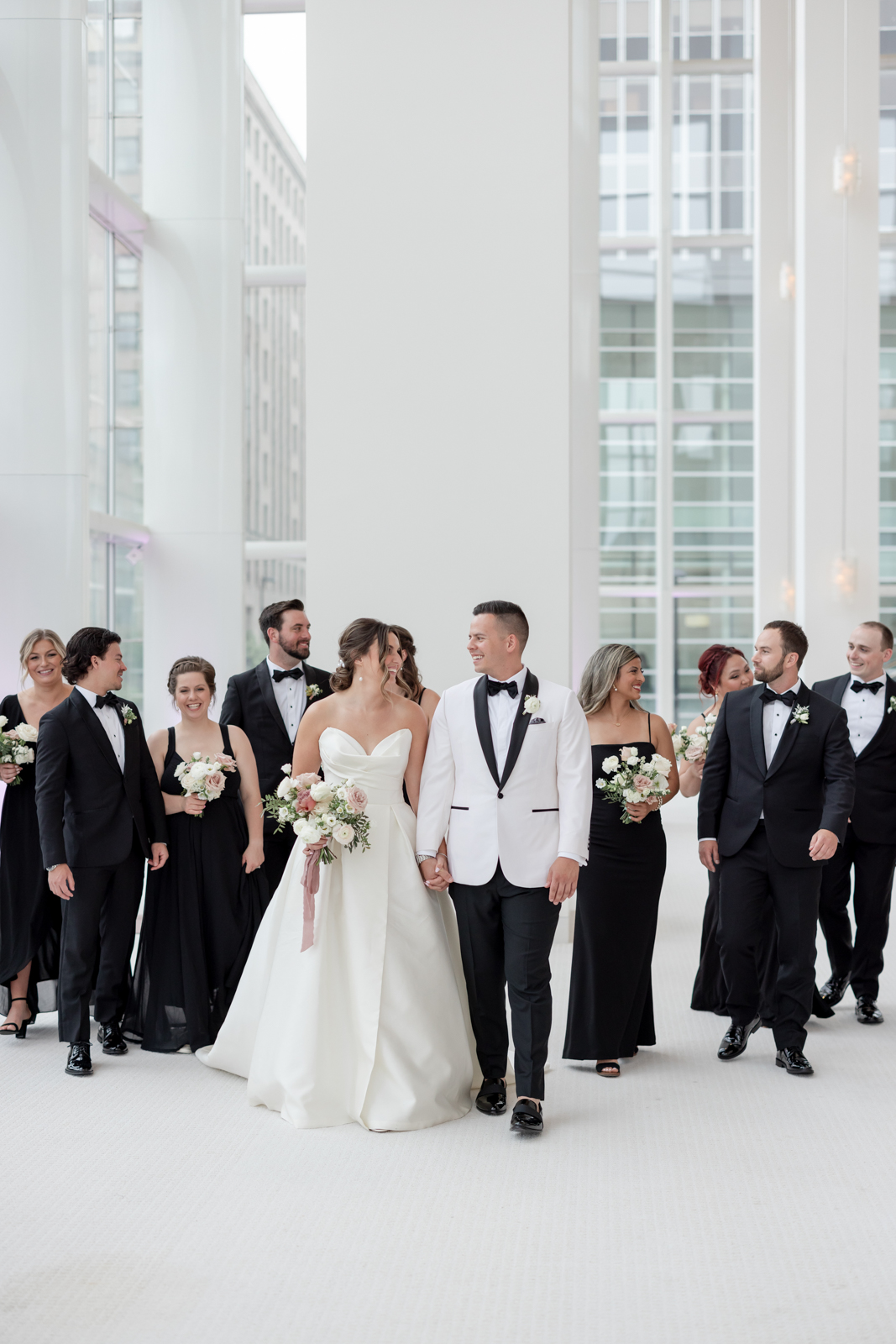 Kelsey and Zach’s classic enemies-to-lovers story unfolded on a stunning June wedding day at Madison’s Overture Center for the Arts. Against a timeless backdrop of sleek white, black, and gold details, their special day was pure elegance surrounded by romantic mauve and blush-toned garden florals and the joy of their loved ones! Their ceremony at the Madison Public Library featured a stunning grounded floral nest from 1209 Creative that seamlessly transitioned right across the street to the Overture Center lobby to surround their sweetheart table during the reception.