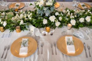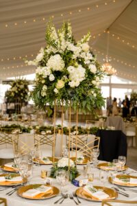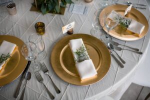 DID YOU USE ANY SPECIALTY TABLES, CHAIRS, LINENS OR DINNERWARE? Brand new chairs from Event Essentials and gold chargers.