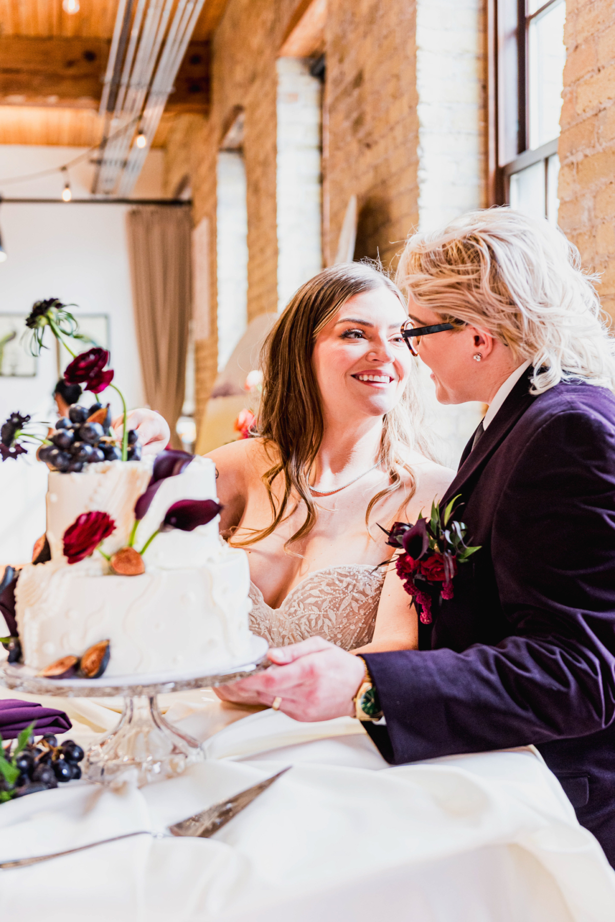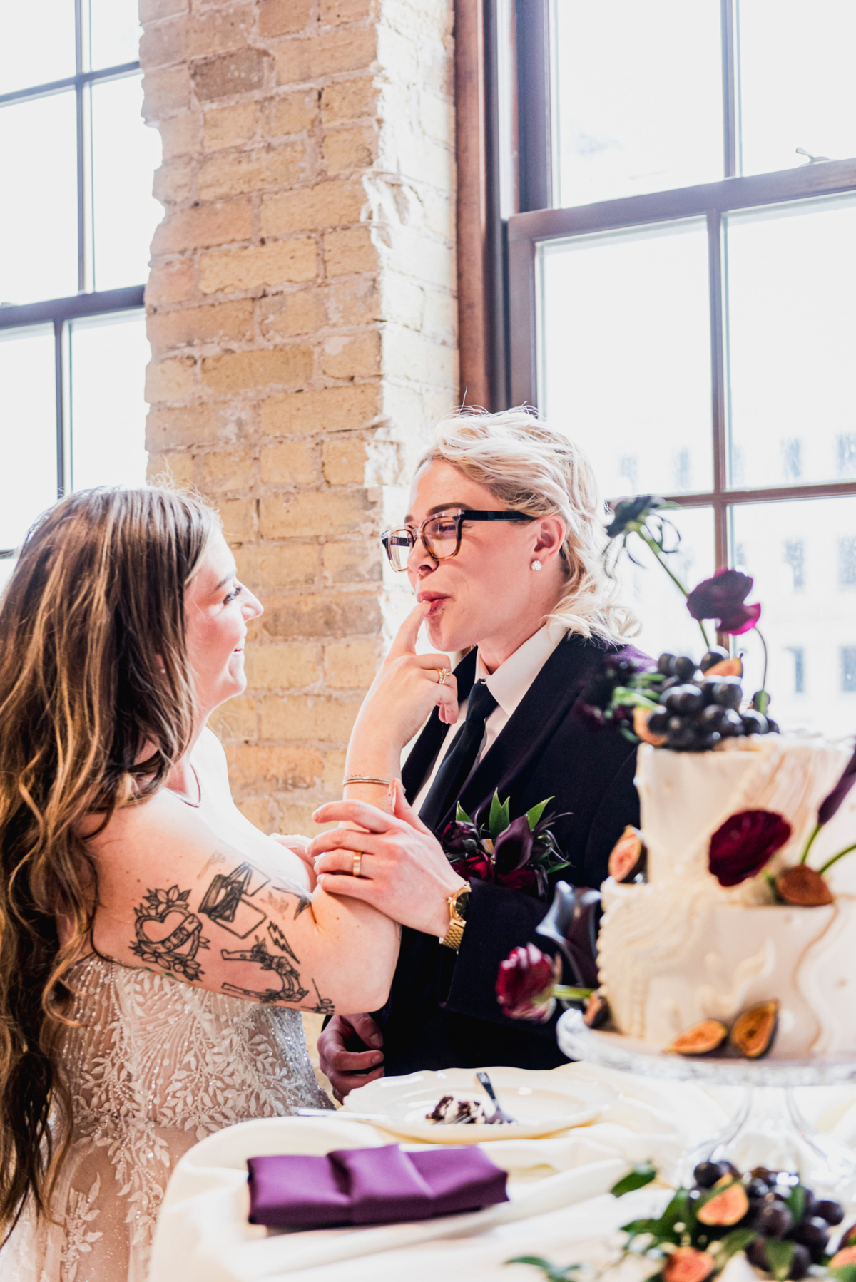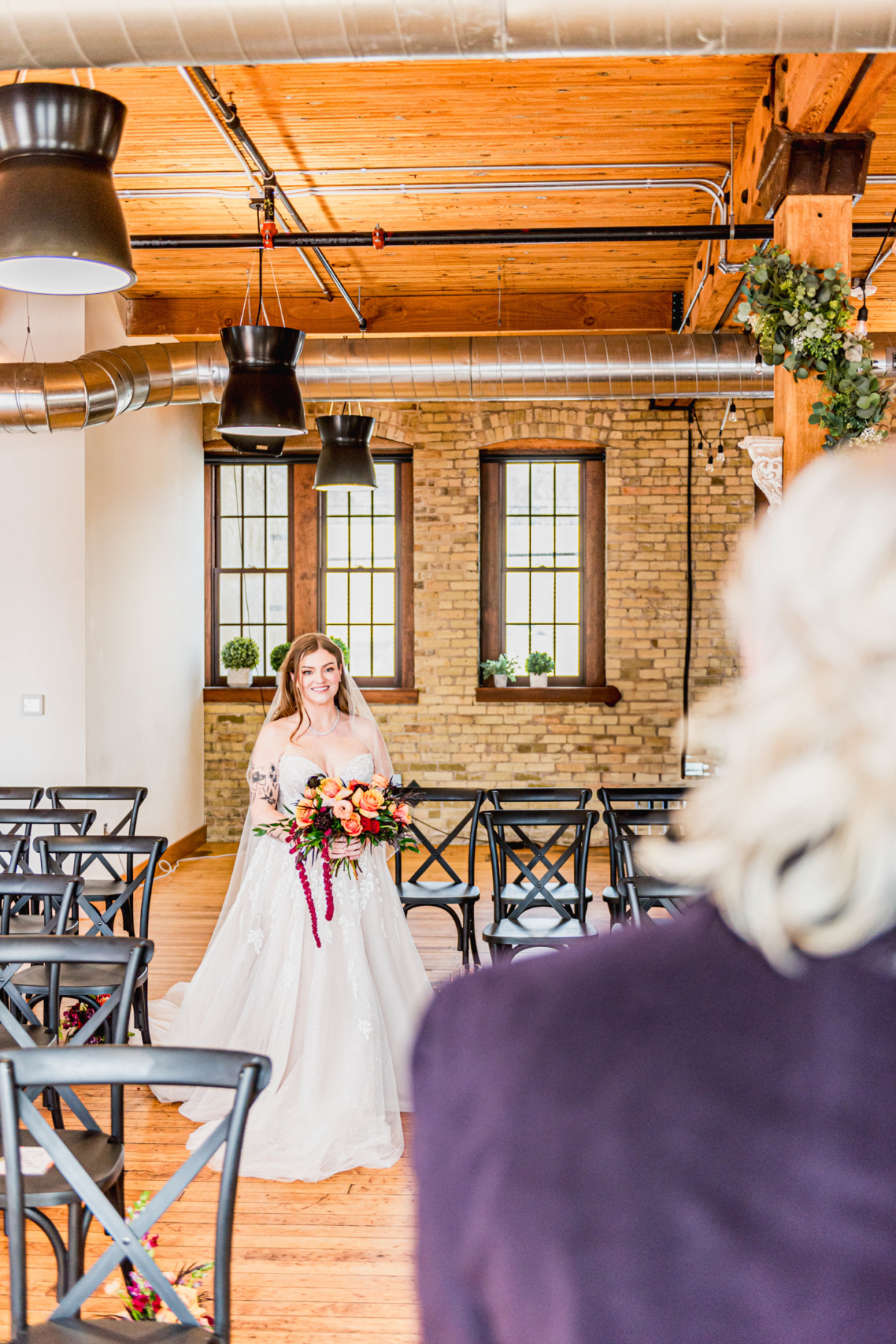 With its modern-industrial vibe, River Valley Historic Venue served as the perfect backdrop for this bold and vibrant editorial. Recently renovated to offer updated, comfortable spaces while preserving its original charm, the venue features 12-foot ceilings, exposed wooden beams, brick walls, and original hardwood floors–all bathed in gorgeous natural light that enhanced the colorful setup. Decor and black cross-back chairs from Relics Rentals added style and unity throughout the ceremony, grazing table, and bar areas.