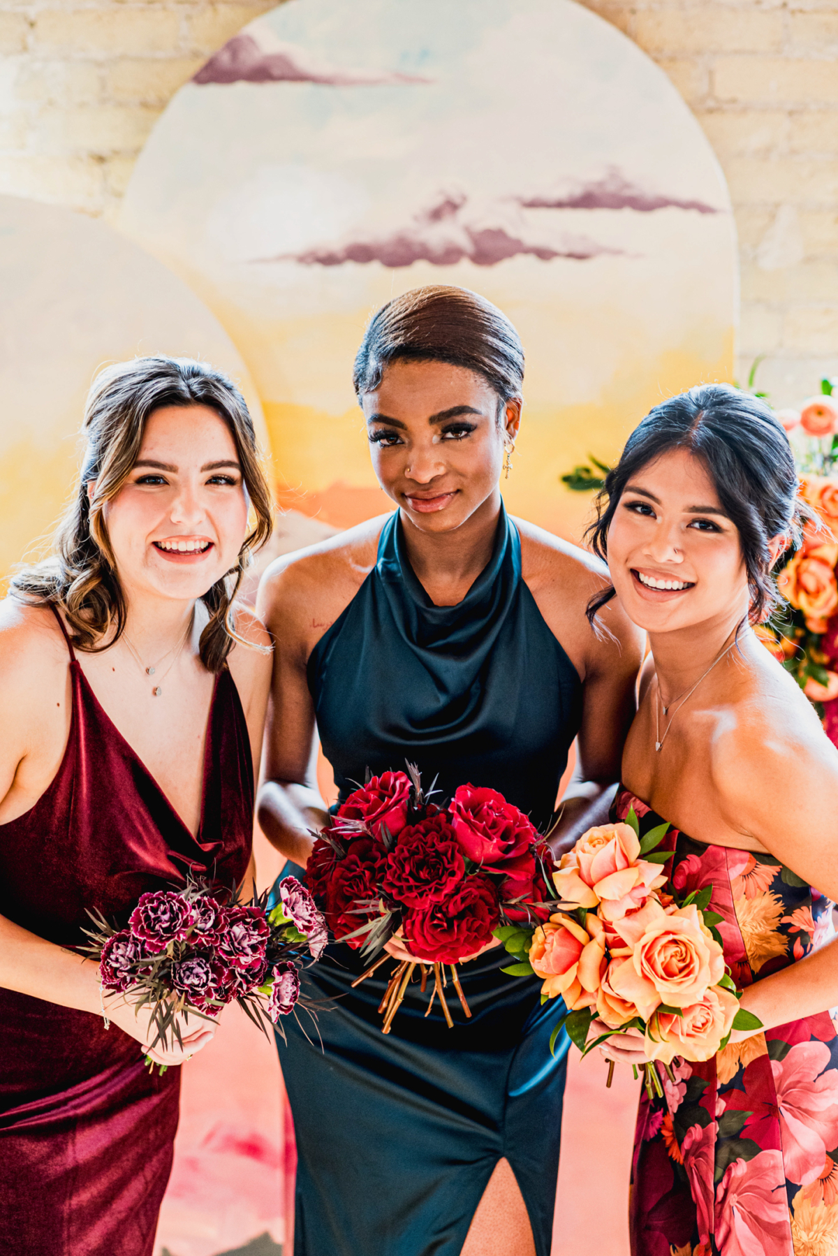 Each bridesmaid wore a different jewel-toned gown from Bella Bridesmaids, creating a bold, eclectic lineup that still felt cohesive. The maid of honor stood out in a playful, patterned mini dress, adding texture and personality to the group. To complete each look, Florasynthesis crafted petite, understated bouquets for every model, adding just the right touch of floral elegance.