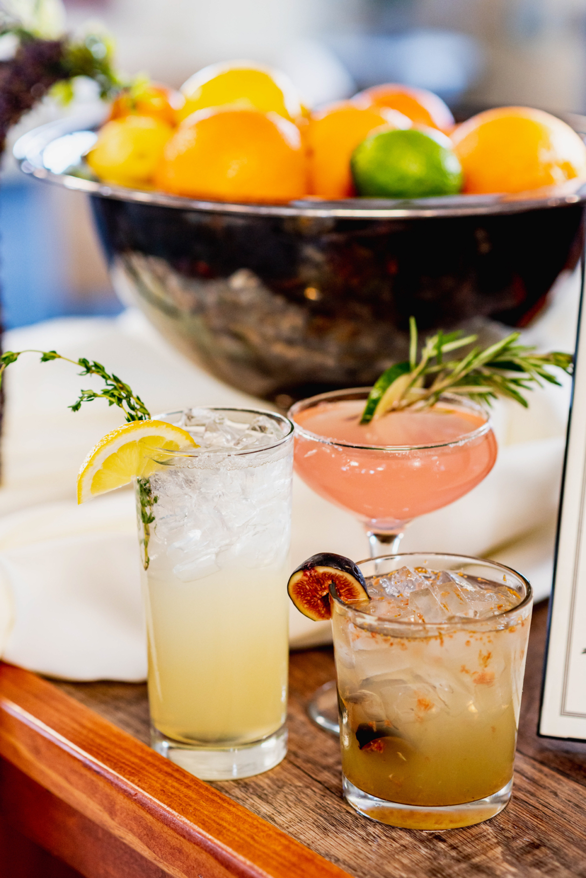 Cayla the Painter designed a striking stationery suite featuring distinctive fonts and hand-painted artwork. Inspired by the vivid tones of a glowing sunset, the color story centered on rich reds, oranges, yellows, and purples–balanced with crisp black-and-white details. One of her standout contributions was a custom three-panel ceremony backdrop, painted in soft clouds and sunset gradients with a moody silhouetted landscape. Her creative touch continued at the bar, where the theme flowed into a painted wine bottle and coordinating drink menu created in partnership with Over the Moon Bartending.