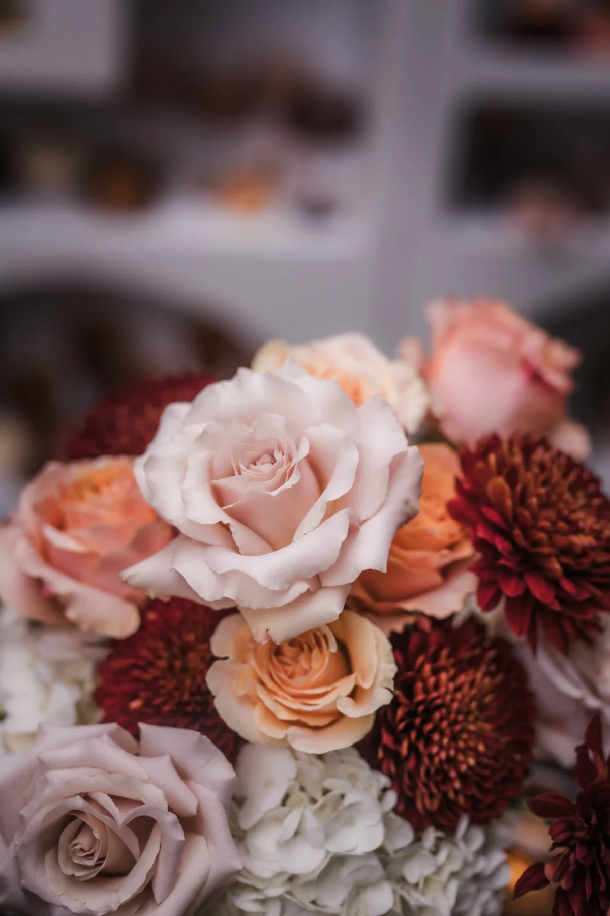 Melody Rose Designs selected seasonal colors and accents for the editorial, including a variety of white pumpkins–some used as vases!–and autumn leaves, along with florals and décor. She kept the florals warm and fresh, featuring champagne and peach roses, white hydrangeas, white cymbidium orchids, and rust-colored cremones.