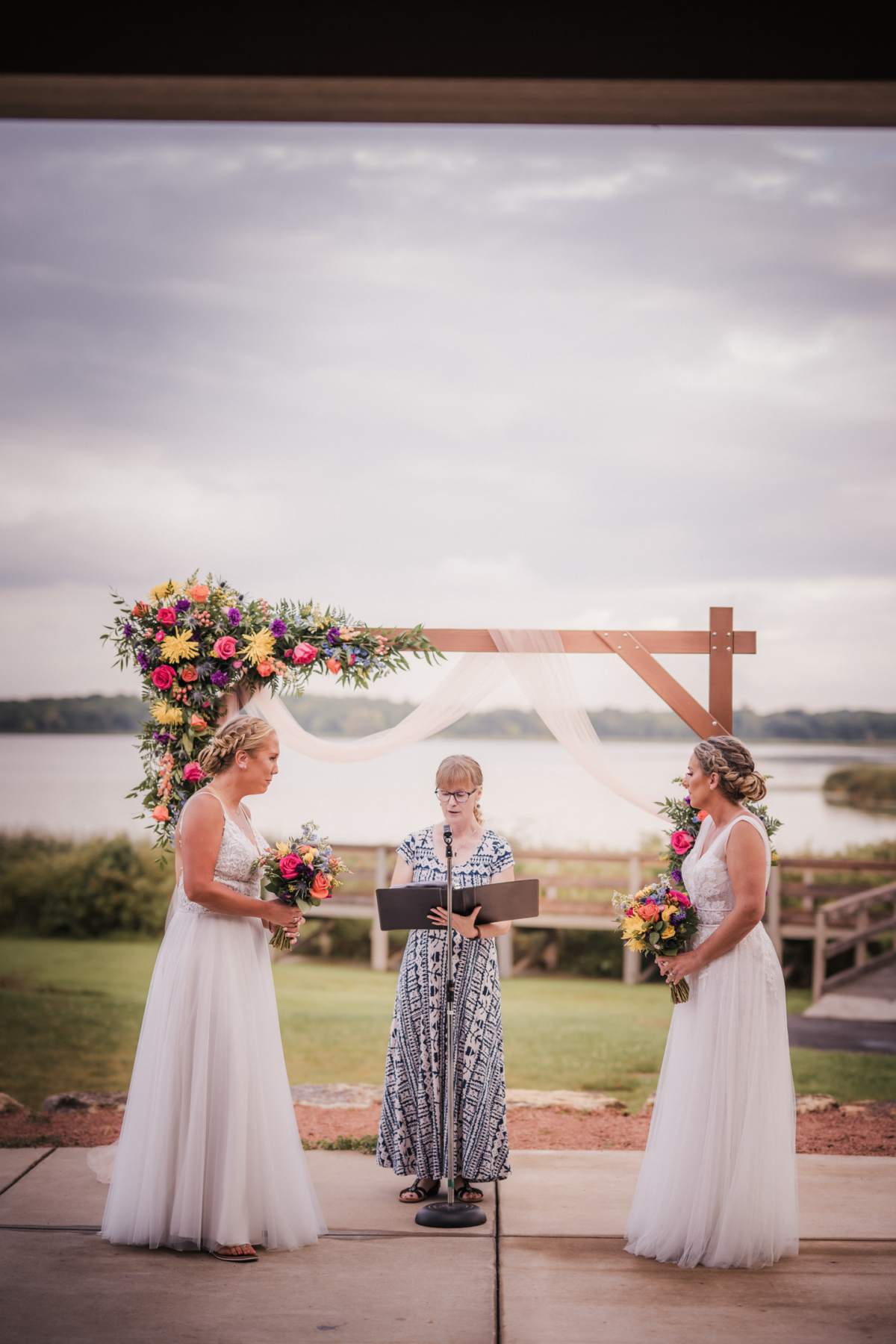 Bold florals and serene lakeside views make for a striking ceremony backdrop that captures the essence of summer in the Midwest. Vibrant blooms in rich, saturated colors pop against the natural blues and greens of the landscape, and open skies and horizon lines stretch across the water, making this setting a dreamy, picturesque canvas for your big moment.