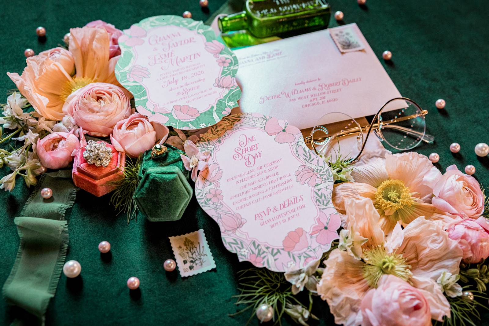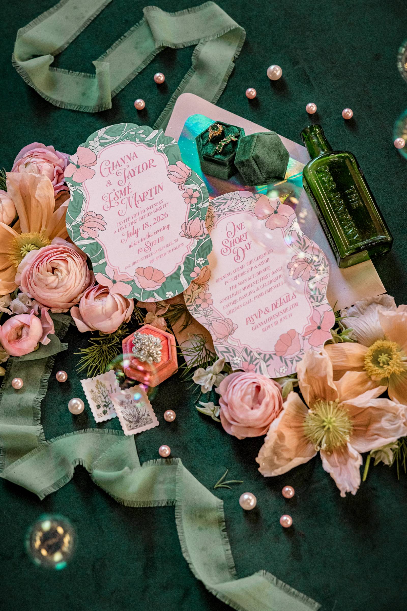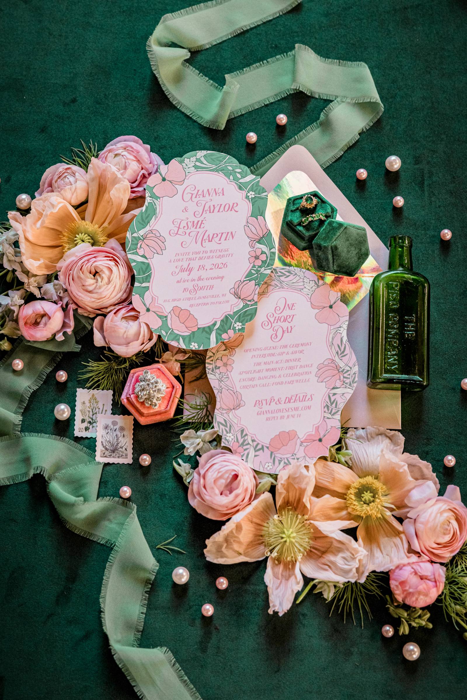 Vivacious. Modern. And completely enchanting. This Wicked-inspired styled shoot takes a playful nod from Broadway, transforming into a wedding design that's colorful, creative, and spell-binding. Set against the historic warmth of 10 South Venue, the shoot pairs layered paper details, lush floral moments, and dreamy fashion with a palette of softened greens and pinks for a romantic take on a beloved story. Designed with magic in every detail, it's a must-see for couples wanting something artful and cinematic.