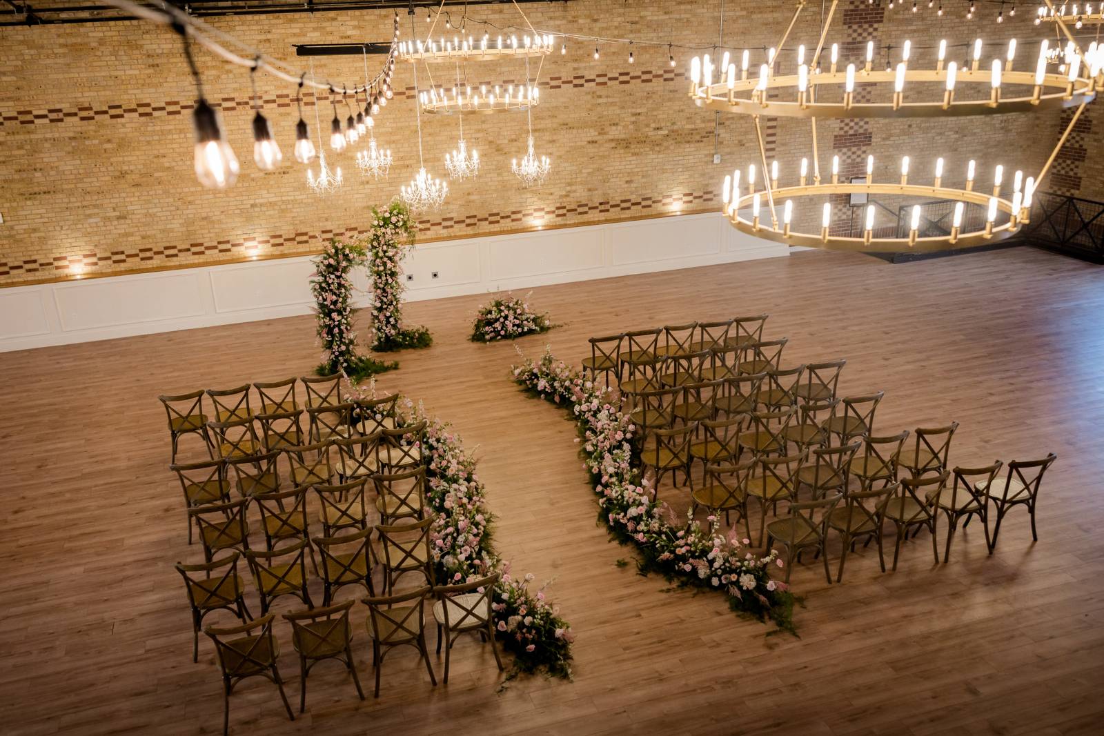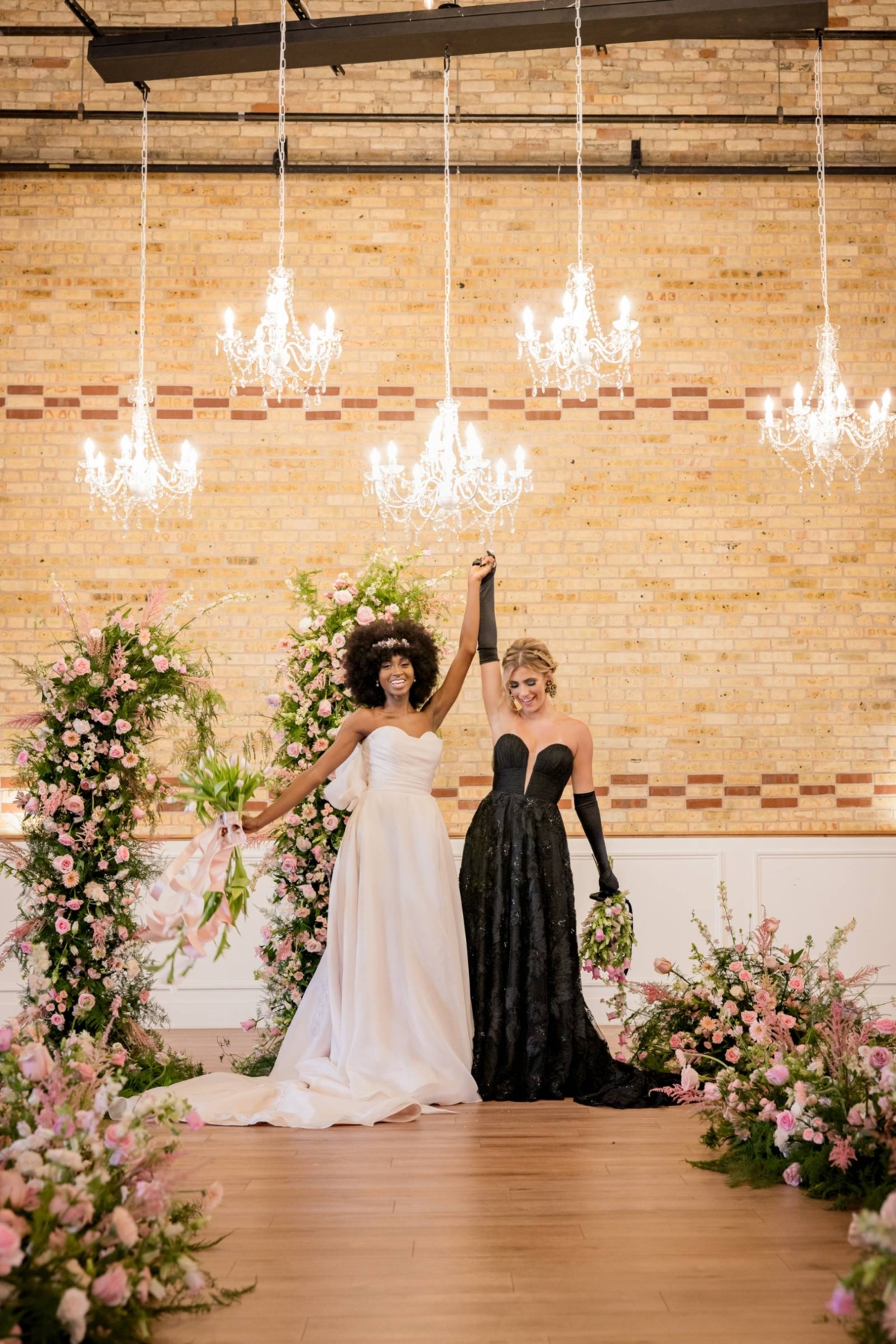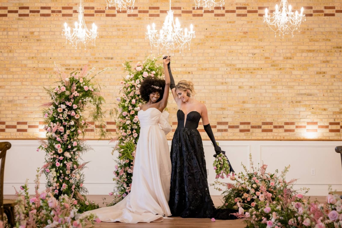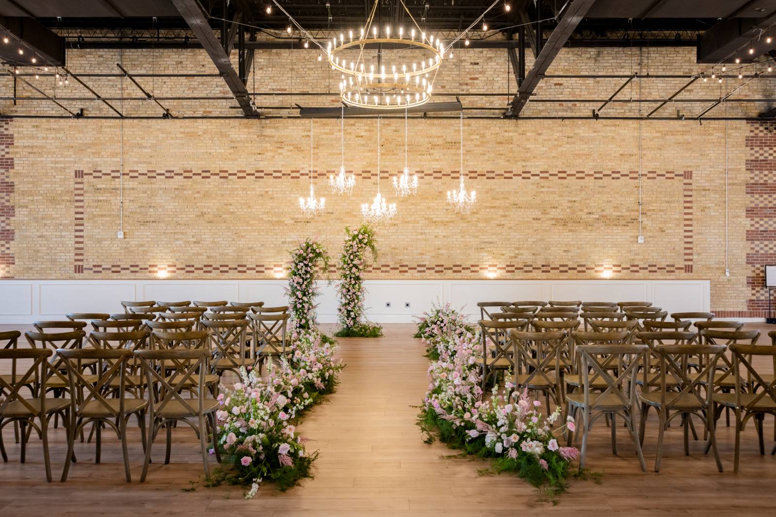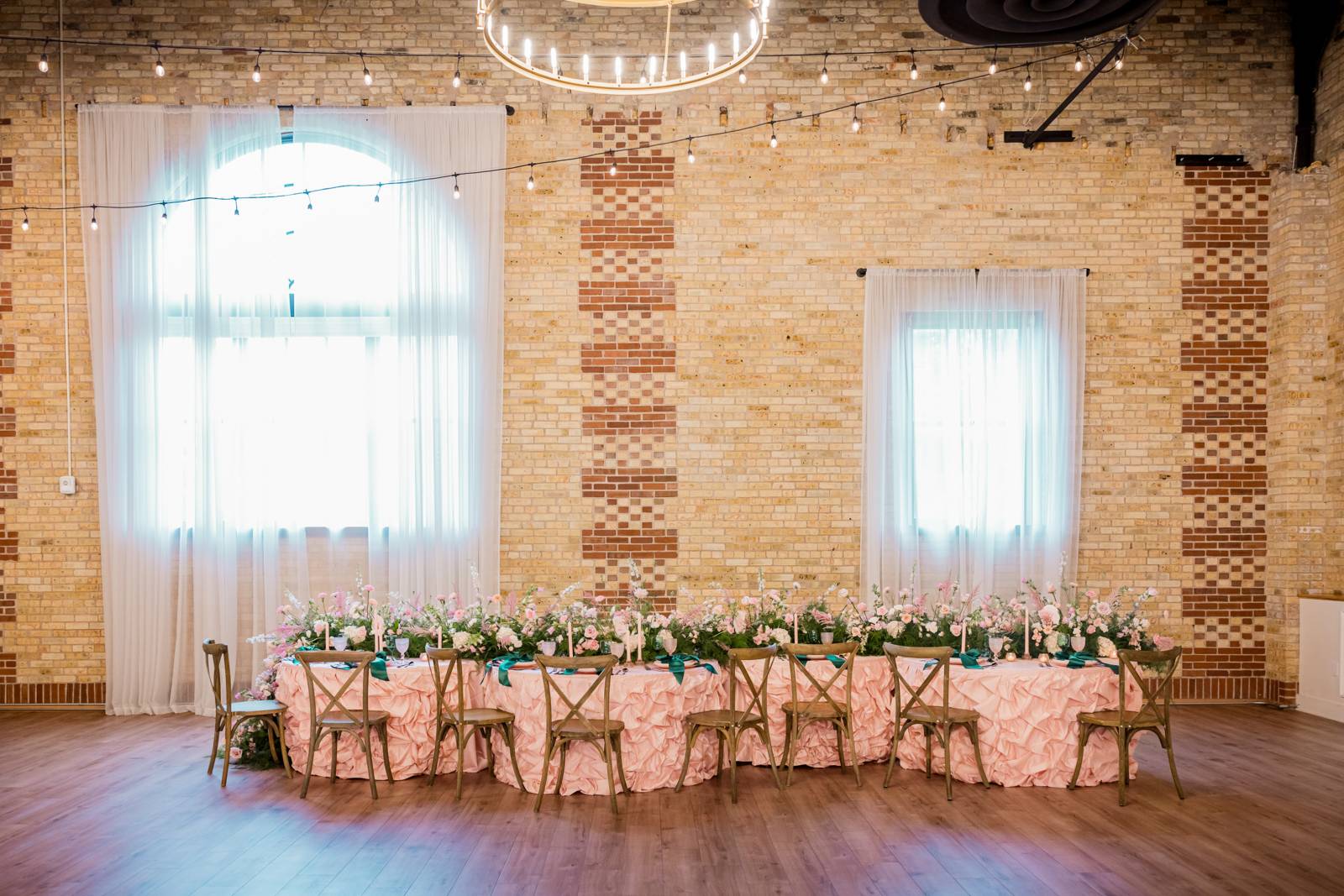 Located in Janesville, 10 South has a variety of indoor and outdoor spaces that can easily transform for any color scheme or theme. This styled shoot fit in perfectly in the Main Hall, with warm brick backdrops, wooden floors, and overhead chandeliers. The Main Hall is also equipped with a beautiful bar for delicious, custom, in-house drinks.