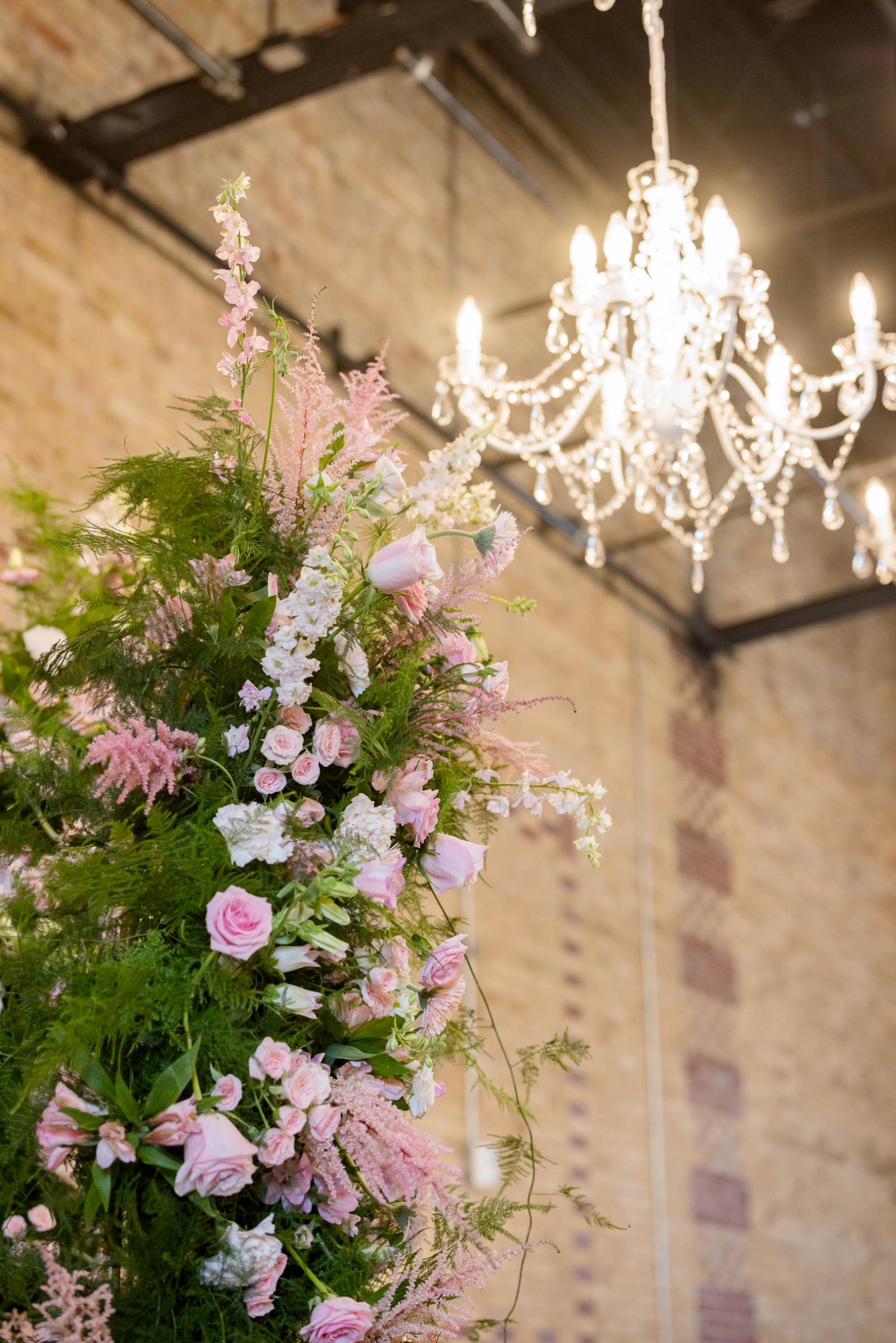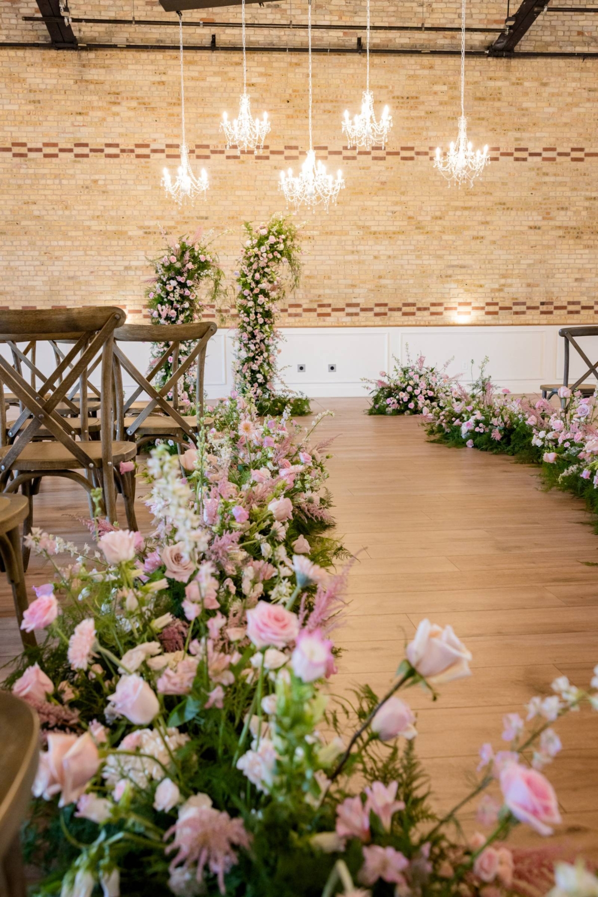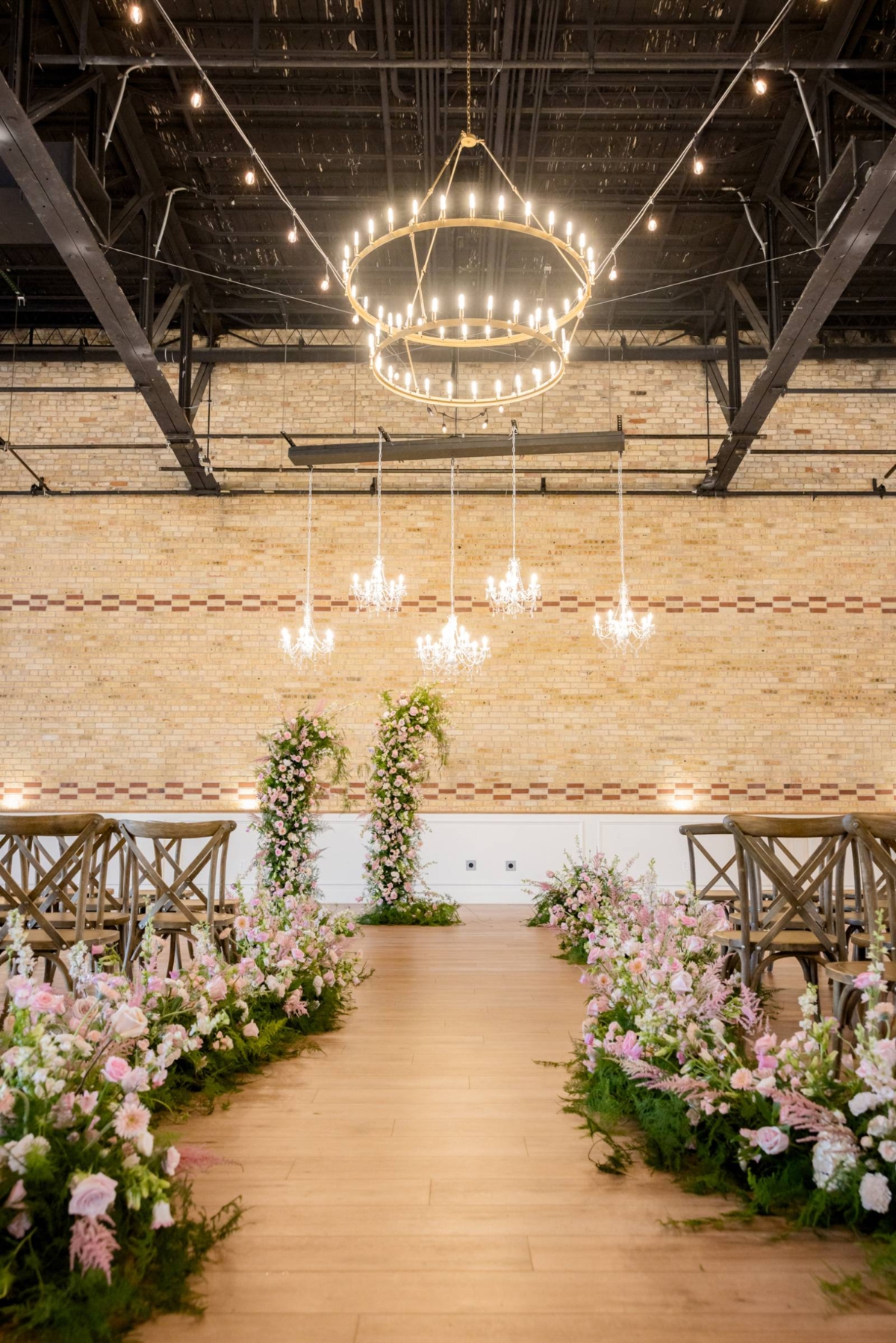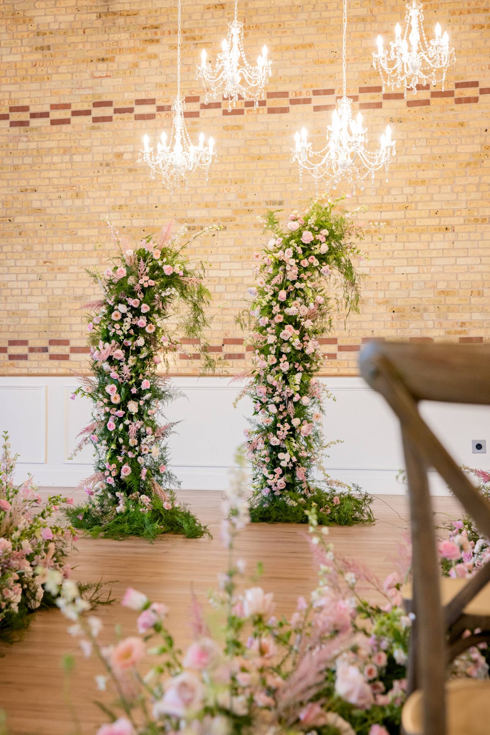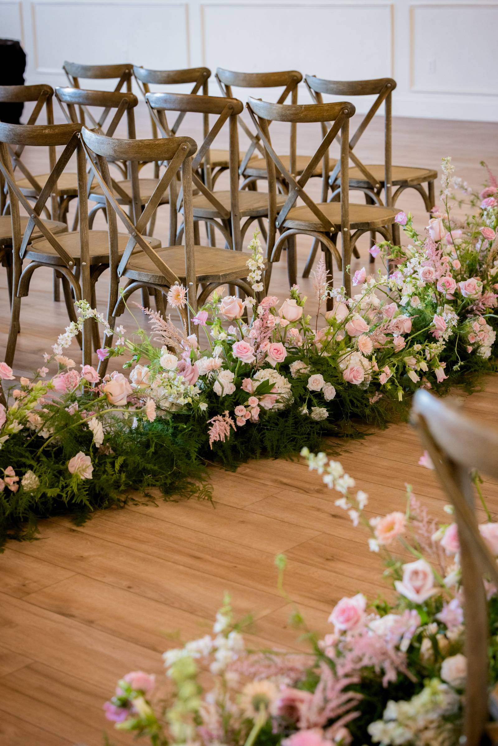 Through lush floral arrangements, backdrops, installations, and rentals, Melody Rose Designs & Melody Rose Decor & Rental elevated every scene in this wedding design. Beginning at the ceremony, the aisle was set into a subtle serpentine shape, guided by pink blooms on either side. The backdrop was similarly whimsical, with a unique broken arch setup with both pieces facing the same direction.