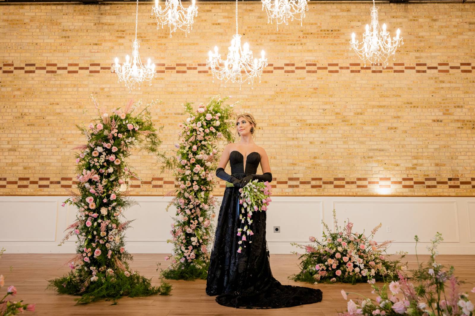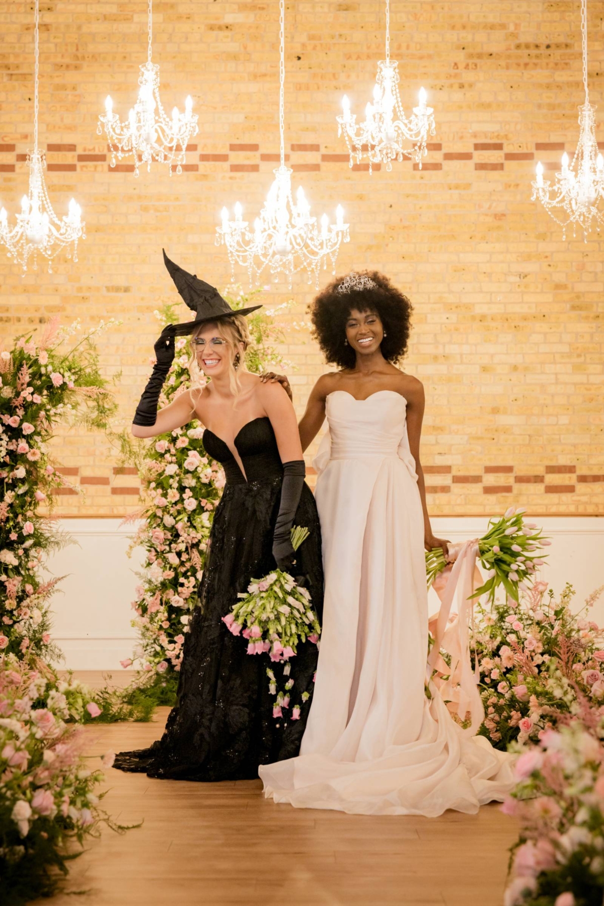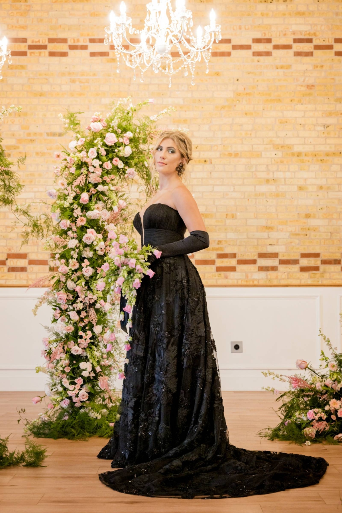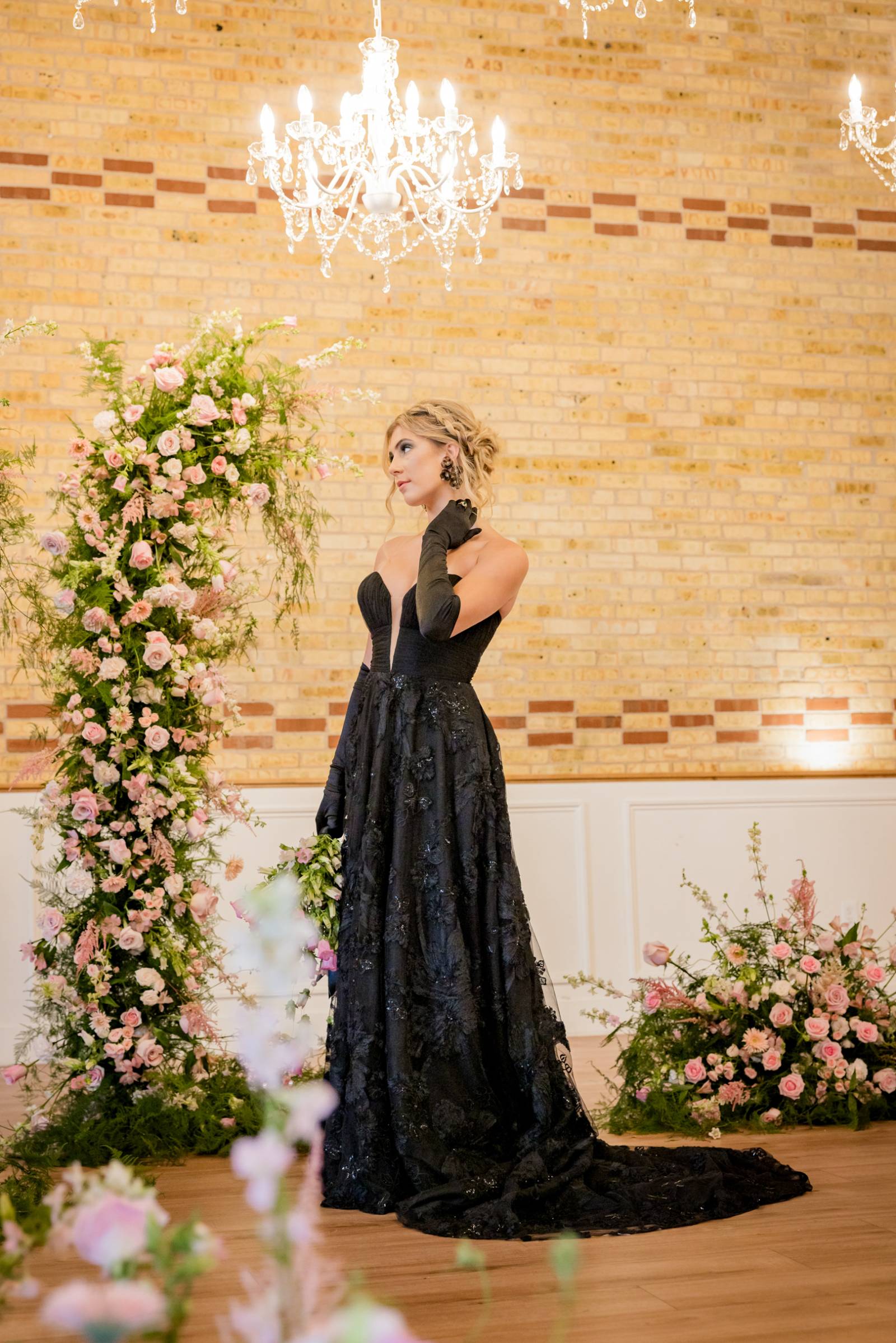 Bon Bon Belle provided model Grace’s dramatic, non-traditional black gown for moody, Elphaba vibes. Also strapless, this stunning gown had a deep-v neckline, a ruched bodice, and an embroidered and beaded tulle overlay skirt. She was accessorized with luxe black gloves, an emerald ring, and statement earrings. Later, a pointed hat and quirky round eyeglasses were added for a few photos as a playful nod to the witchy aesthetic.
