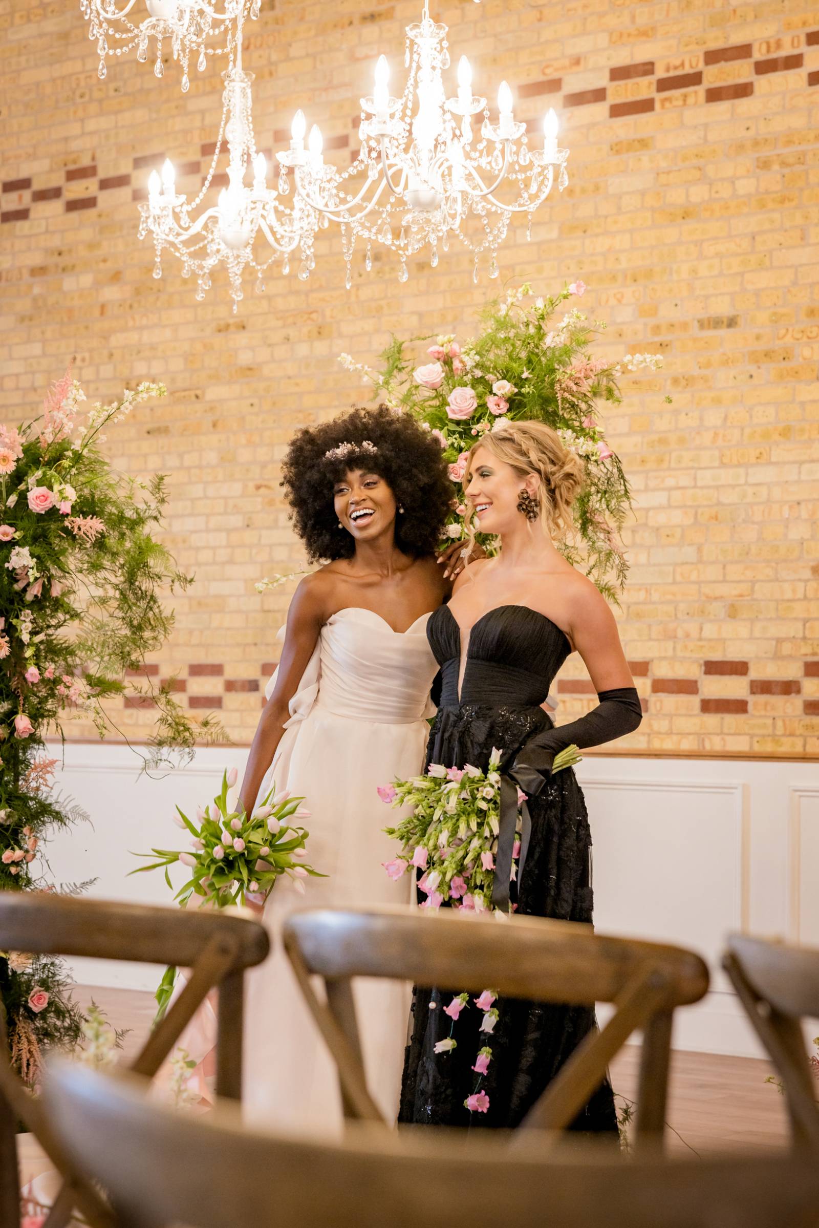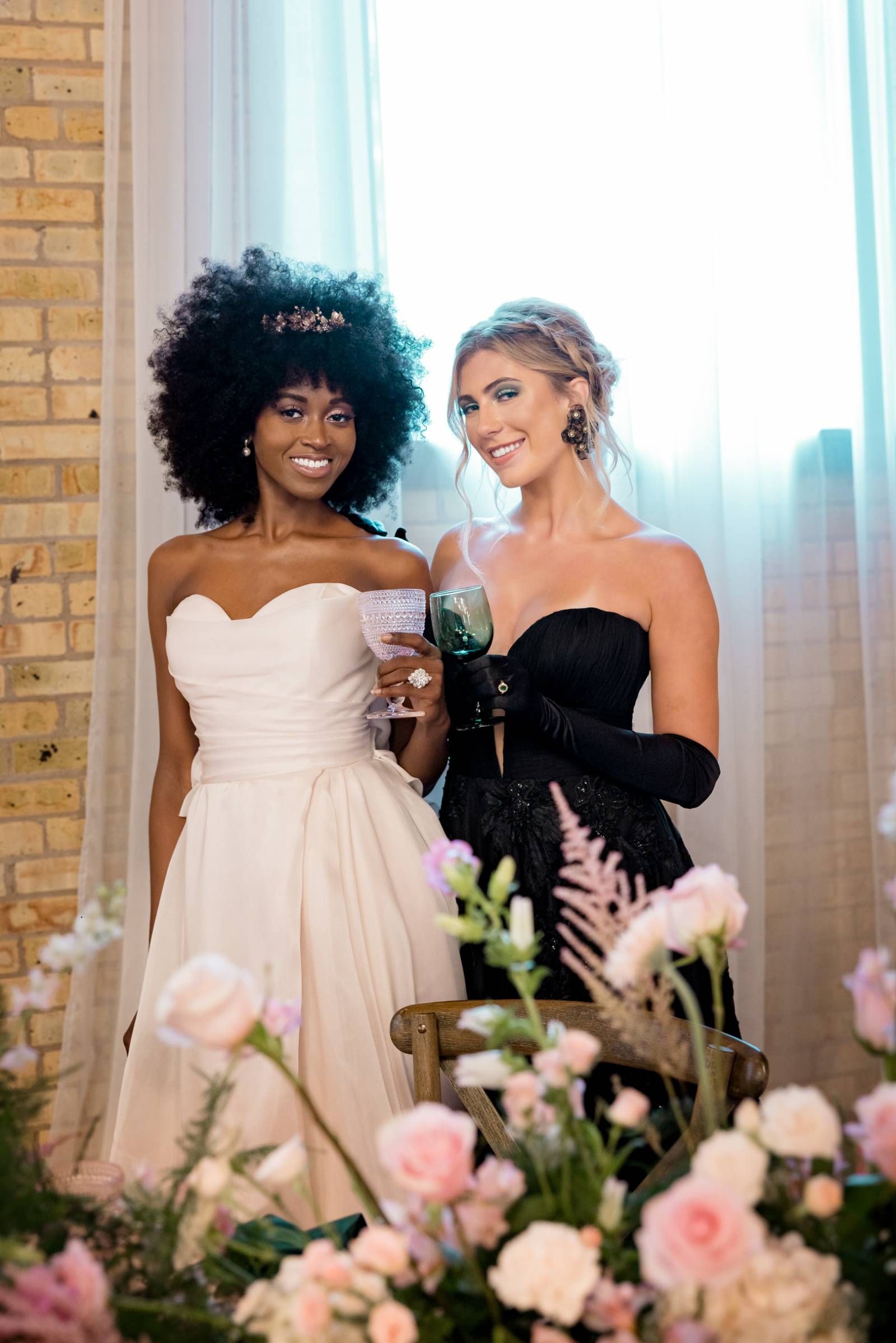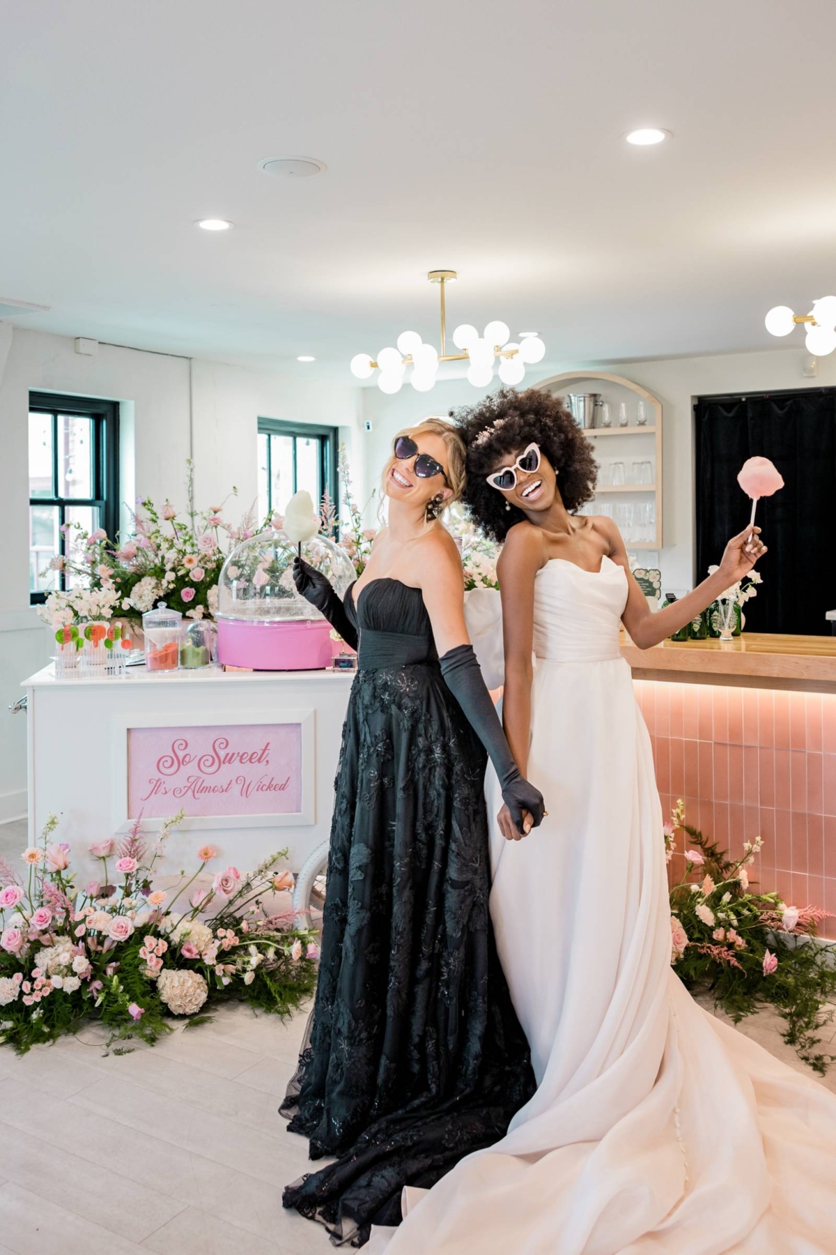 Bon Bon Belle provided model Grace’s dramatic, non-traditional black gown for moody, Elphaba vibes. Also strapless, this stunning gown had a deep-v neckline, a ruched bodice, and an embroidered and beaded tulle overlay skirt. She was accessorized with luxe black gloves, an emerald ring, and statement earrings. Later, a pointed hat and quirky round eyeglasses were added for a few photos as a playful nod to the witchy aesthetic.