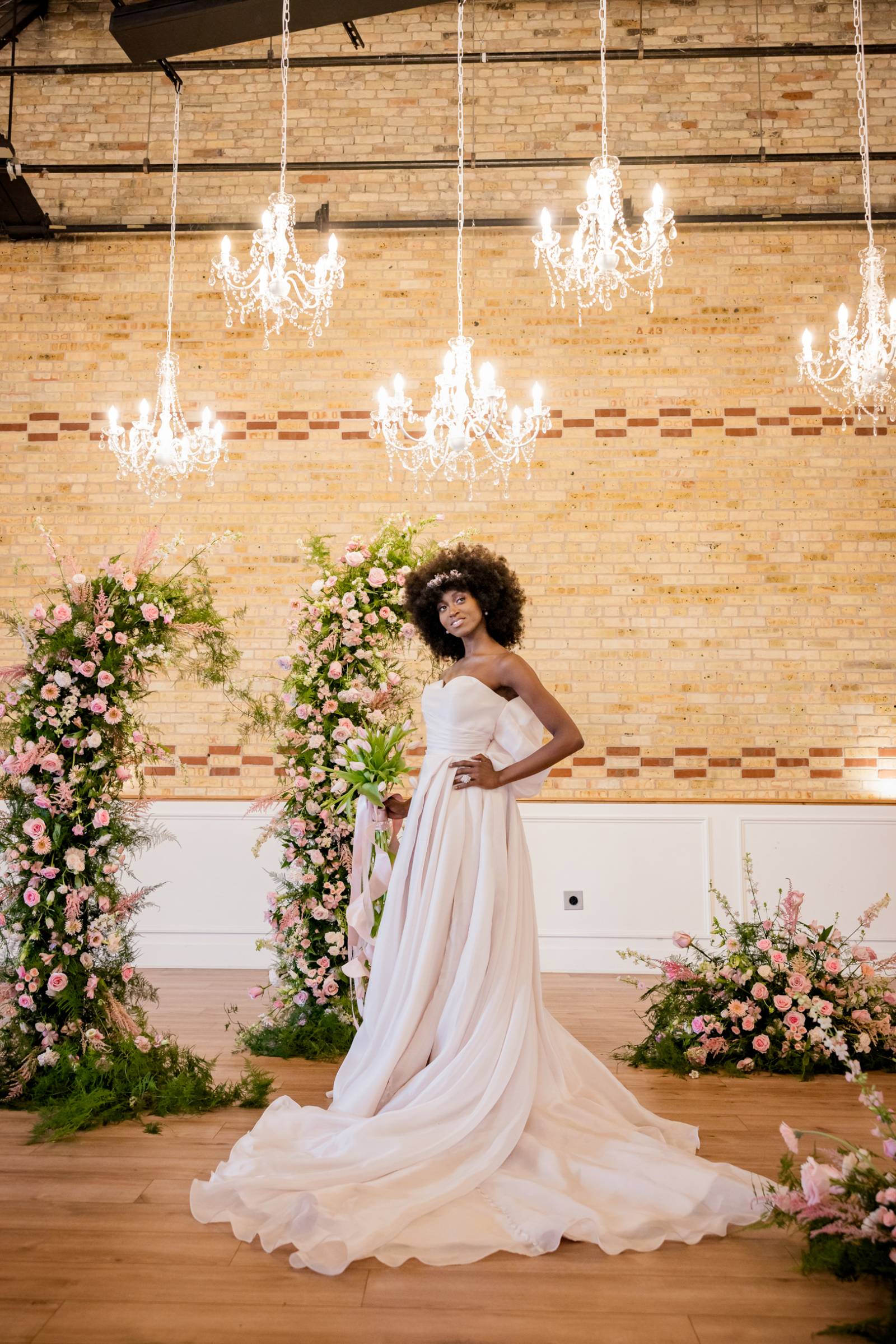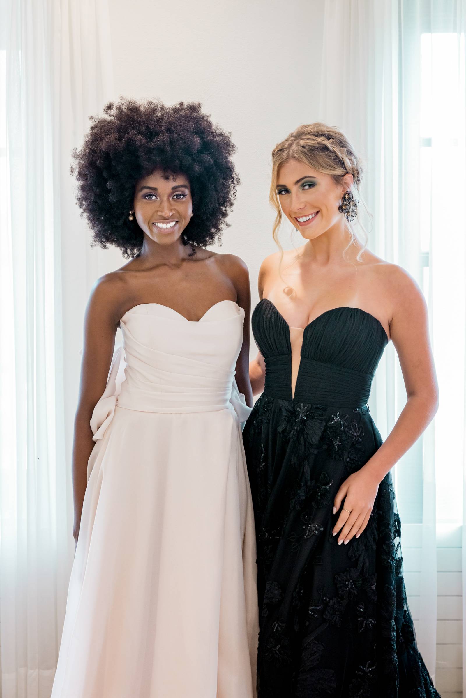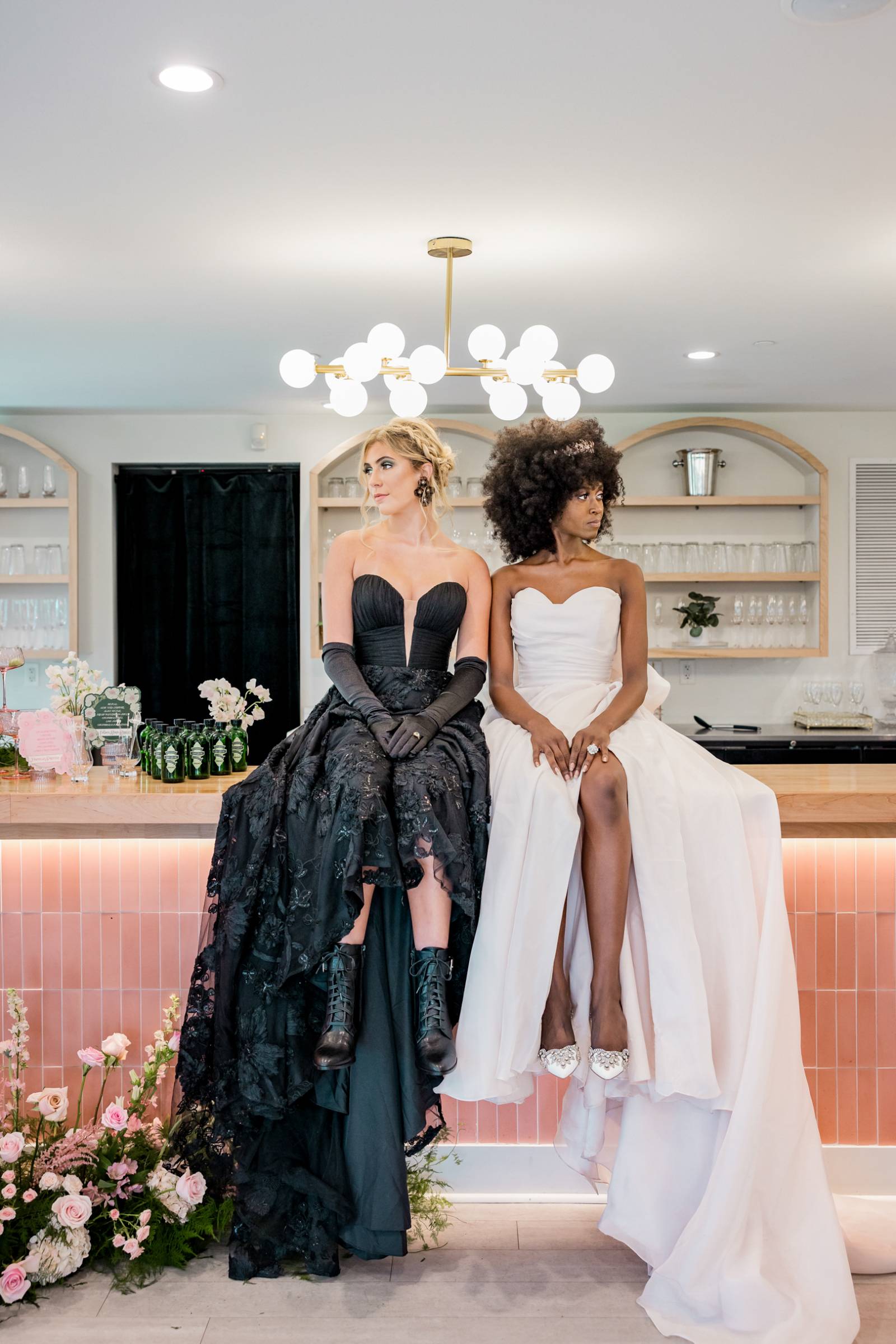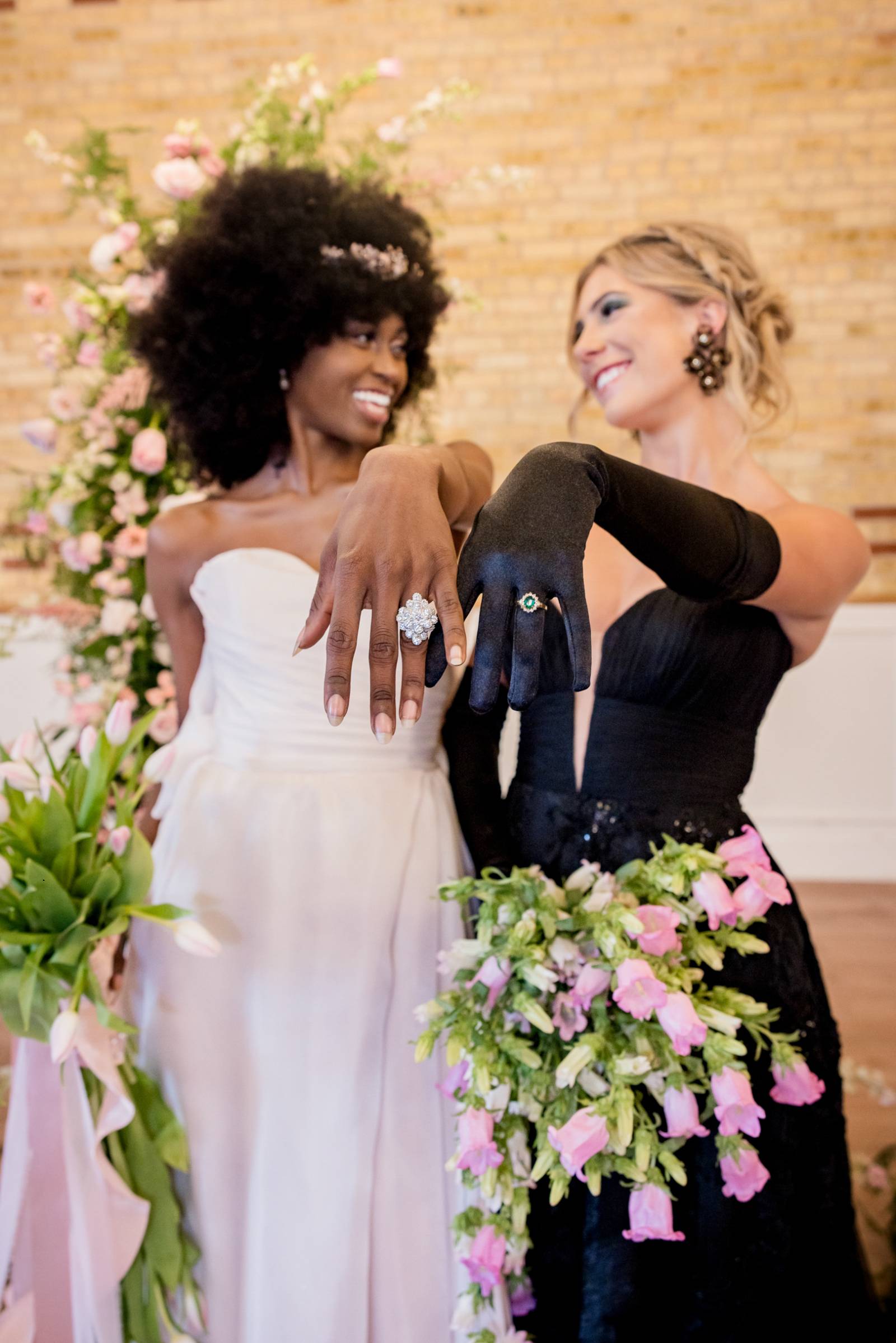 Bon Bon Belle provided model Grace’s dramatic, non-traditional black gown for moody, Elphaba vibes. Also strapless, this stunning gown had a deep-v neckline, a ruched bodice, and an embroidered and beaded tulle overlay skirt. She was accessorized with luxe black gloves, an emerald ring, and statement earrings. Later, a pointed hat and quirky round eyeglasses were added for a few photos as a playful nod to the witchy aesthetic.