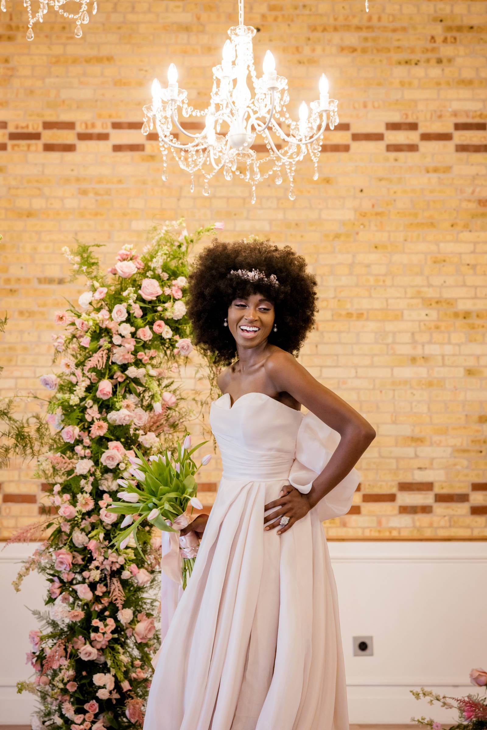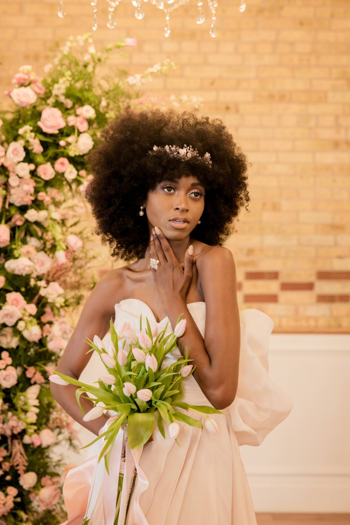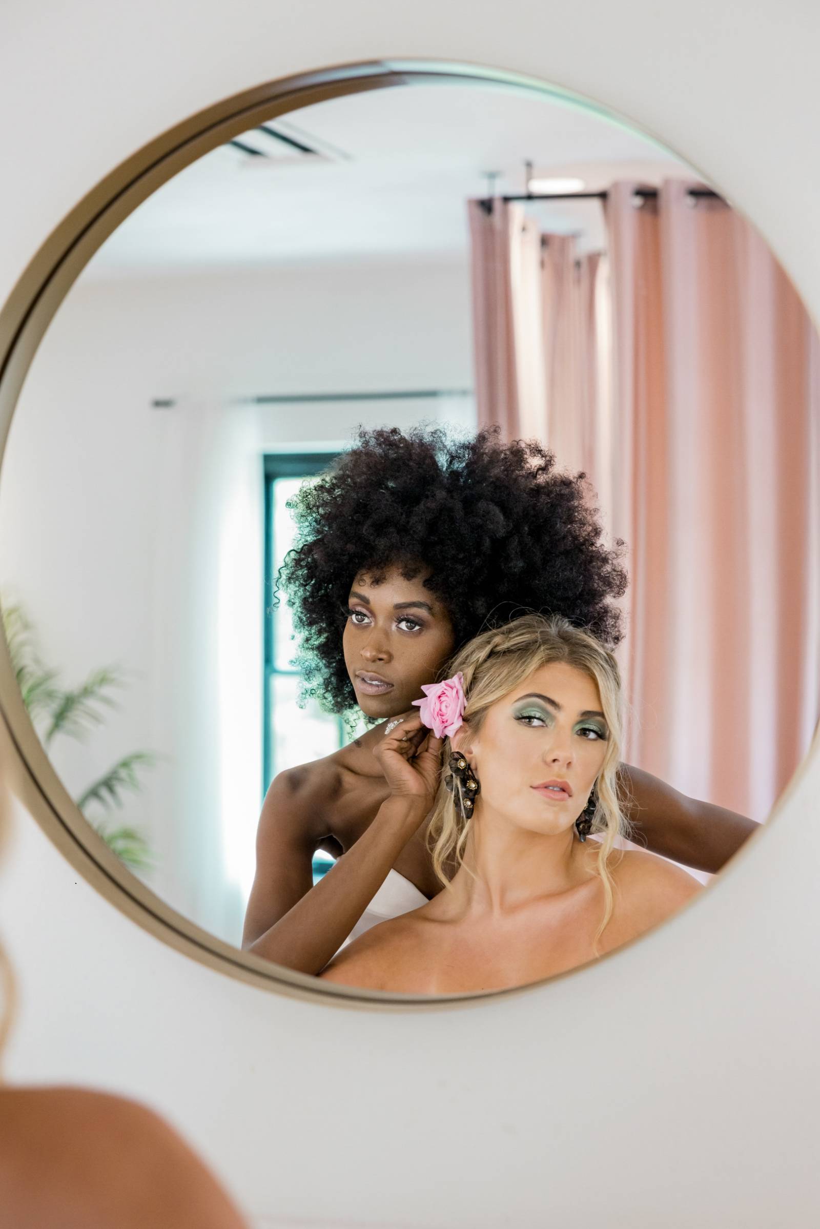 Melissa Ann Artistry + Co. styled each of the brides with bold, colorful eyeshadows matching the color scheme of their inspirational characters. Julia had pearly pink eyeshadow, cat-eye eyeliner, and a soft lip. Her hair was styled to accentuate her natural texture and softly frame her face. Grace wore a green lid with a smoky crease, black cat-eye eyeliner, and a peach lip. Her hair was styled into a loose, braided updo.