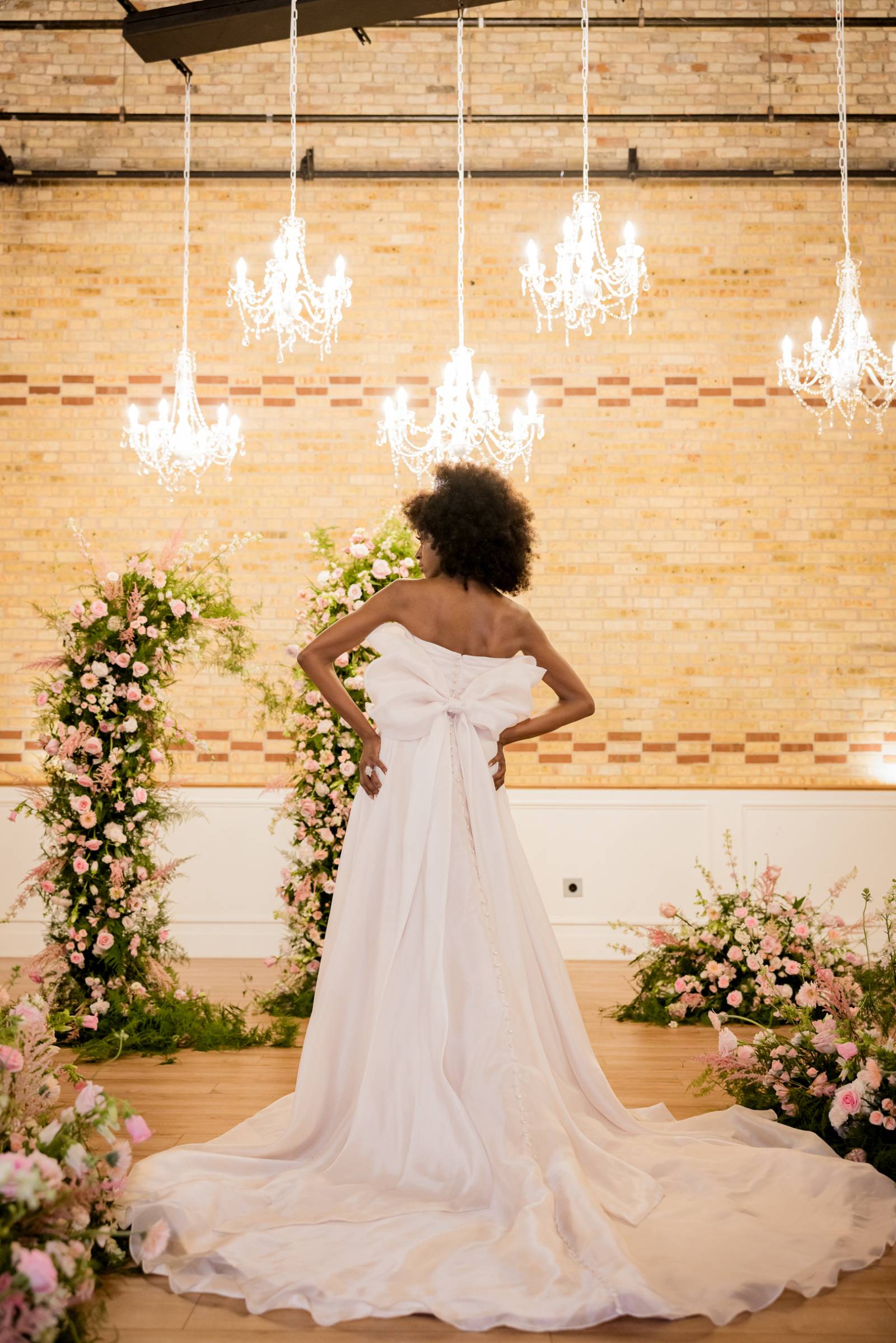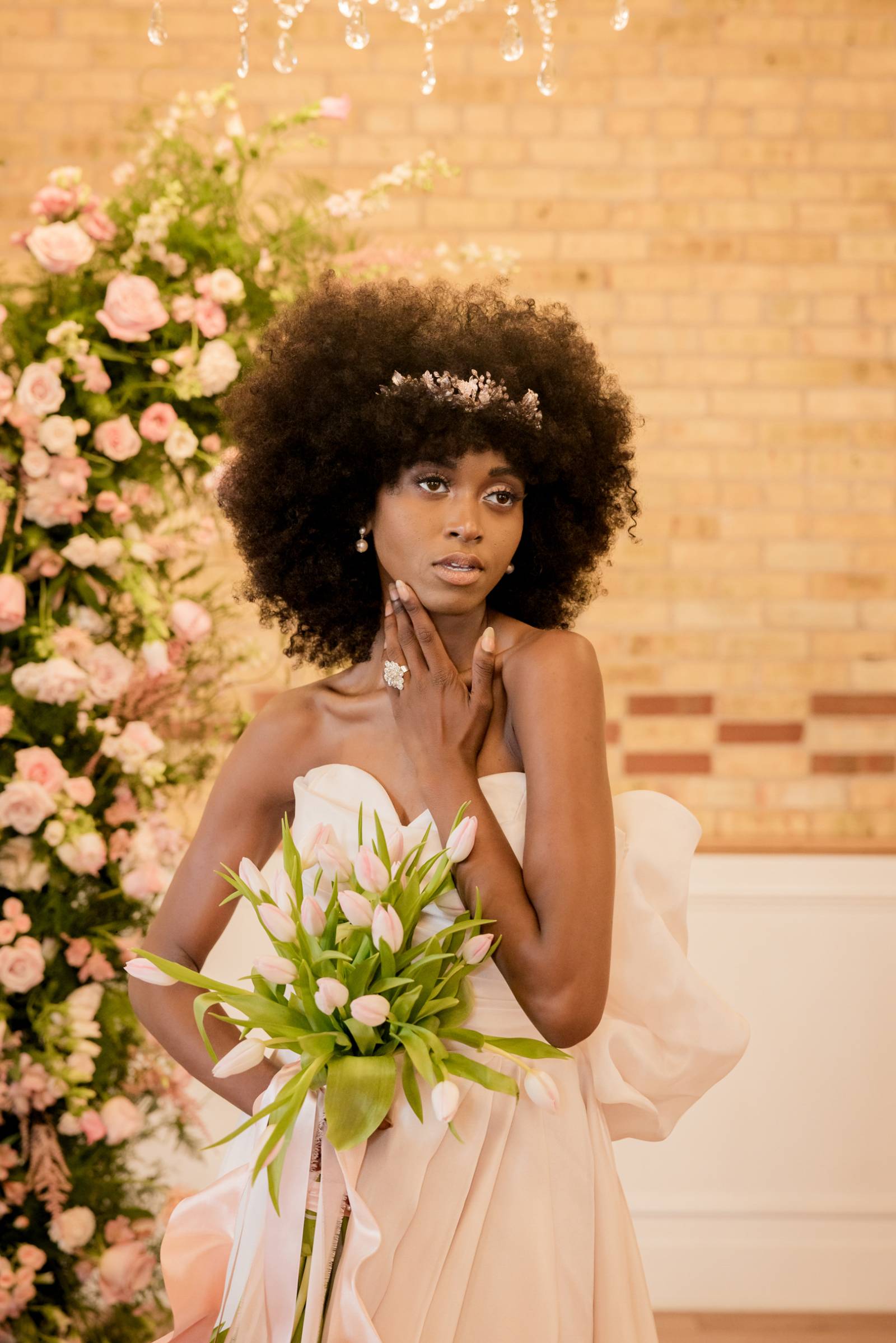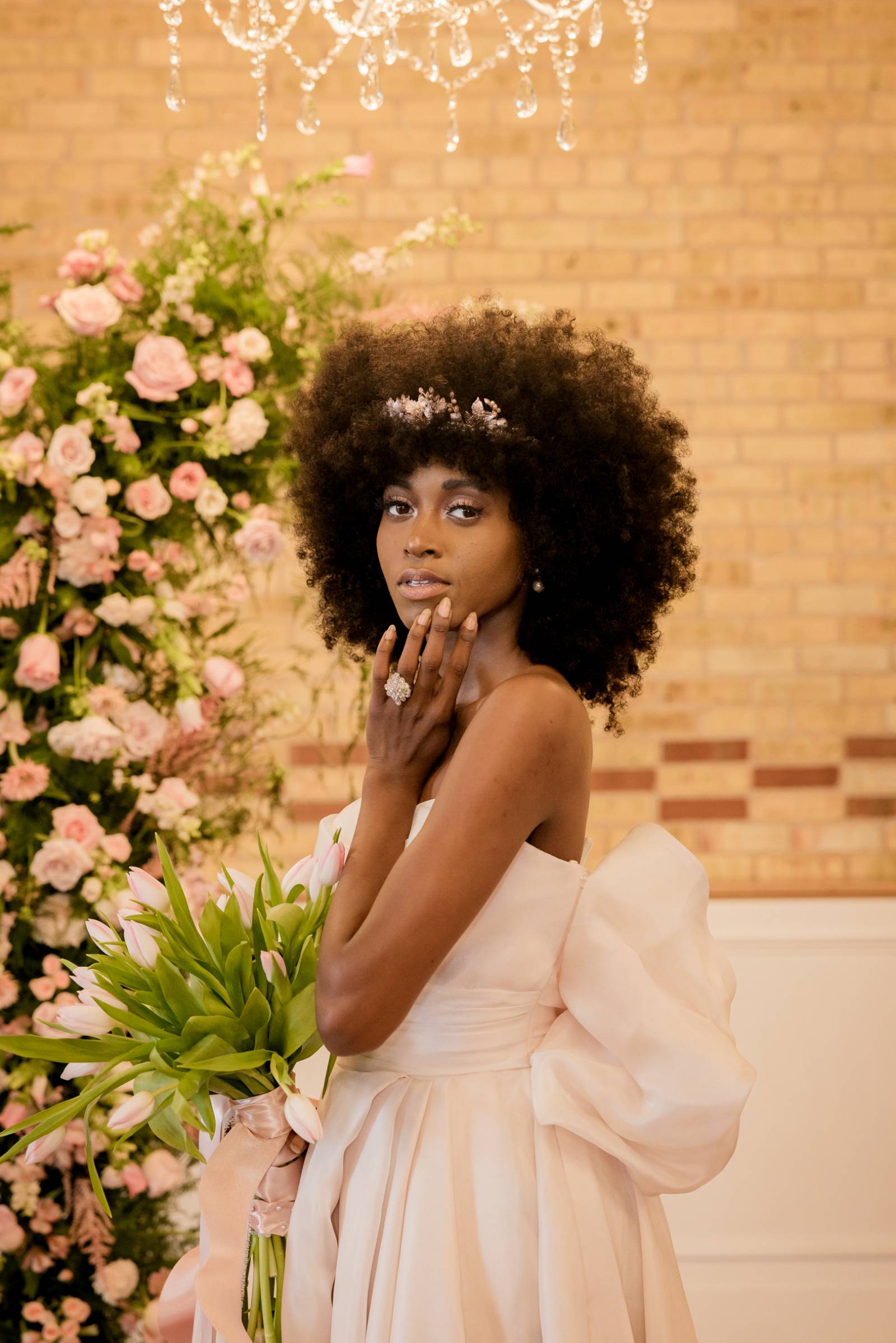 Model Julia wore a soft, subtle blush gown, also from Bon Bon Belle, featuring a sweetheart neckline, oversized bow detailing, and voluminous skirt. The strapless, A-line gown ruched at the waist, accentuating the figure while making a glamorous statement worthy of the Good Witch. Accessories included a shimmering crystal crown, an oversized diamond ring, and pearl earrings.