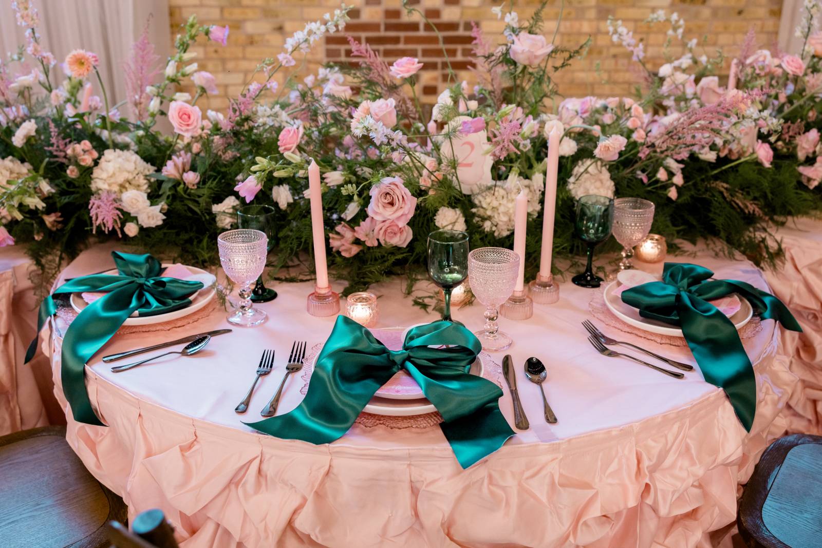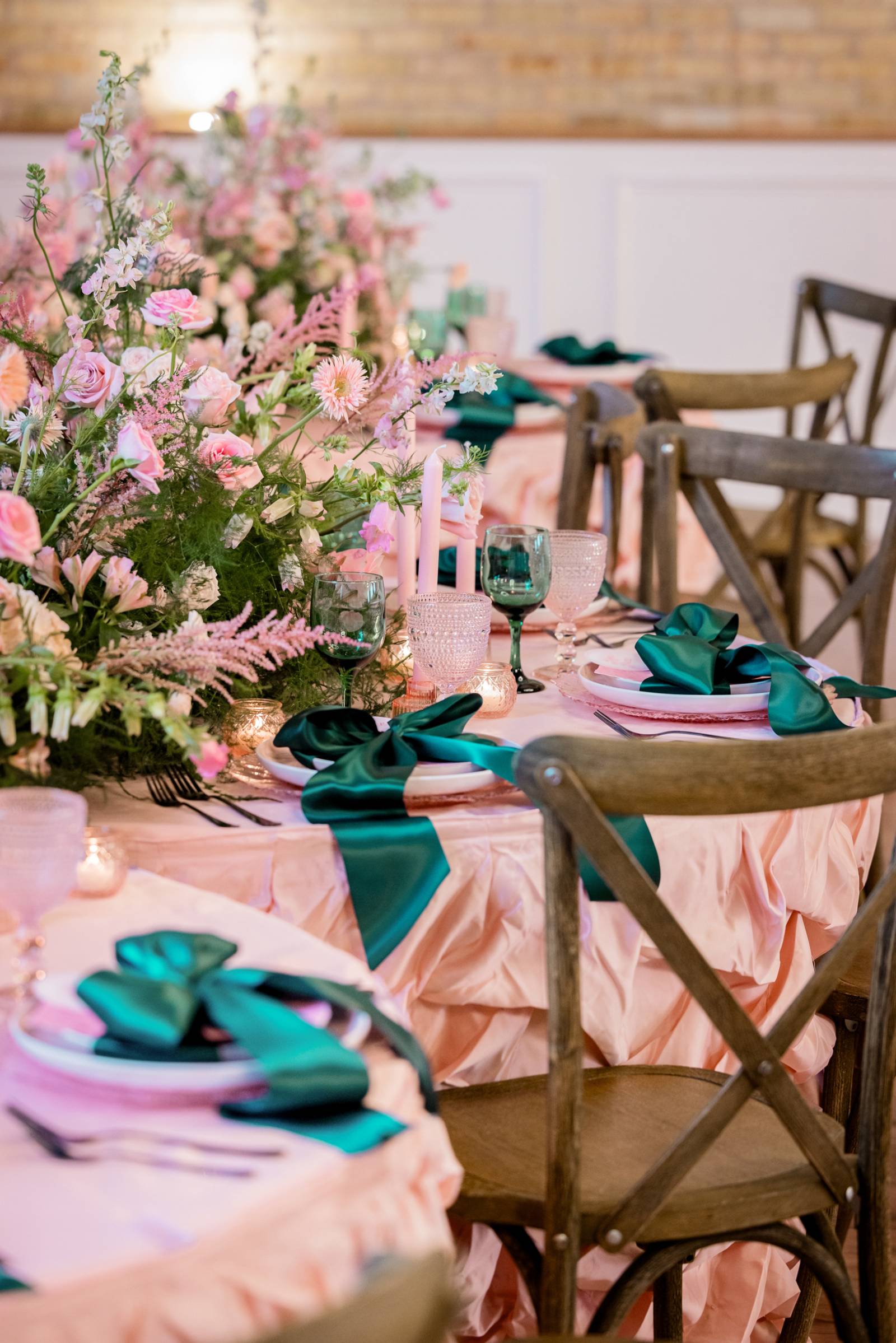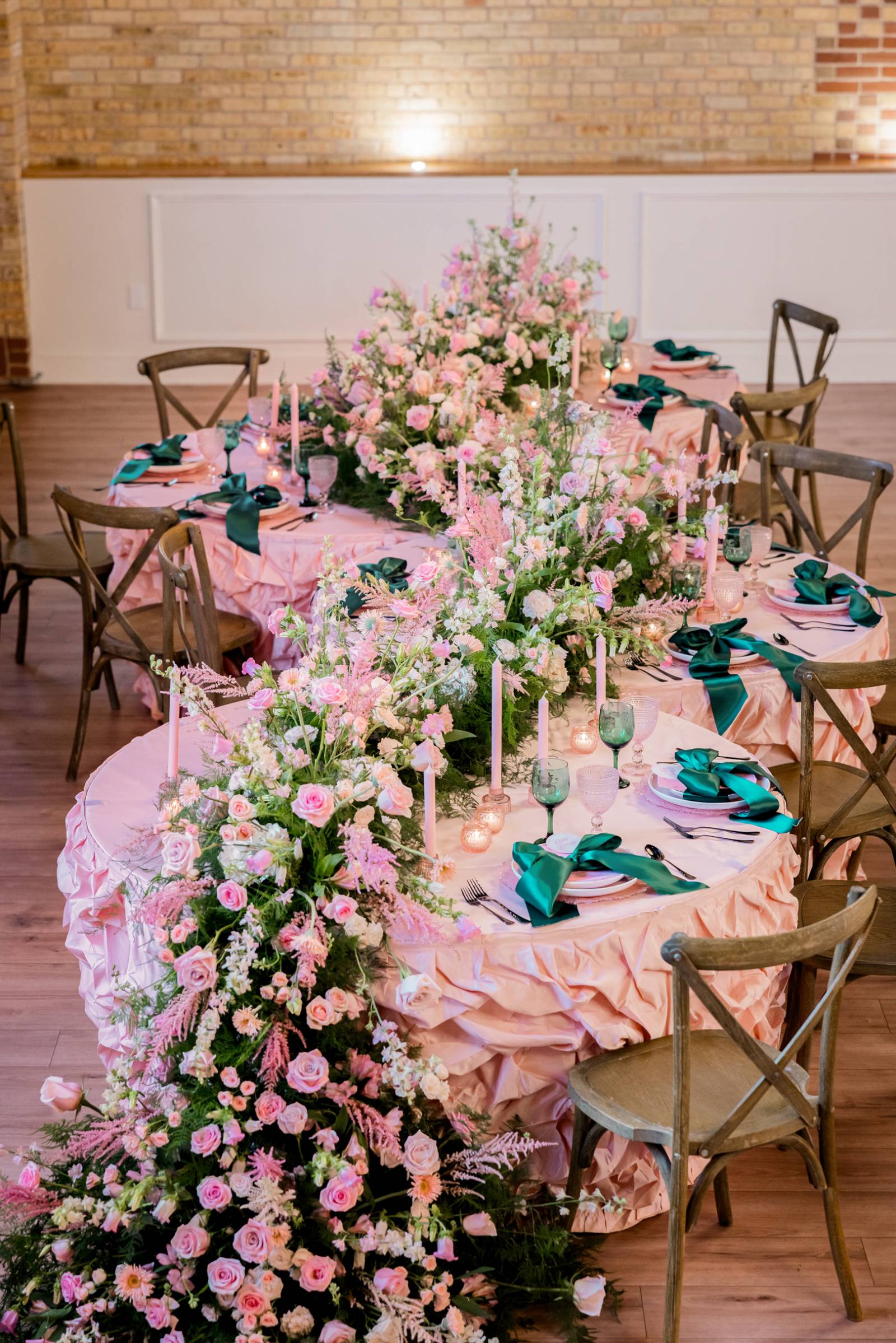 Wavy details continued at the tablescape, featuring more pieces from Melody Rose Decor & Rental. Round tables, draped with ruffled pink tablecloths, were artfully placed together and covered by an oversized floral table runner. Details included a pink glass charger, blush plates, green and pink glassware, candles, and a green bow.