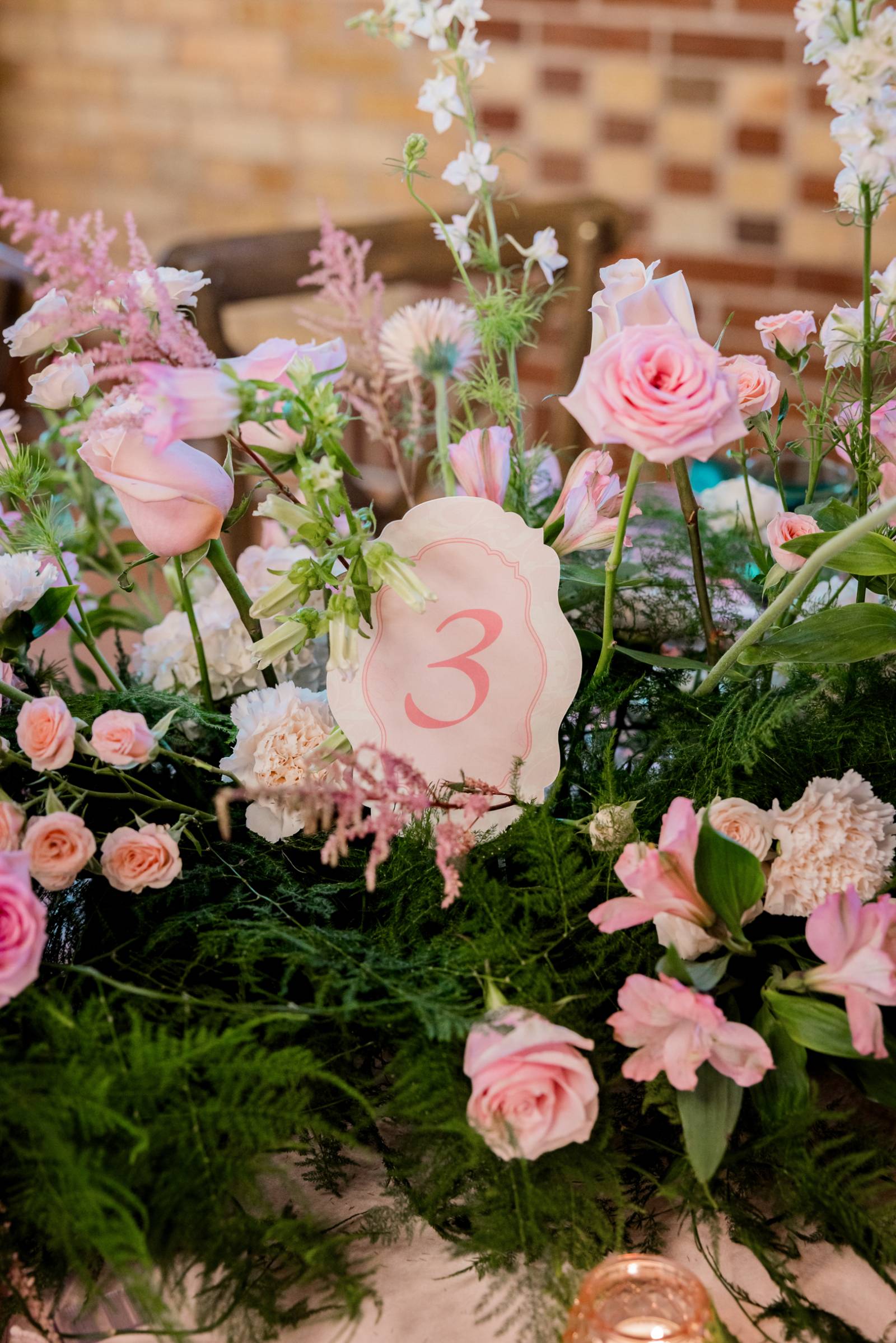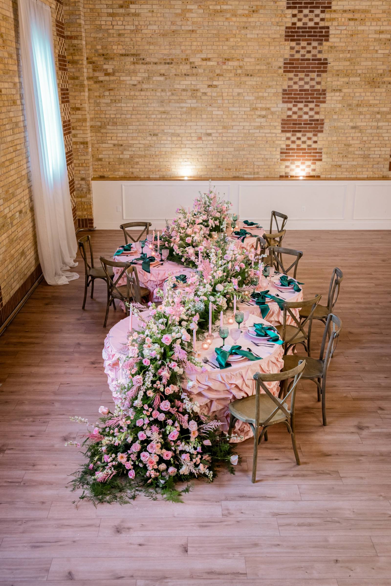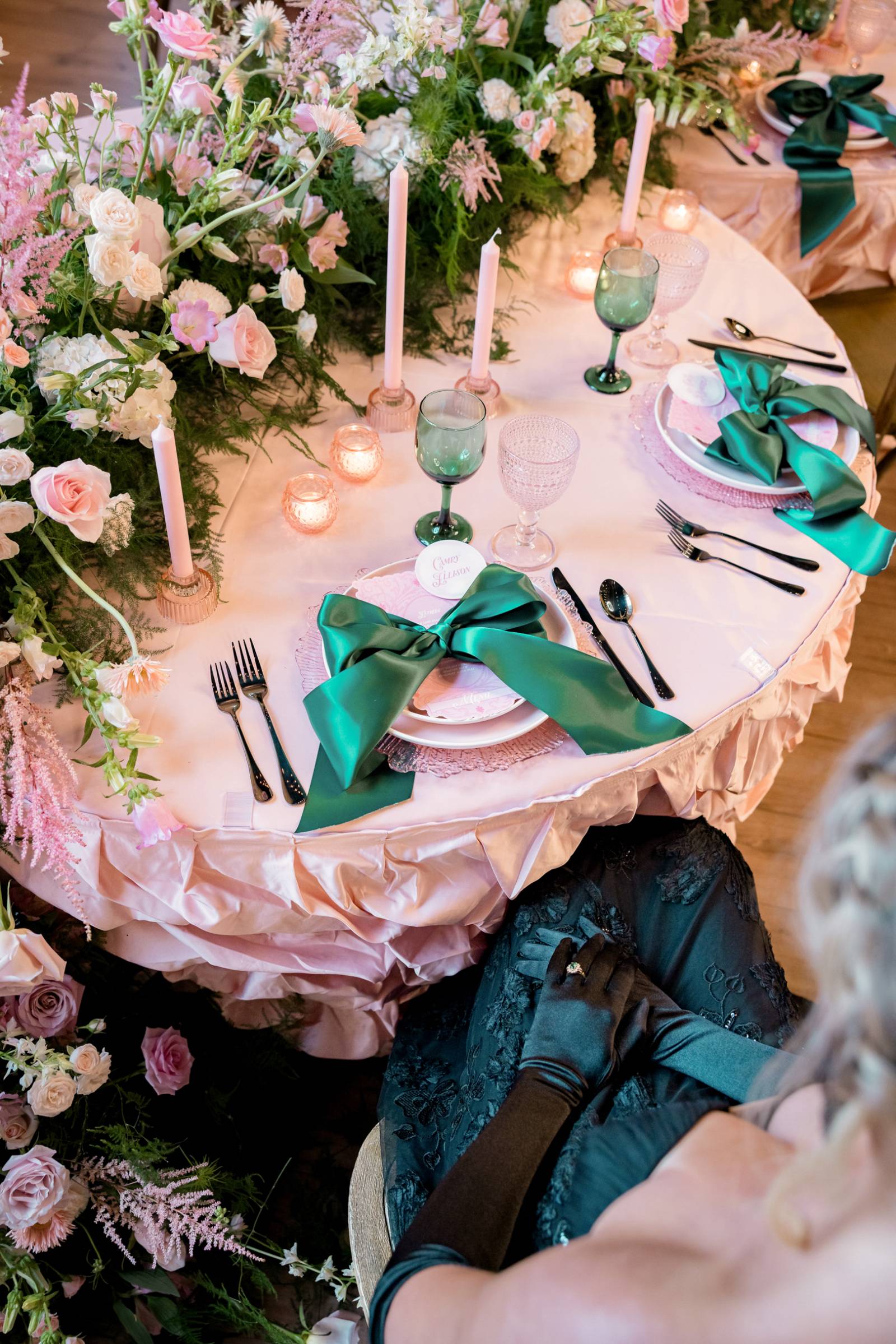 Wavy details continued at the tablescape, featuring more pieces from Melody Rose Decor & Rental. Round tables, draped with ruffled pink tablecloths, were artfully placed together and covered by an oversized floral table runner. Details included a pink glass charger, blush plates, green and pink glassware, candles, and a green bow.