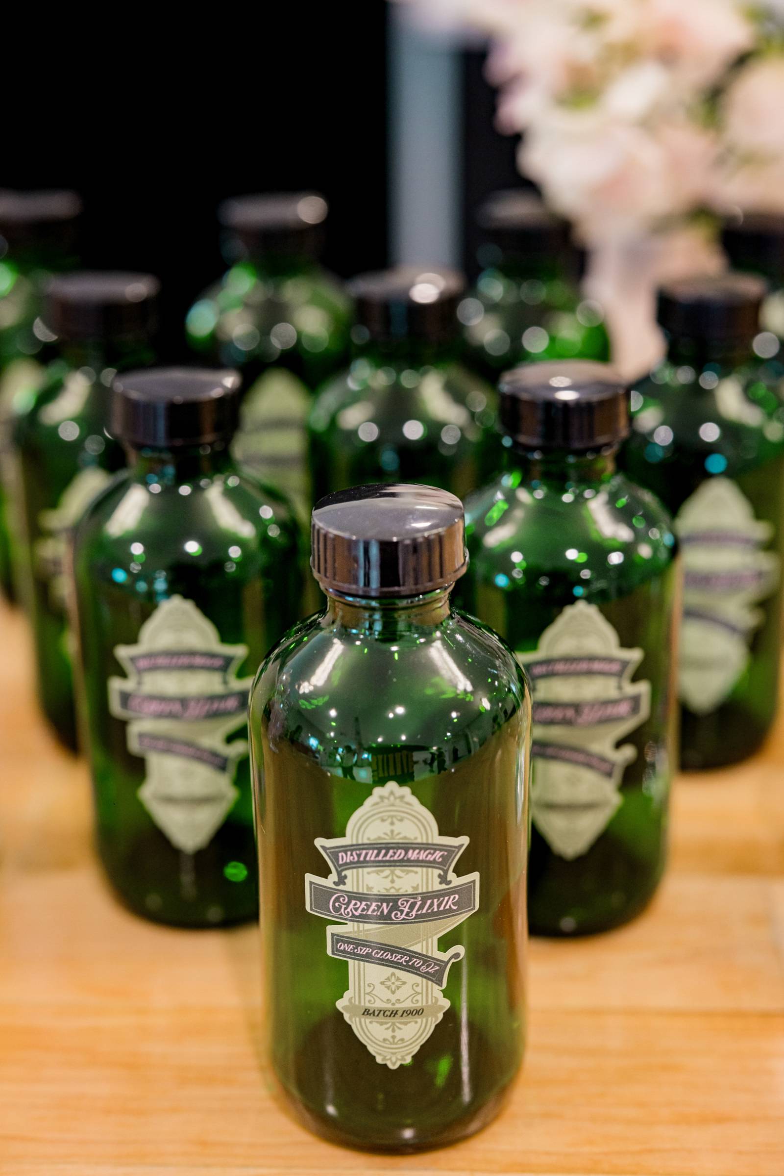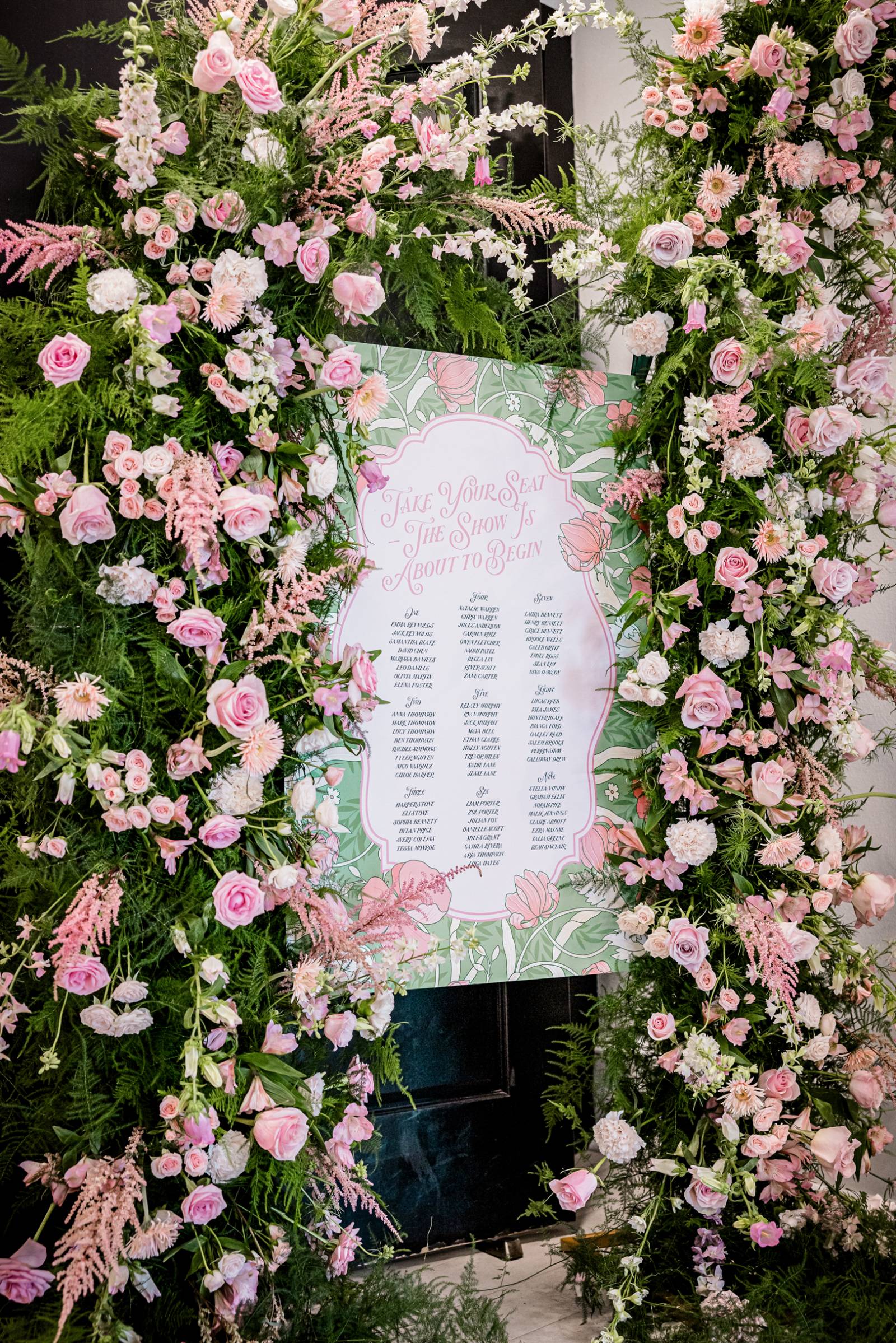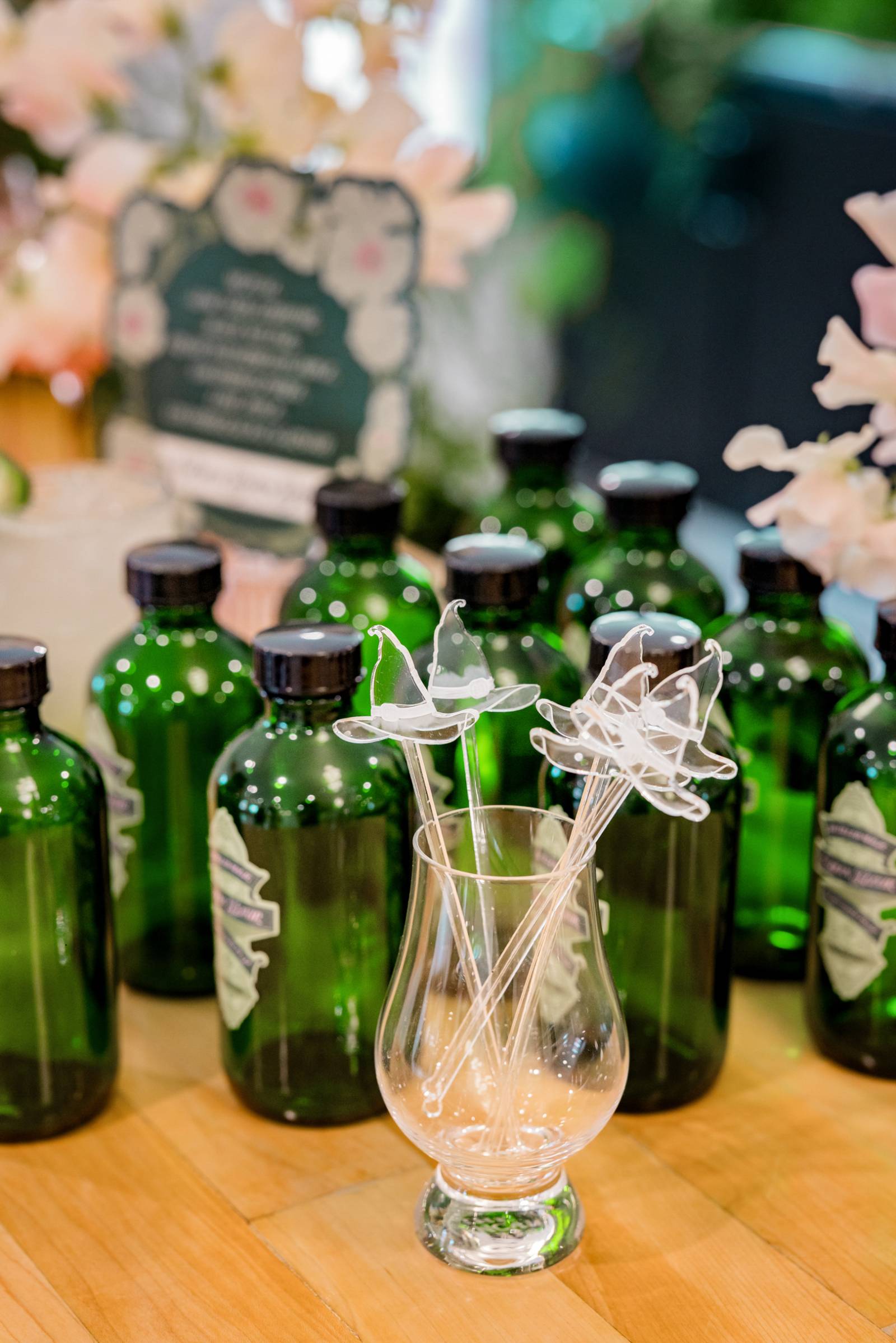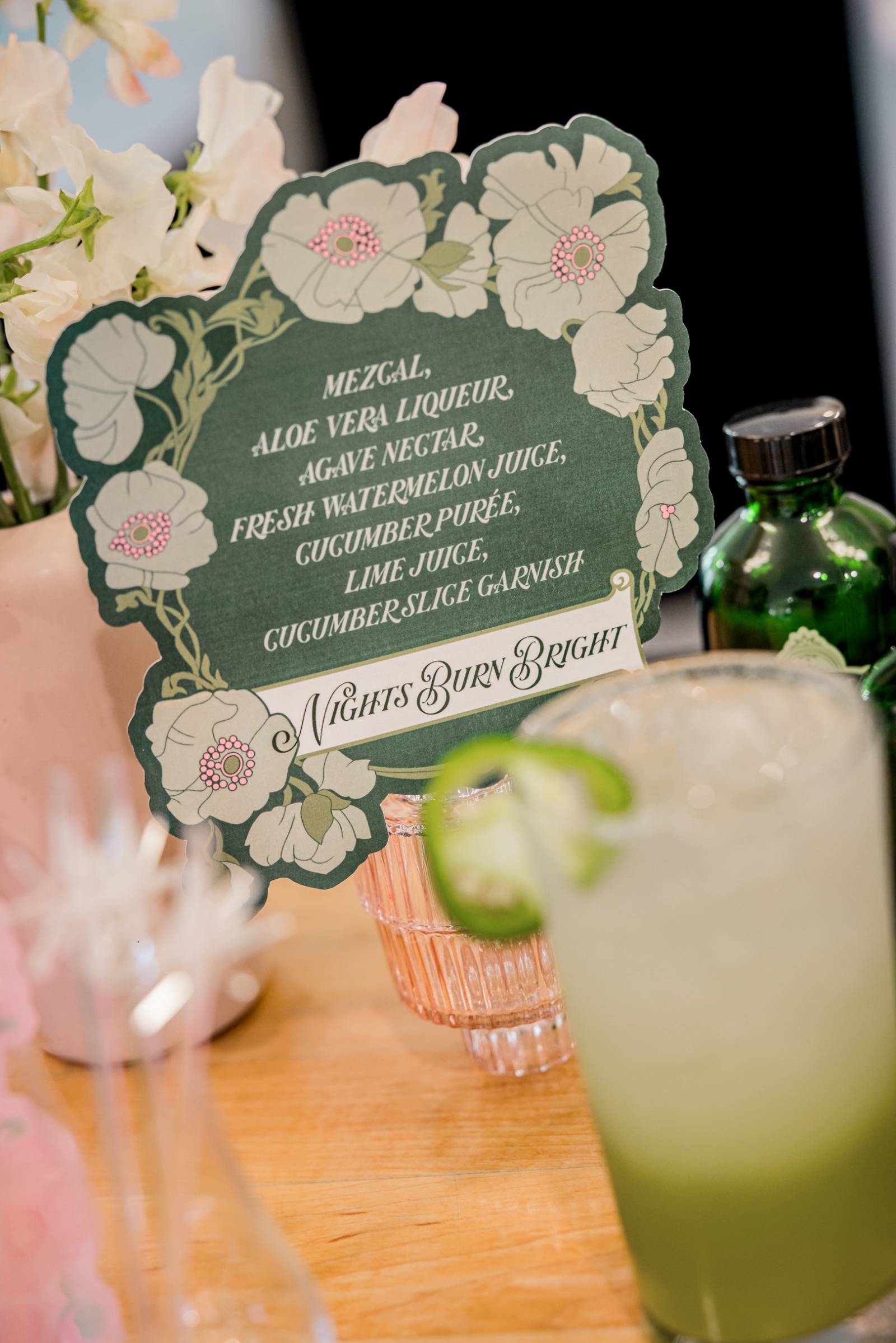 LK Bridal Studio introduced the styled shoot with a colorful, contour-cut invitation and details card. They softened the contrasting pink and green palette with soft hues, cool greens, and a modern storybook font. The invitation also featured a floral pattern frame motif, which was carried into other elements for the day, including the seating chart, signature drink signs, menus, and more. Other design elements included vinyl bottle labels, laser-cut stir sticks, bubble-inspired name cards, and a layered, contour-cut welcome sign.