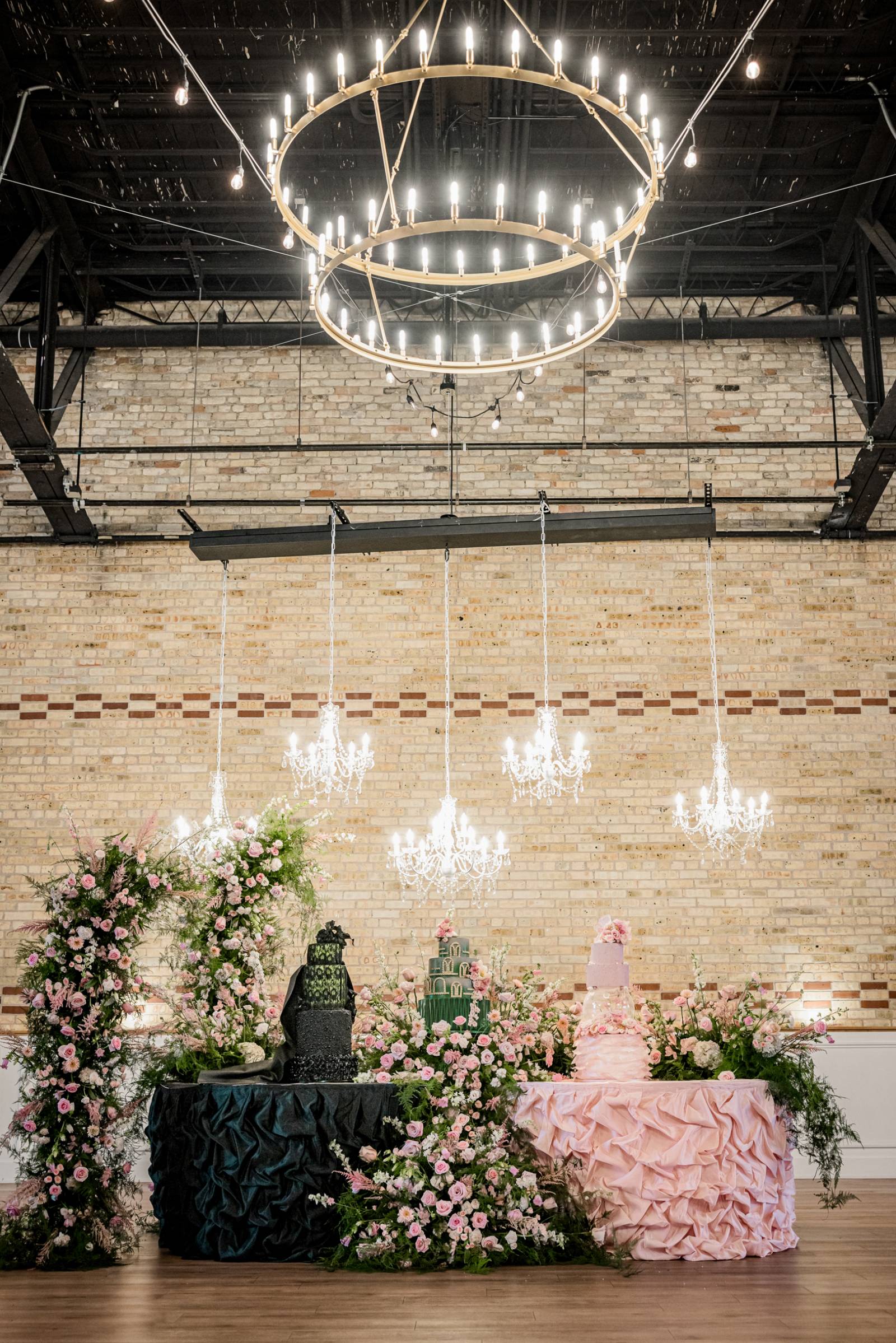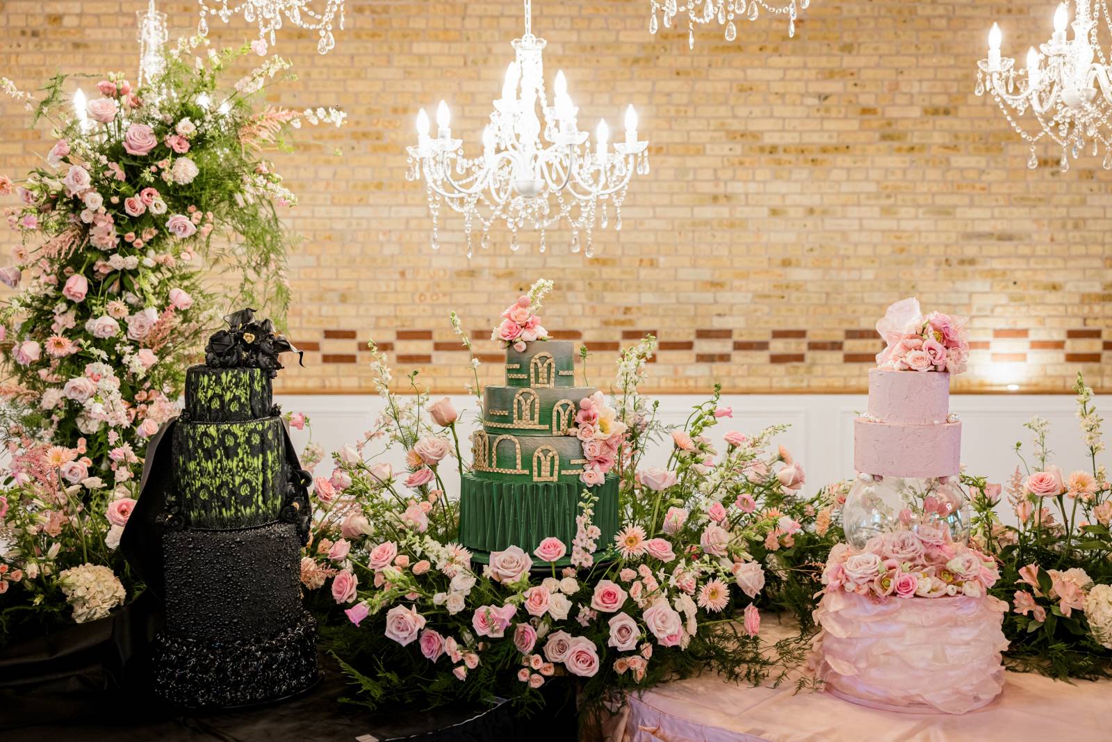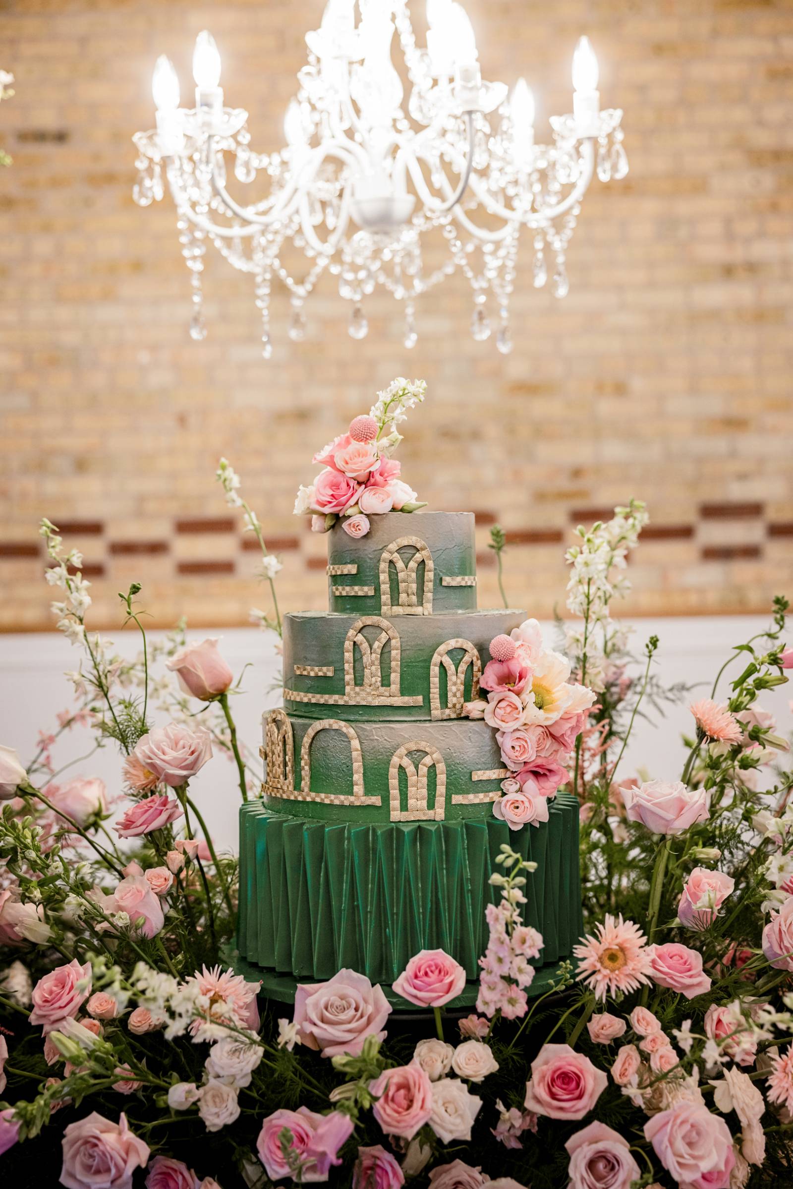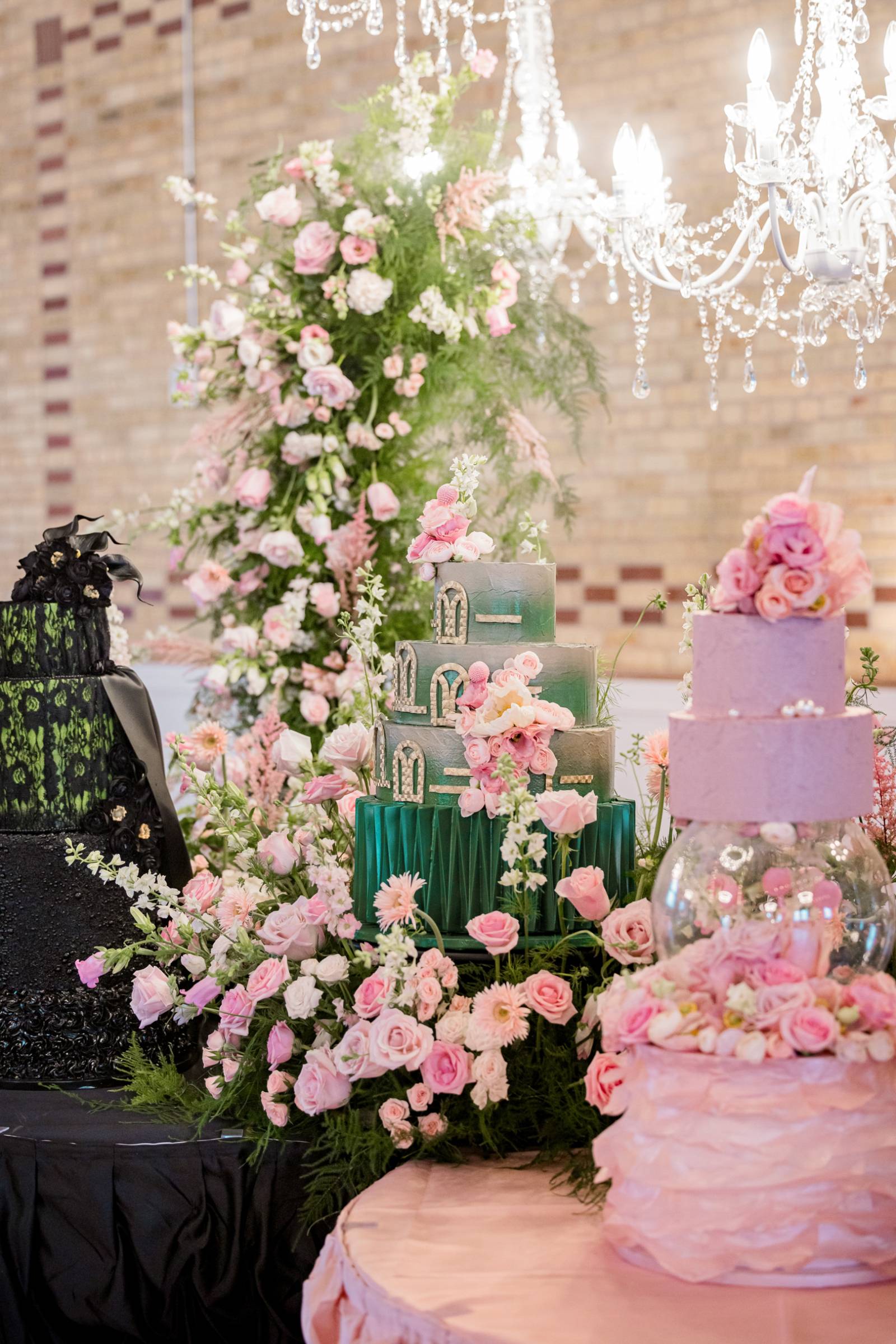 As the name suggests, the Emerald City cake was a masterpiece of green, with pops of gold to artfully represent arched windows and doors. Set atop a green base and soaring acrylic pedestal, this three-tiered cake was completed with asymmetrical pink florals.