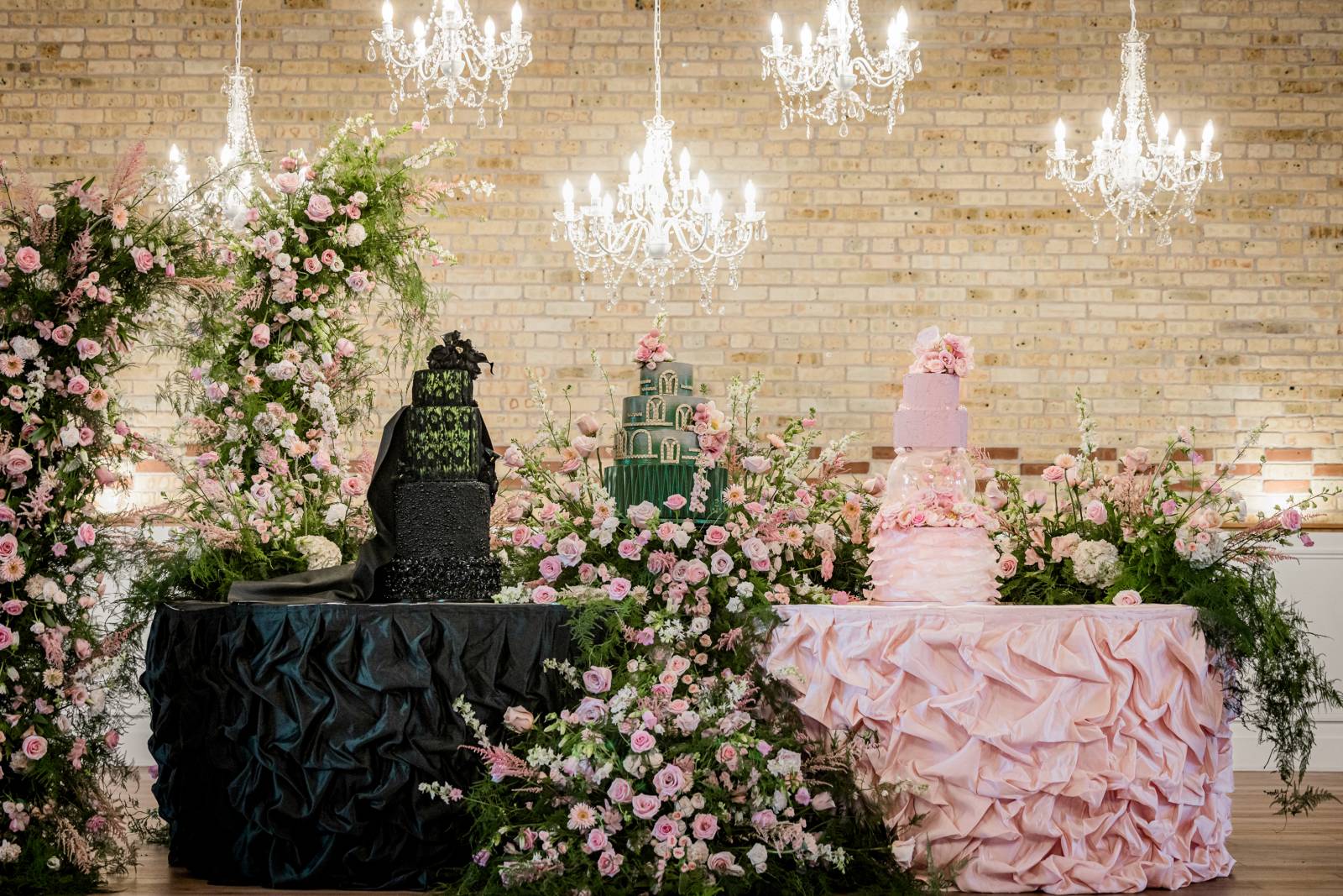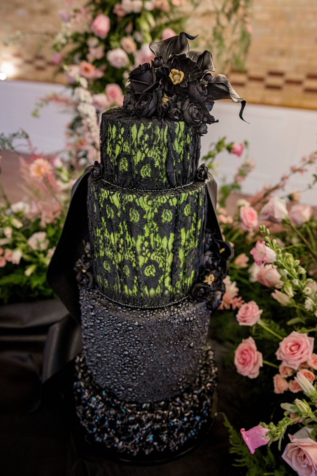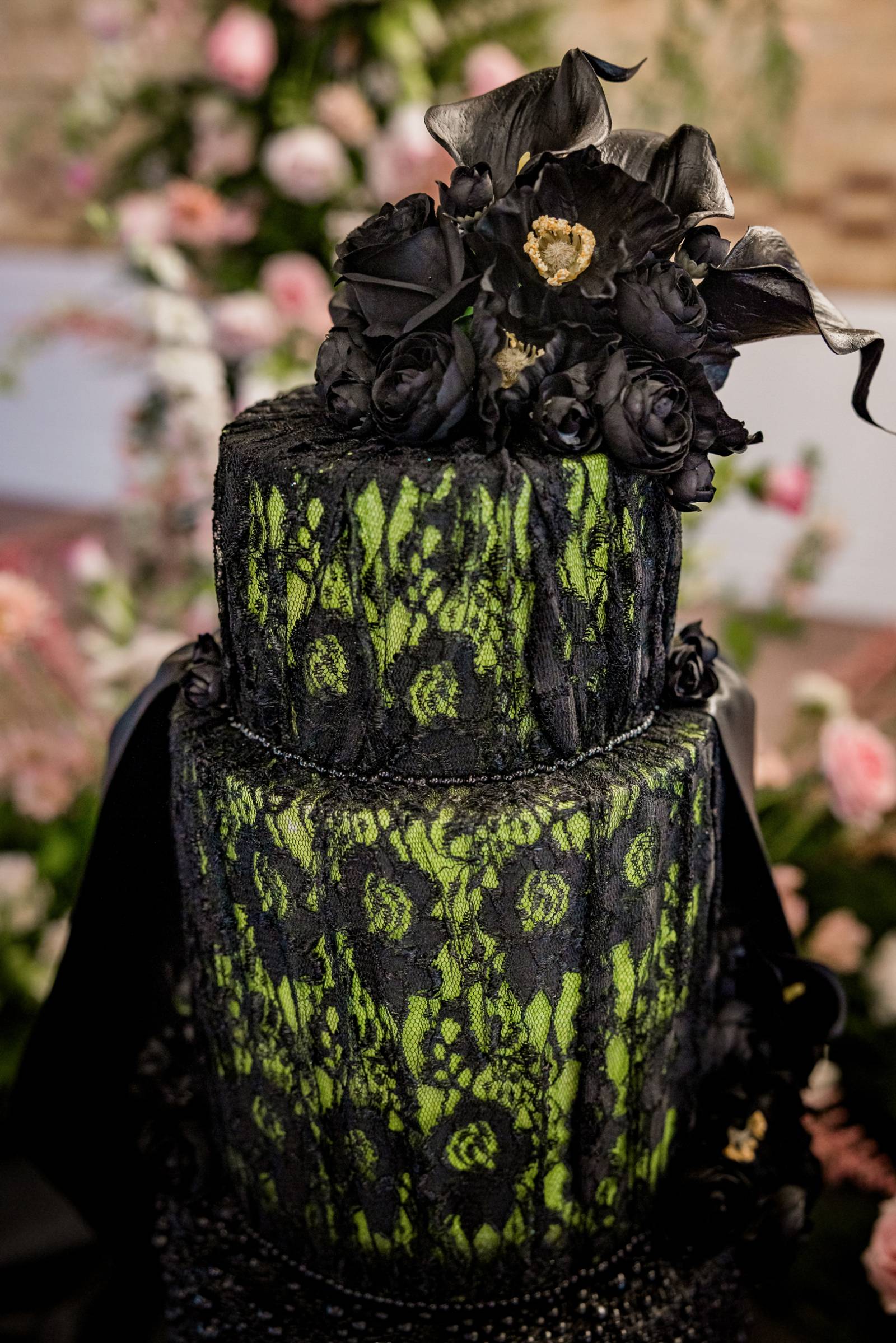 The Elphaba cake combined texture with pops of color, utilizing unique materials like black lace carefully placed around the top two tiers, then secured with draping fabric and topped with dark, sculptural florals.