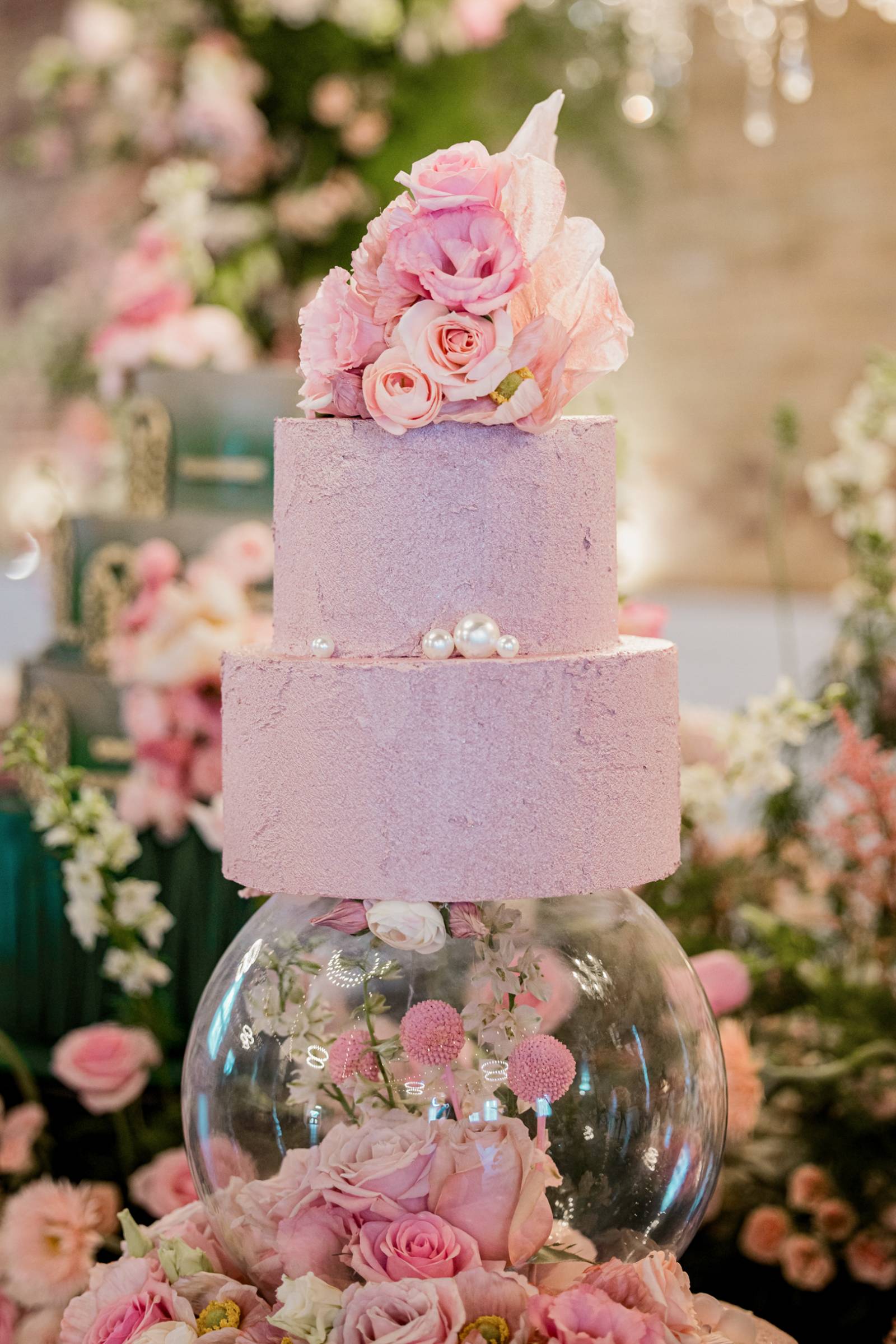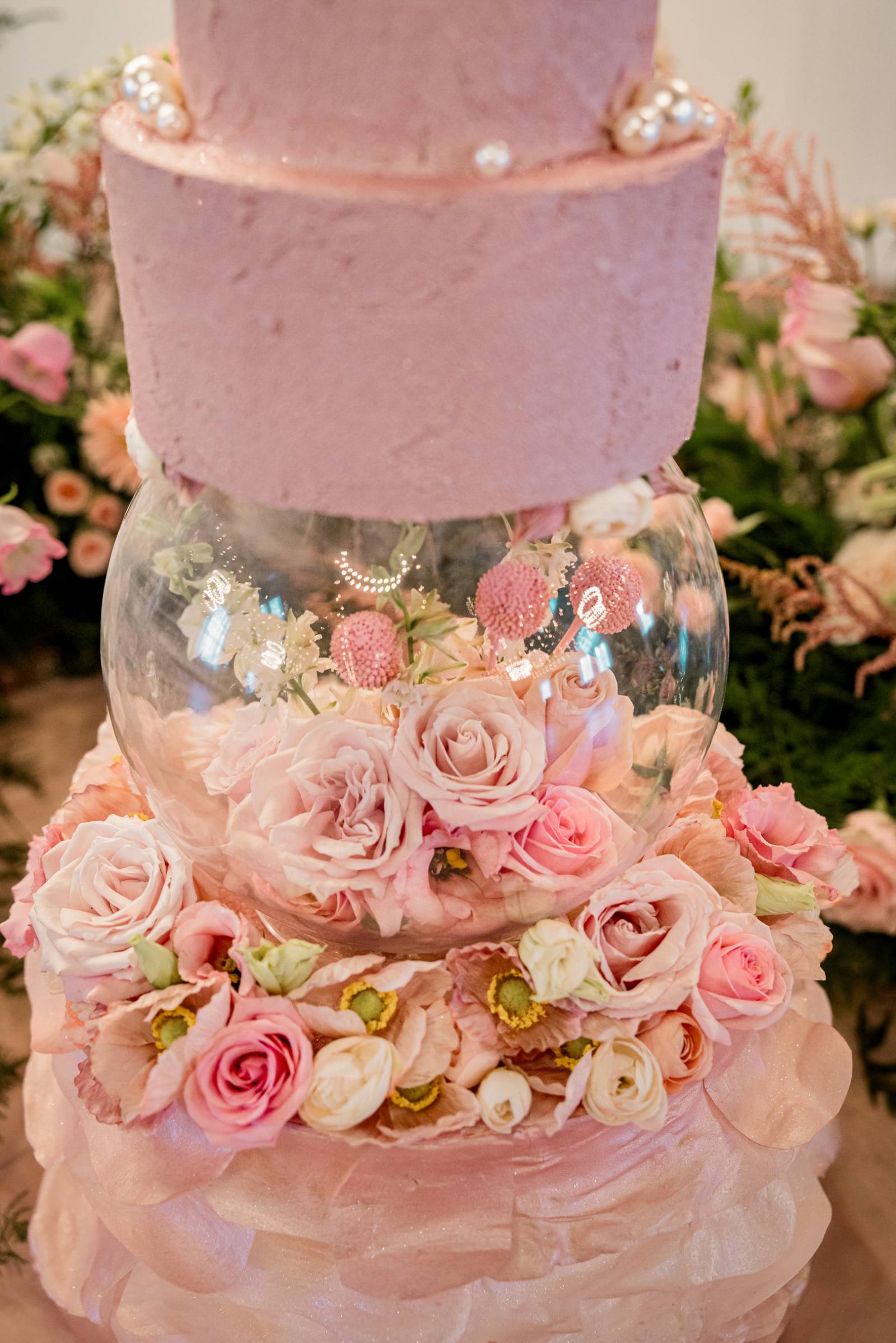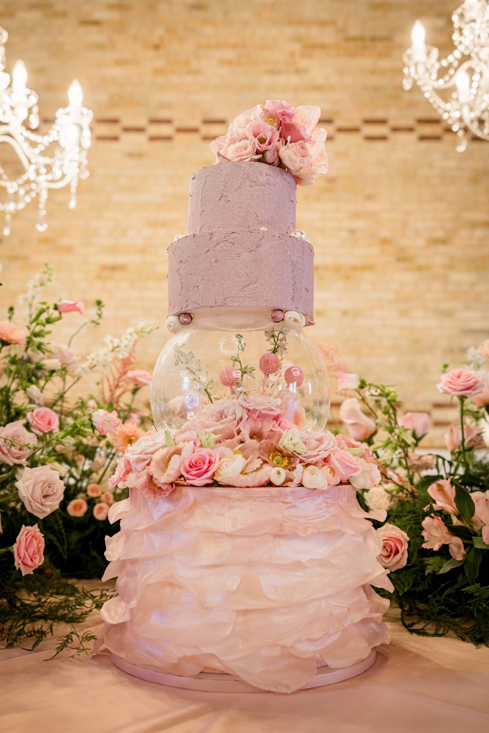 Finally, the Glinda cake also utilized a multi-tier design with a variety of textures and materials. This vision in pink included whimsical elements like ethereal, iridescent pink fabric, a flower tier, and a clear acrylic bubble layer displaying even more blooms. The piece was topped with a two-tiered pink cake with pearl accents and a large floral topper.