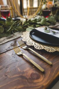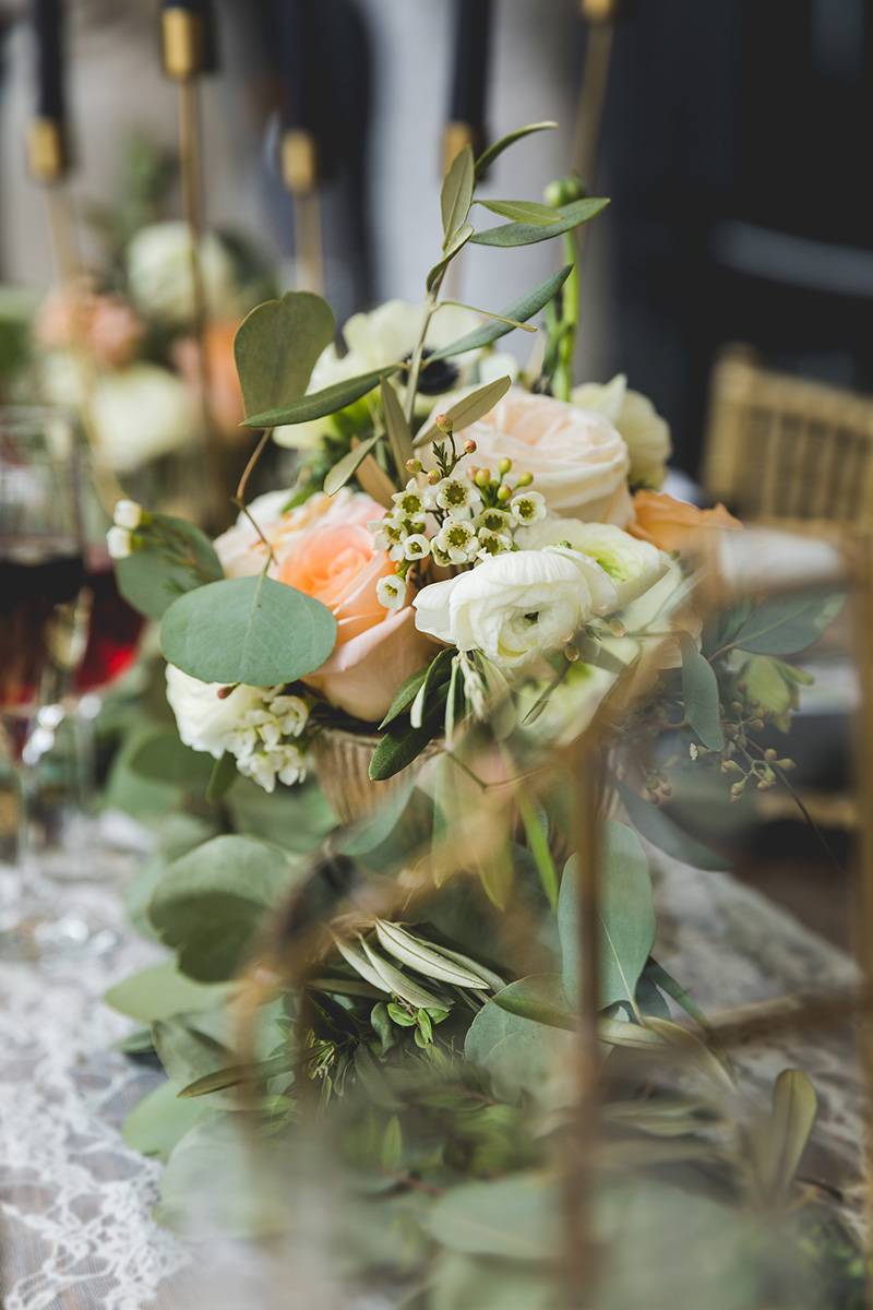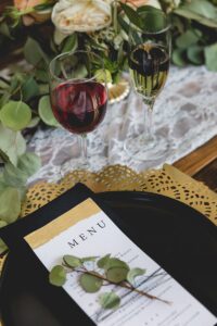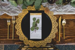 From modern black and gold dinnerware, candle tapers and menus to the rustic beauty of a wood harvest table and romantic florals infused with greenery, this wedding scape inspo has a little bit of everything. The talent behind this design from Pages and Petals is undeniable and we are loving every detail. See more gorgeous imagery from this wedding scape design featured at our Winter Wedding Show captured by The Wedding Flashers below.