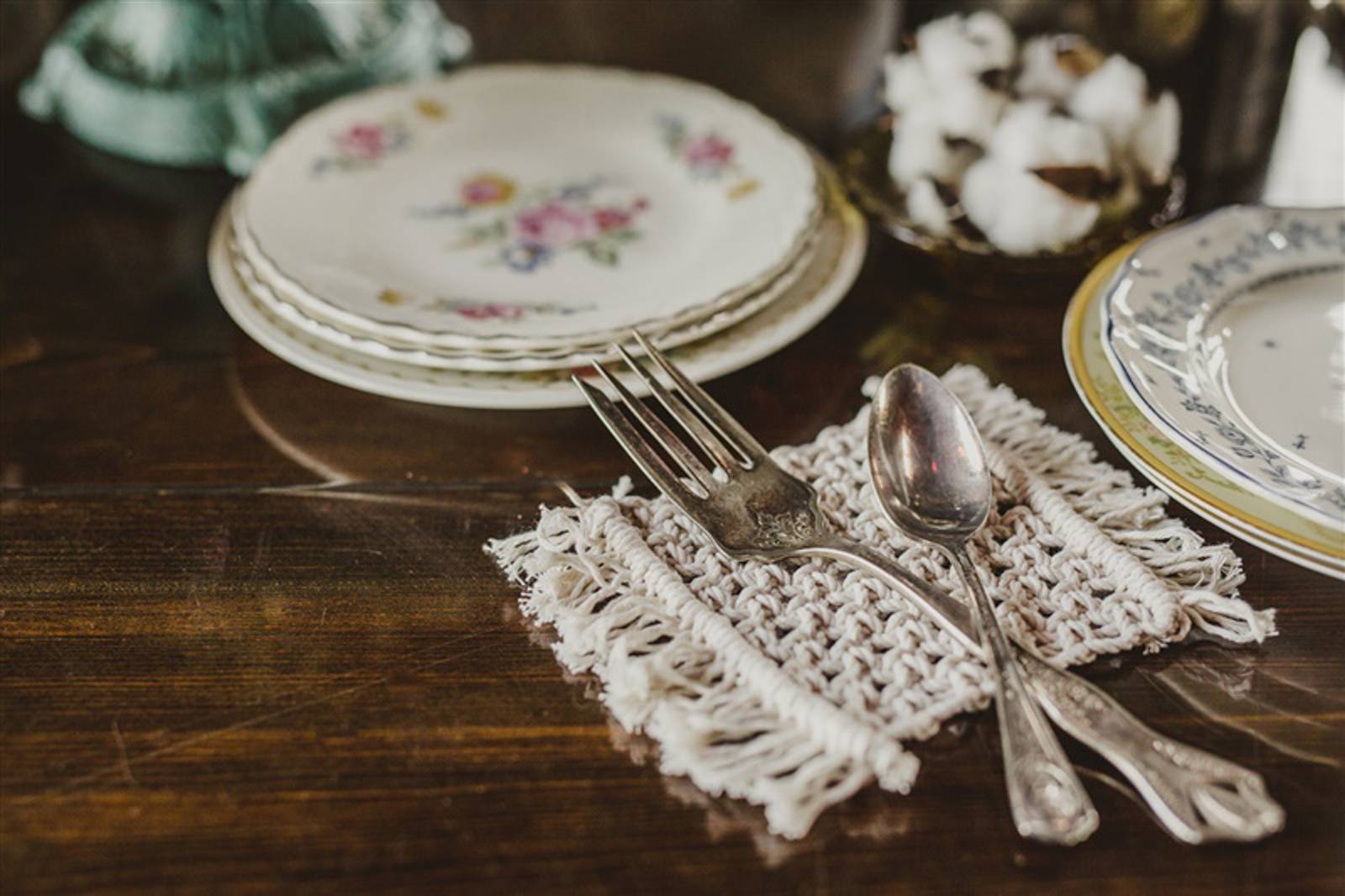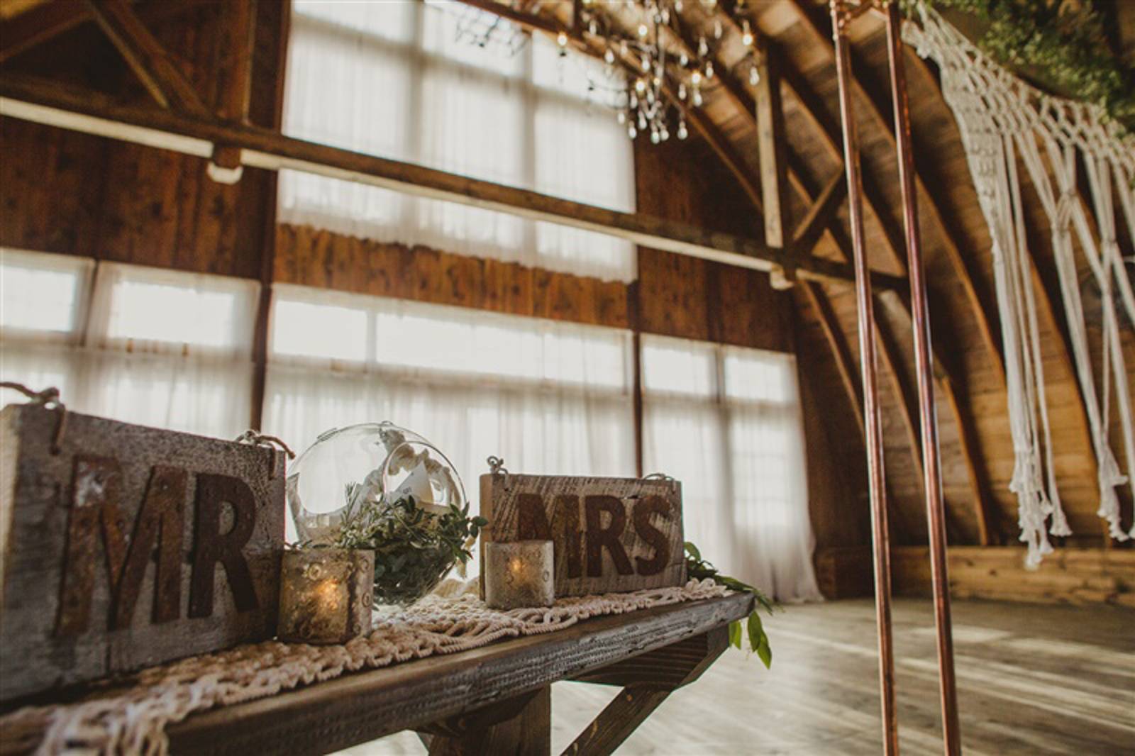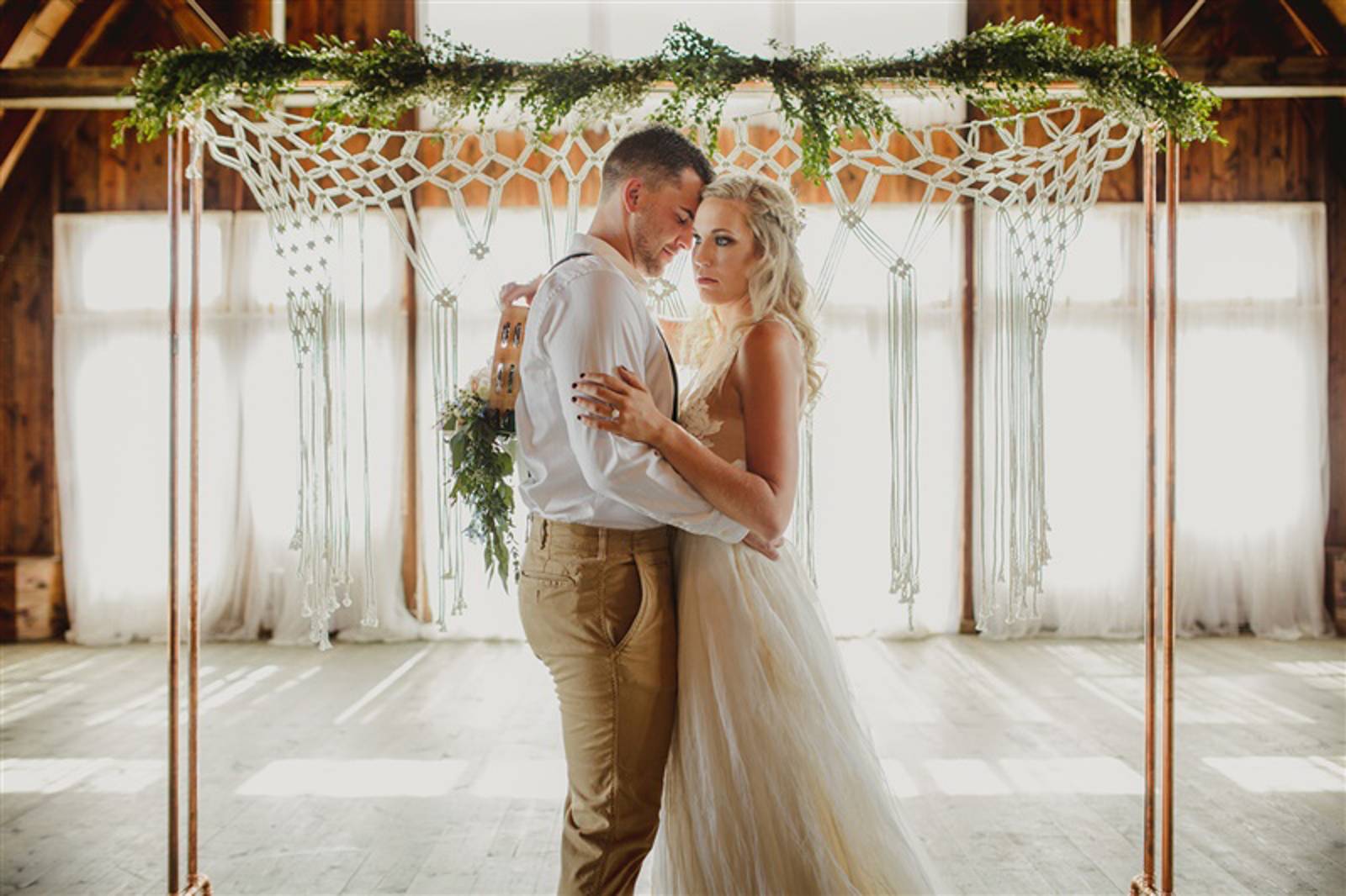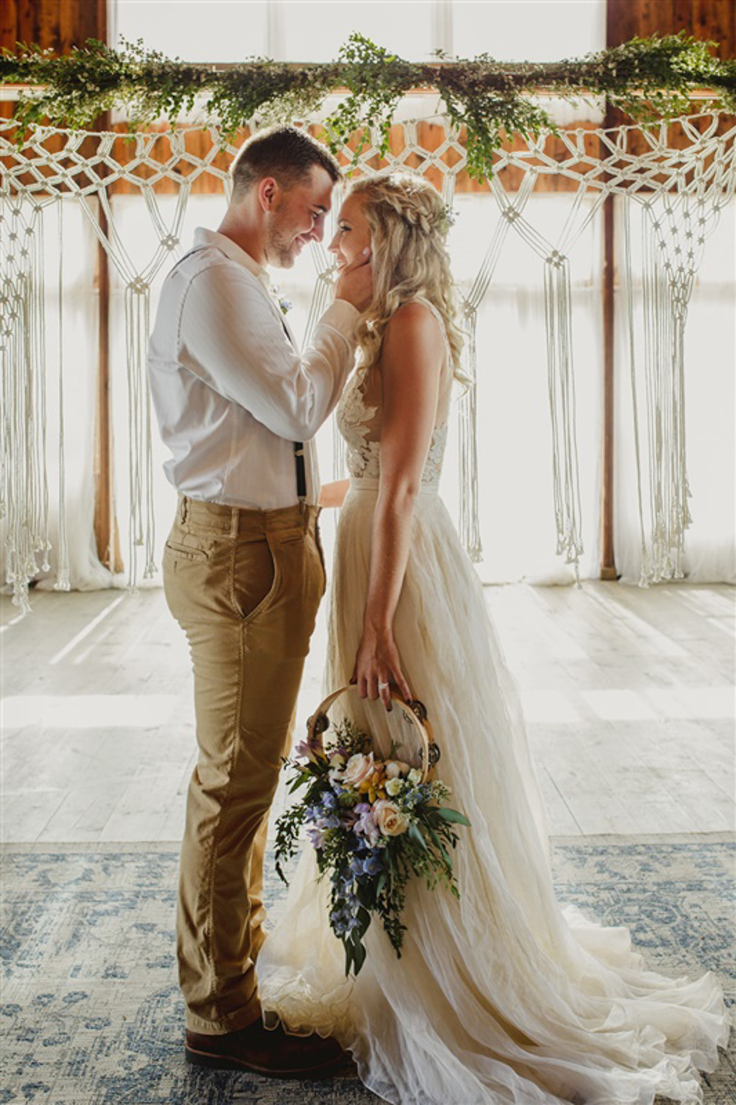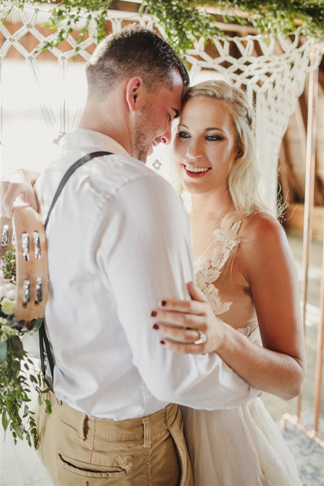 Macramé details, an ethereal gown, and small vintage details inspire an elegant, bohemian affair set in a Wisconsin barn. This styled shoot features a unique take on a floral bouquet, with lush floral accents by Evoke Chancy. Beautiful backdrops, indoor and out, and table placements straight from your grandmother’s china cabinet bring an inviting and intimate feel to this shoot. Be inspired down below!